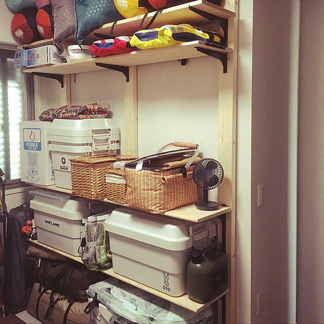 棚には趣味のキャンプ道具に、手芸用品、仕事用品、あとは炊飯器だったり、ドレッサーがわりだったりと色んな物を置いているから、あまり綺麗には見えないけれど使い勝手は悪くないです。