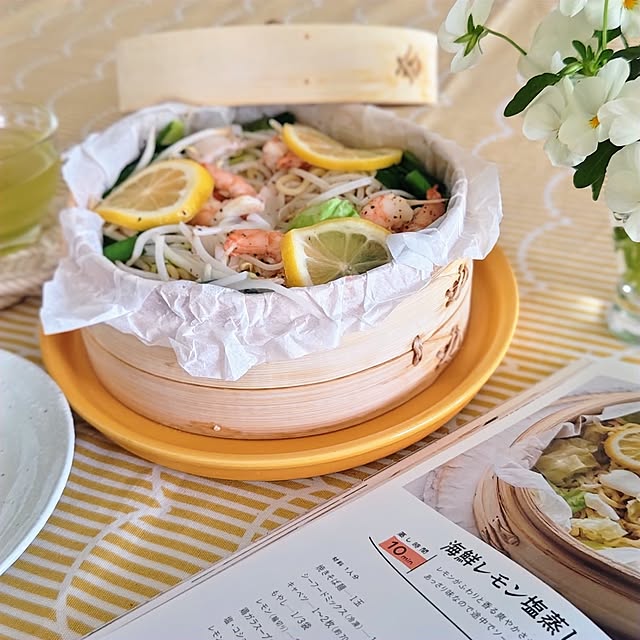 手前の湯呑みには、蒸し野菜のソース3種類が入っています。東京美術倶楽部の骨董市で手に入れた五組物、笹身が乗っている古伊万里皿も東京美術倶楽部の組物の皿。中ぐらいの大きさで重宝します🍽 蒸籠の下に敷いている大皿はD31センチぐらいある古伊万里で、全体に鶴が飛んでいます←目出たい席で使っていたのかな?