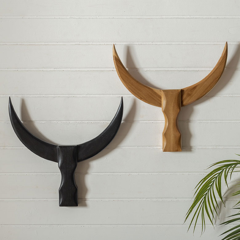 \最大500円OFFクーポン配布中!/力強さと美しさを宿す天然木のバッファローホーン 壁掛けオブジェhttps://item.rakuten.co.jp/zakka-elements/14296¥4,980耐久性と美しい木目で知られるインドネシア産チーク材を使用しバッファローホーンの力強いフォルムを立体的に表現したウォールデコレーション。無垢材ならではの重厚感と、天然木が持つ温かみのある質感が壁面に確かな存在感をもたらします。インドネシアでは古くから、水牛は「力・守護・豊穣」の象徴とされ伝統建築や儀式に欠かせない重要なモチーフ。特にスラウェシ島のトラジャ族の家屋「トンコナン」では正面に水牛の角を飾り、家の力や繁栄を示す象徴として受け継がれてきました。無骨さの中に上質さを感じさせるフォルムはメンズライクなインテリアやヴィンテージスタイルとも好相性。壁に掛けるだけで空間の印象を大きく変え、住まいではもちろんホテル・カフェ・バーなど店舗空間でもフォーカルポイントとして活躍します。存在感のあるウォールデコレーションとして個性ある空間づくりを求める方におすすめの一品です。※商品価格は市場の状況や在庫数などにより変動致します
