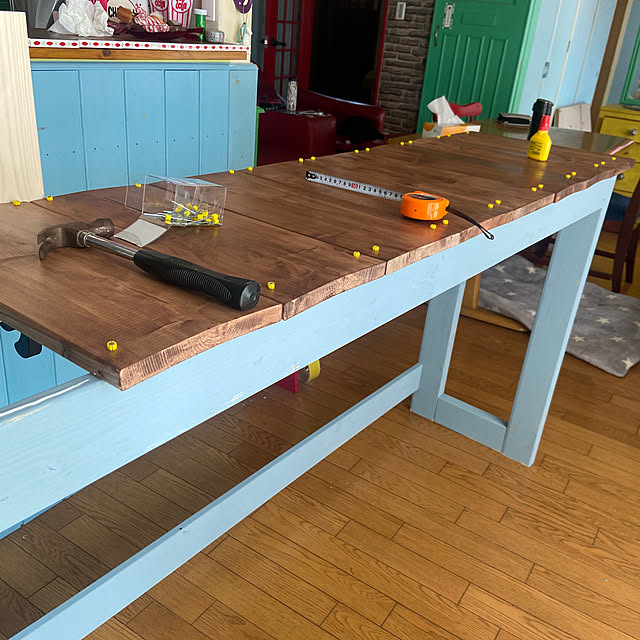 カウンターテーブル何とか完成✨3日掛かりました💦隠し釘がお花みたいで可愛かった🌼途中ドリフみたいにハンマーで親指を打ちました😫道具がなくてだいぶ妥協したところがあるけど、あとは椅子だな〜