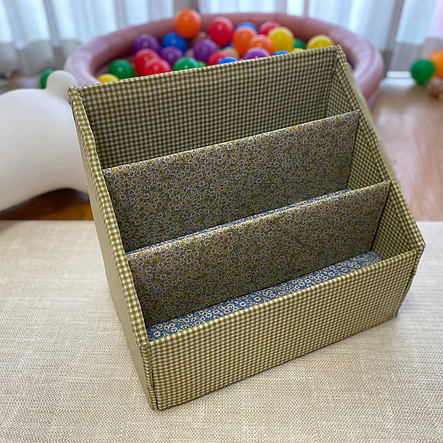 [イベント参加します]実家によく遊びに行くのですが、実家に置いておく用の子ども用品を買うのがもったいないので手作りしました。1枚目:牛乳パックと余り布で作った子ども椅子2、3枚目: 牛乳パックとダンボールと余り布で作った本棚