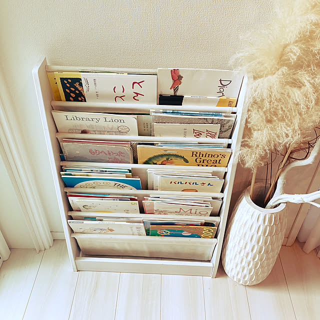 ダイニングにあるお気に入りの絵本棚📚奥行き13cmほどでとても薄いので我が家の狭いダイニングでも邪魔にならず優秀✨こどものともで定期購読した本、洋書のペーパーバック本などの薄い絵本を収納しています。表紙の絵が見えるので子どもたちも自然に本を手に取ってくれるところが🫶 絵本のイラストってかわいくて好き❤️子供たちは成長し、さすがに上2人はなかなか絵本を読まなくなったけど、今は小3末っ子娘がまだ愛用中😊思い出いっぱいの大好きな本たち、子供たちが巣立ってもこのままにしようと思っています💕こんなにスリムな絵本ラックなのに、数えたら80冊も入っていてびっくり🫢