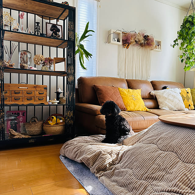 キッチンカウンターから眺めるリビングダイニング!大好きなグリーンと愛犬にも癒されています!