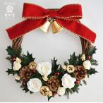 クリスマスリース プリザーブドフラワー 白いバラ 赤いリボンとベル 玄関ドア ヒイラギの葉に松ぼっくり 誕生日 開店祝 引越し祝
