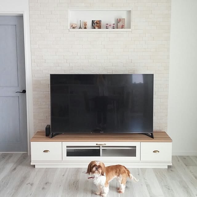 イベント参加 テレビボード わが家は壁掛けテレビにテレビボードを置いて壁の裏で通線しています レコーダーとスイッチがテレビボードに入っていて壁の中をHDMIケーブルが通ってテレビへ テレビボードは置き型なので掃除も楽々🧹