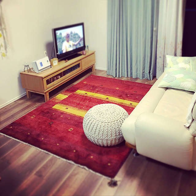 ギャッベ…家具選びをしていた時に、初めて存在を知りました。イランなどの遊牧民が、時間をかけて手織りしているとのこと。地元では、土の上に直に置いて暮らしているとか…。織り込まれた模様には、家庭円満や健康など、様々な幸せにつながる意味が込められているそうです。毛足が長く、直に座ったり寝転んだりしてもふかふか。猫が爪研ぎして引っ掻いてもビクともしません。リビングに敷き、ここで家族団欒の時間を過ごしています。猫たちもくつろいでいる姿をよく見せてくれます😊