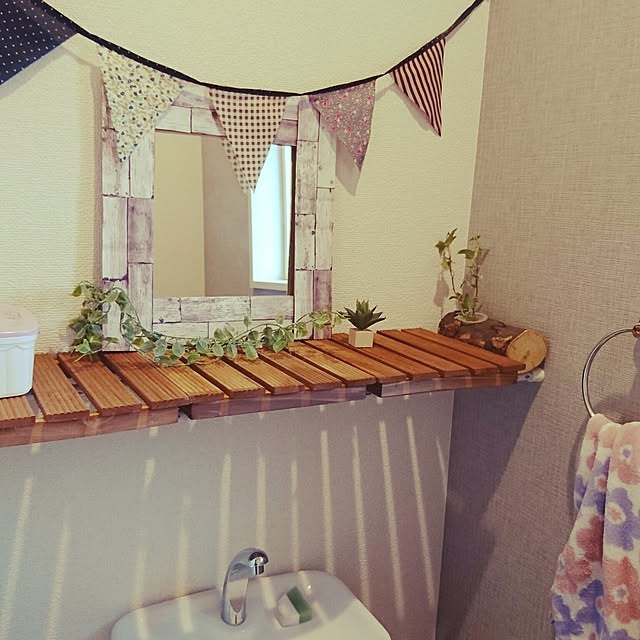 トイレットペーパーのストックを置く場所がなかったので、ダイソーの突っ張り棒×2本と木の板で棚を作りました。小物類はほぼセリアです。