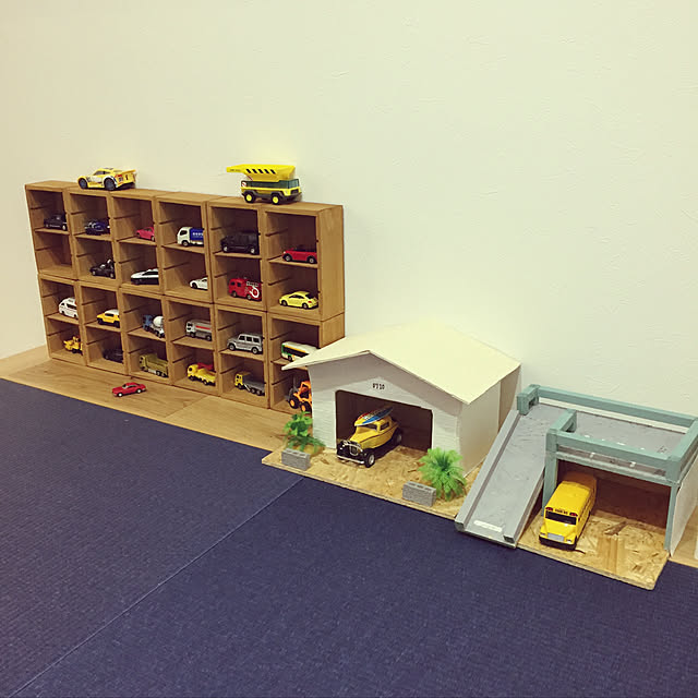トミカの駐車場アイデアを拝見して真似っこして作ってみました(^^)いざ、作ろうと思うと、道路ってどんなんだっけ?と外に出て観察しました(^o^)信号機と標識はセットの市販品です✨