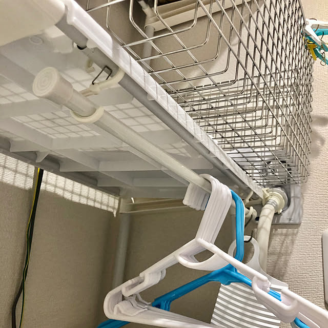 突っ張り棒タイプのお風呂ラック場所も取らず、収納力も抜群な優秀さんです!S字フックも付属のため、手洗い用の洗濯桶をぶら下げています♩