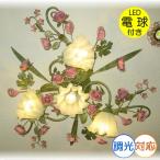 メインの照明は貼り付け(?)シャンデリア。天井が低いので、普通のシャンデリアは諦めました。薔薇のシャンデリアで、今では結構気に入っています。