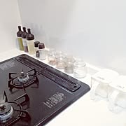 オイルポットとガラスキャニスターをメインに、シンプルなラベルで統一 \(* ¨̮ *)/