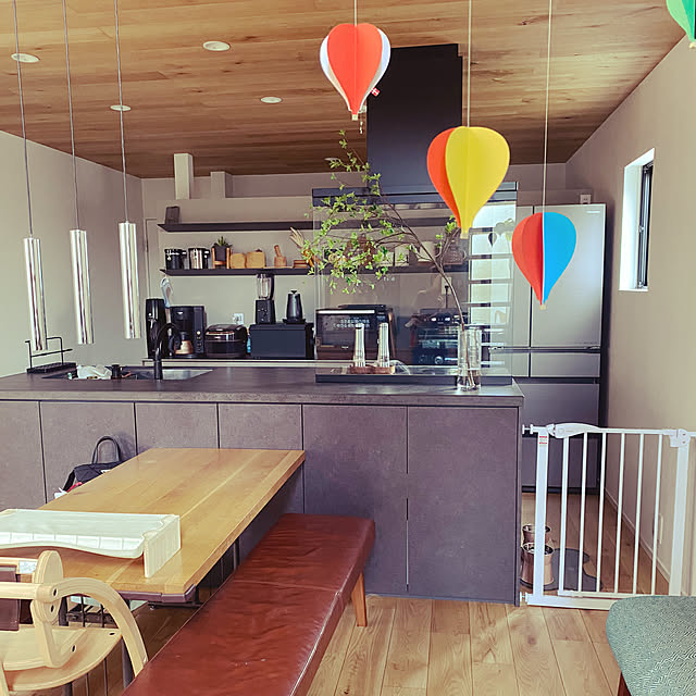キッチンは最も悩みまくったエリアと言っても過言ではないかも。 まずタイプ?をどうするかでかなり迷いました。 アイランド?ペニンシュラ?デュエ?…どれも一長一短で、最終的にはアイランドで決着。 通路幅を確保するため、ダイニングテーブルは幅130cmのものに。これも本当は150cmは欲しかったけど、アイランドにした時点で諦めるしかなく、かと言って120cmだとやっぱり手狭で、間をとったのが130cmでした。 背面のカップボードは造作で作ってもらい、あたかも抜けているかのように見えるのは奥に壁紙を貼っているから。これは大工さんのこだわりみたいでした。(その方が広く感じるのだそう) そうすることで強度と見た目を両立できるようです。 造作なので幅や高さは自由に選べたのですが、私の身長が156cmでキッチン高を86cmにしたので、使い勝手と見た目とでカップボードも高さは86cmに。結果、作業がしやすいです。 棚を作ることとそこに配置するものを事前に洗い出し、それに合わせてコンセントを配置したので、配線もスッキリしています。 後悔ポイントはスポットライトの位置💦 ハウスメーカー側にも棚が造作で入る旨は伝えていたものの、後付けの棚幅を考慮してもらうのを忘れて、ちょっと最上段の棚にライトが近過ぎるな、とは思ったものの、許せないレベルではないので一旦そのままで様子見しています。