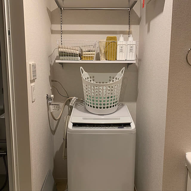 子供の洗濯物ダイソーのピンクのカゴ…仕分けて、畳むところまでは母が。左のハンガーかけTシャツ…Tシャツ等シワになってほしくないものは、シーズン中はかける収納にしています(^^)クローゼットへは各自で片付けるルール(^^)v
