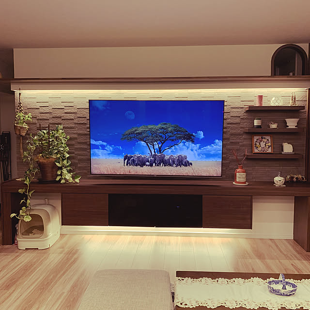 我が家のテレビボードは、巨大なニッチになっていて、エコカラット貼りの壁にテレビを壁掛けにしています📺