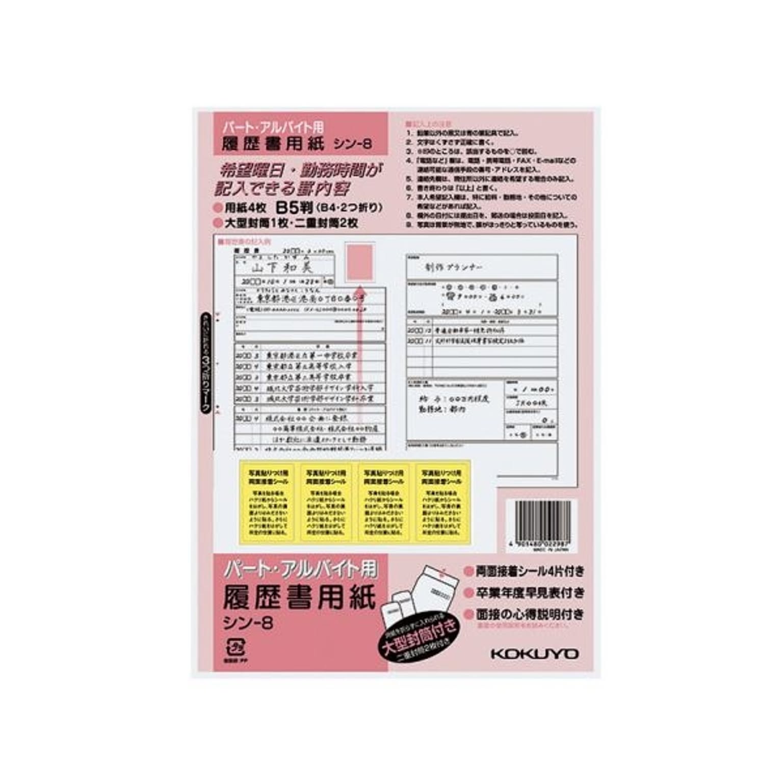 (まとめ)コクヨ 履歴書用紙(大型封筒 1枚・小型封筒2枚・接着シール付)B5 パート・アルバイト用4枚 シン-8 1セット(10パック)【×5セット】