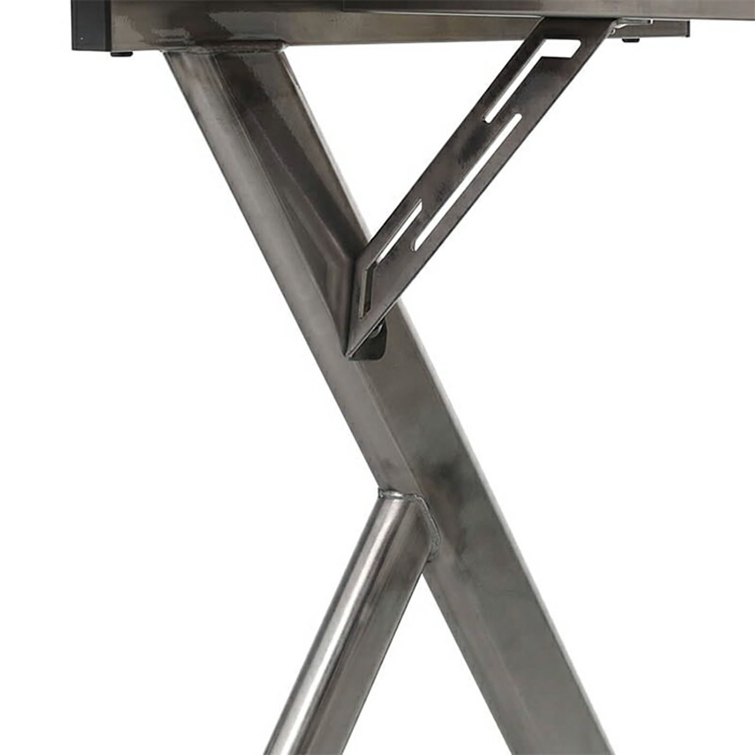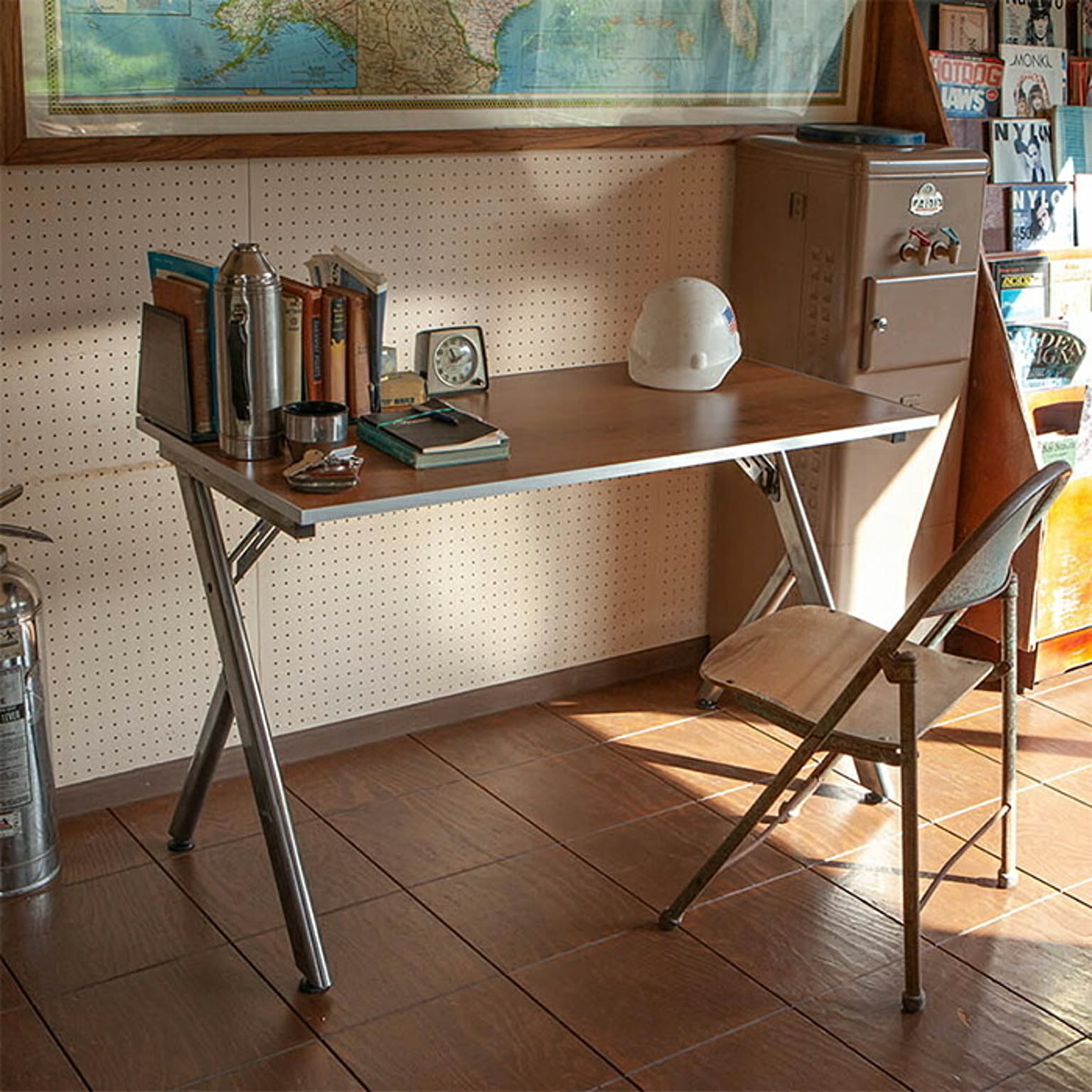 特徴的な形状と脚部の質感が目を引く作業用デスク。その独特な形状は、使用時に絶妙な快適さをもたらします。天板に施されたアルミのエッジは、少し高さがあるので、デスク上のペンや工具が落下するのを防ぐ役目も。スチールの重厚感・安定感を残しつつも軽量なので、移動も楽々。他のスチールアイテムとの調和性も抜群な凡用性の高いデスクです。
