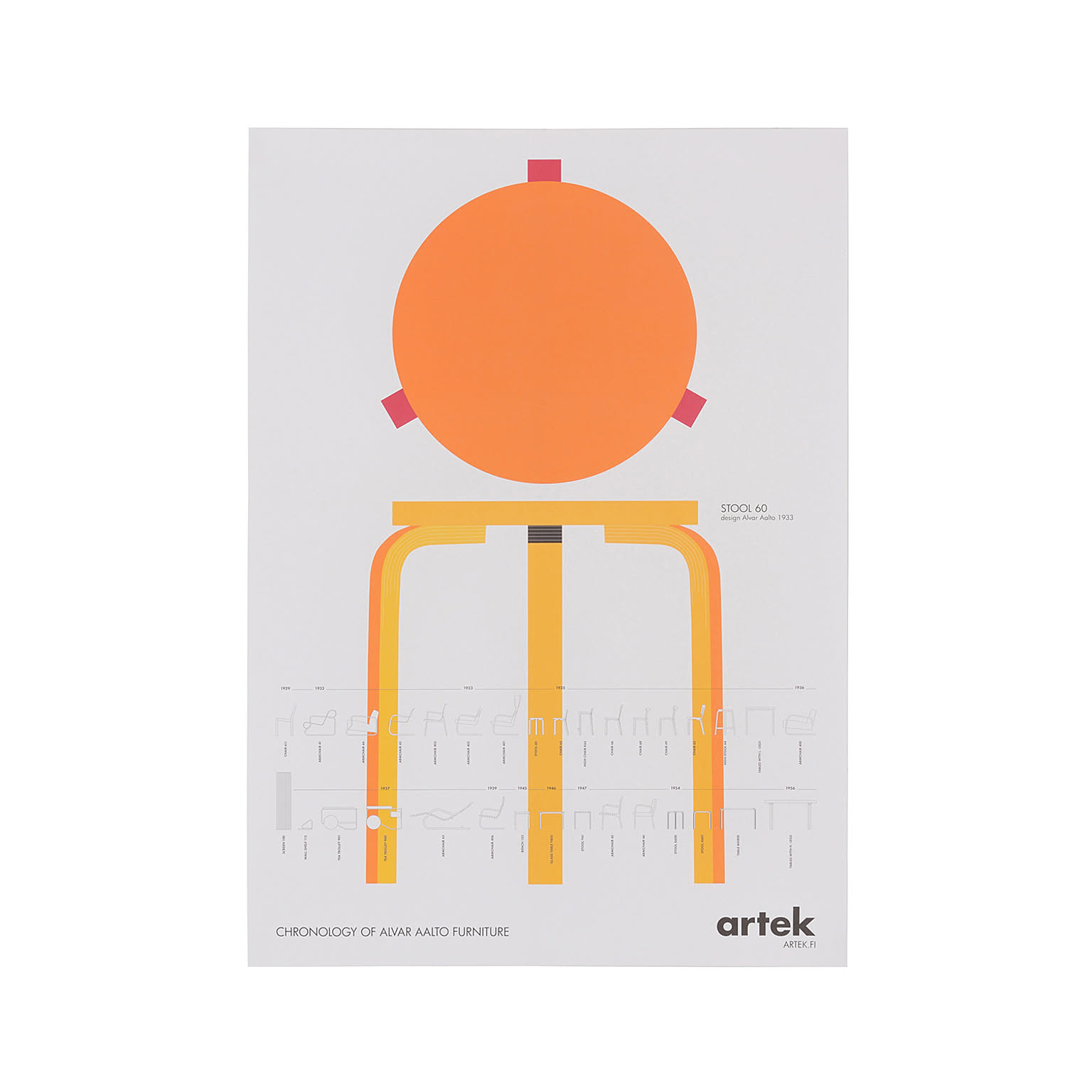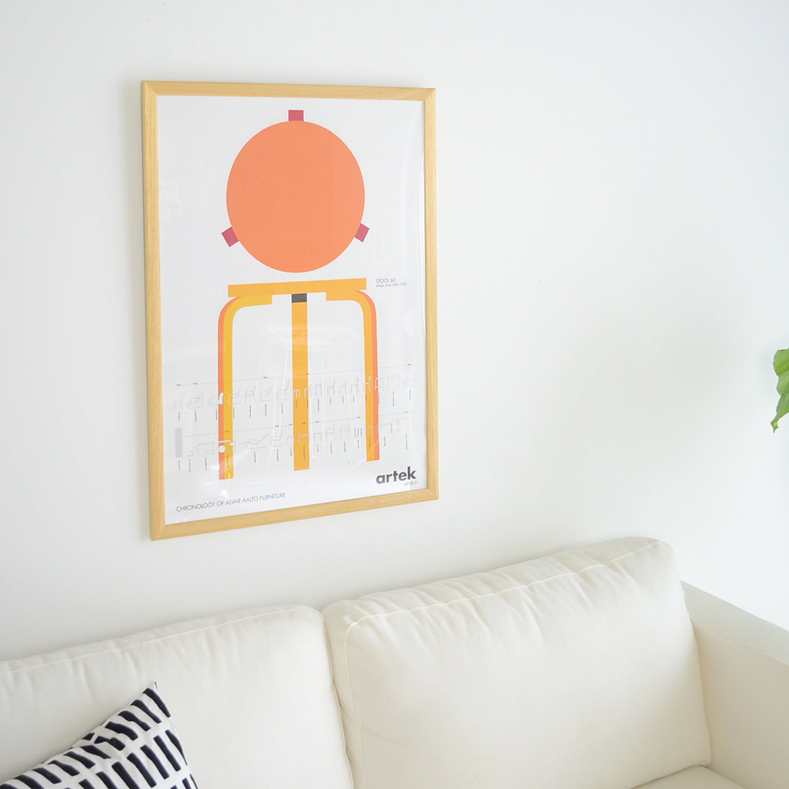 シンプルなシルエットに鮮やかなオレンジは、遠くから見ても存在感を放ちますが、下部をよく見ると、アアルトが手がけた家具の歴史が書かれています。