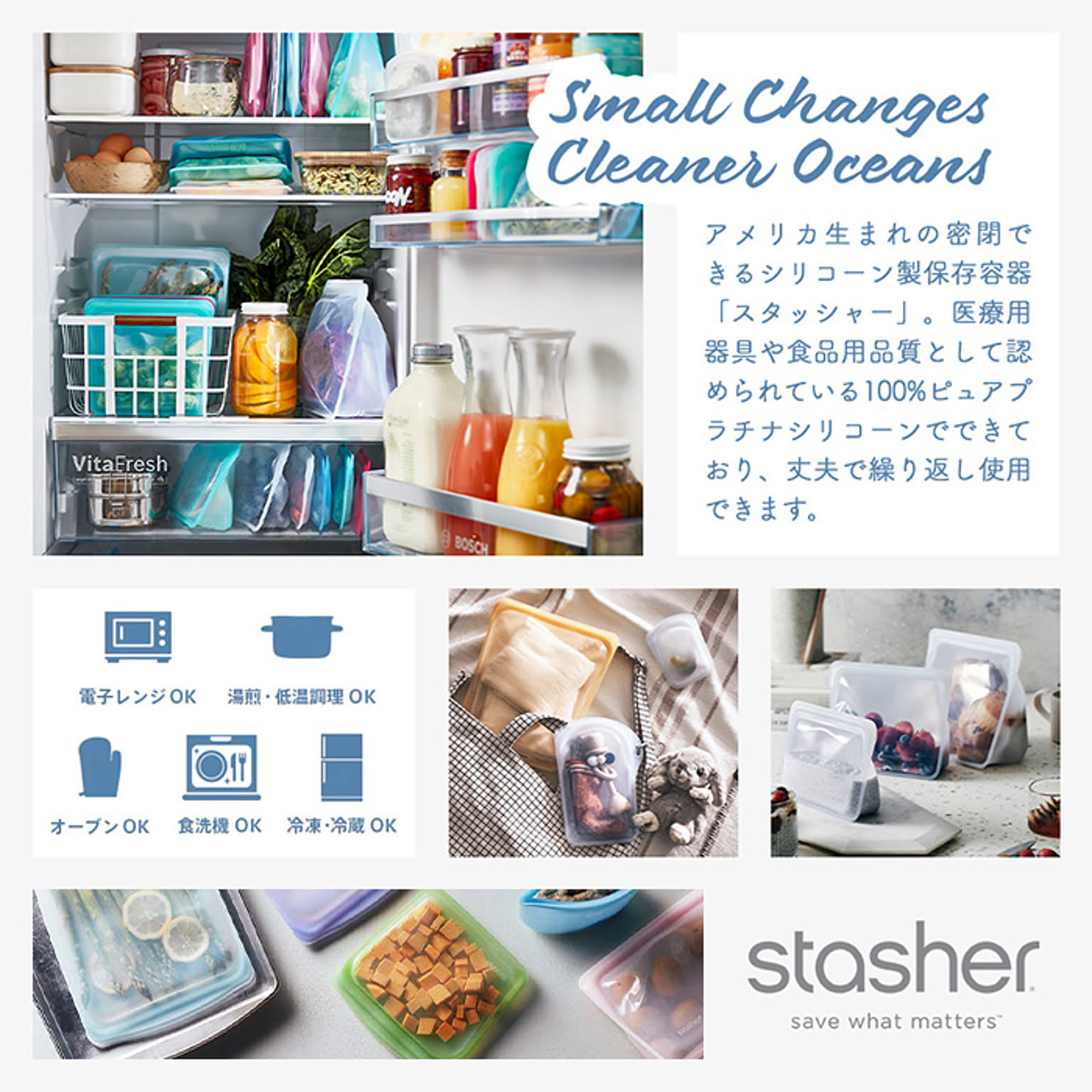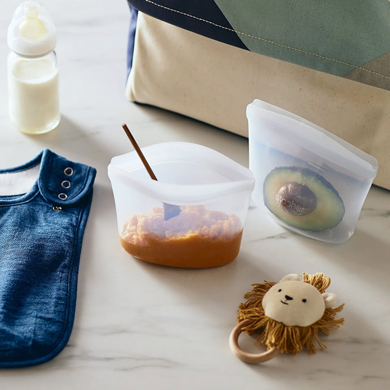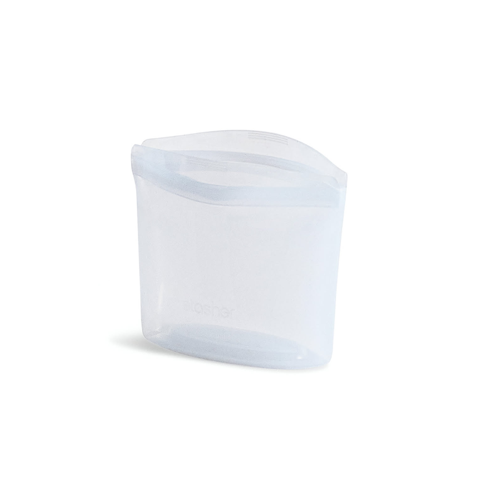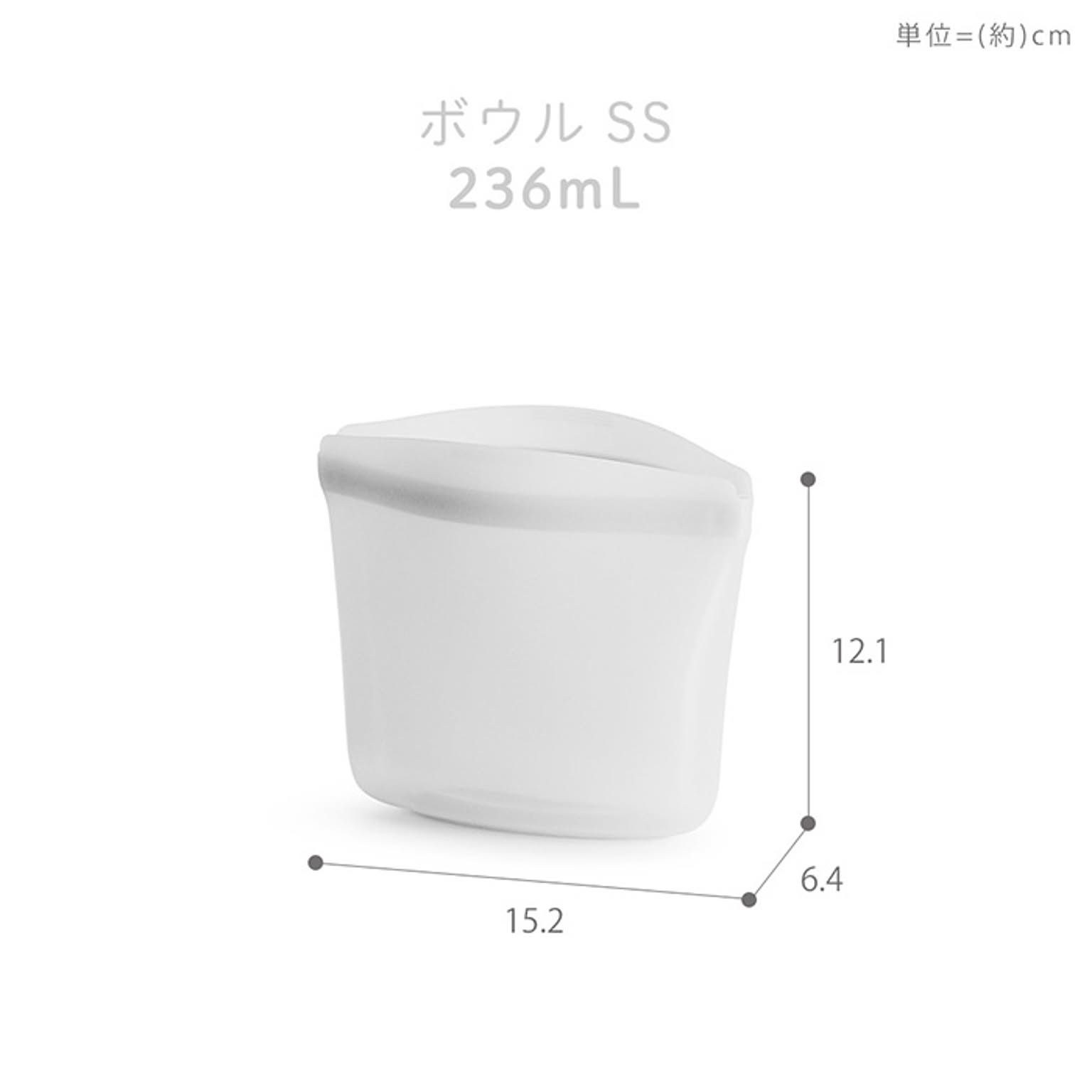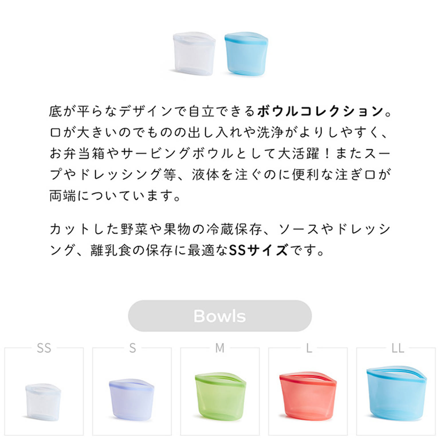 密閉する・100%プラチナシリコーン・保存容器「stasher / スタッシャー」。底が平らなデザインで自立できるボウルコレクション。口が大きいのでものの出し入れや洗浄がよりしやすく、お弁当箱やサービングボウルとして大活躍!またスープやドレッシング等、液体を注ぐのに便利な注ぎ口が両端についています。カットした野菜や果物の冷蔵保存、ソースやドレッシング、離乳食の保存に最適なSSサイズです。