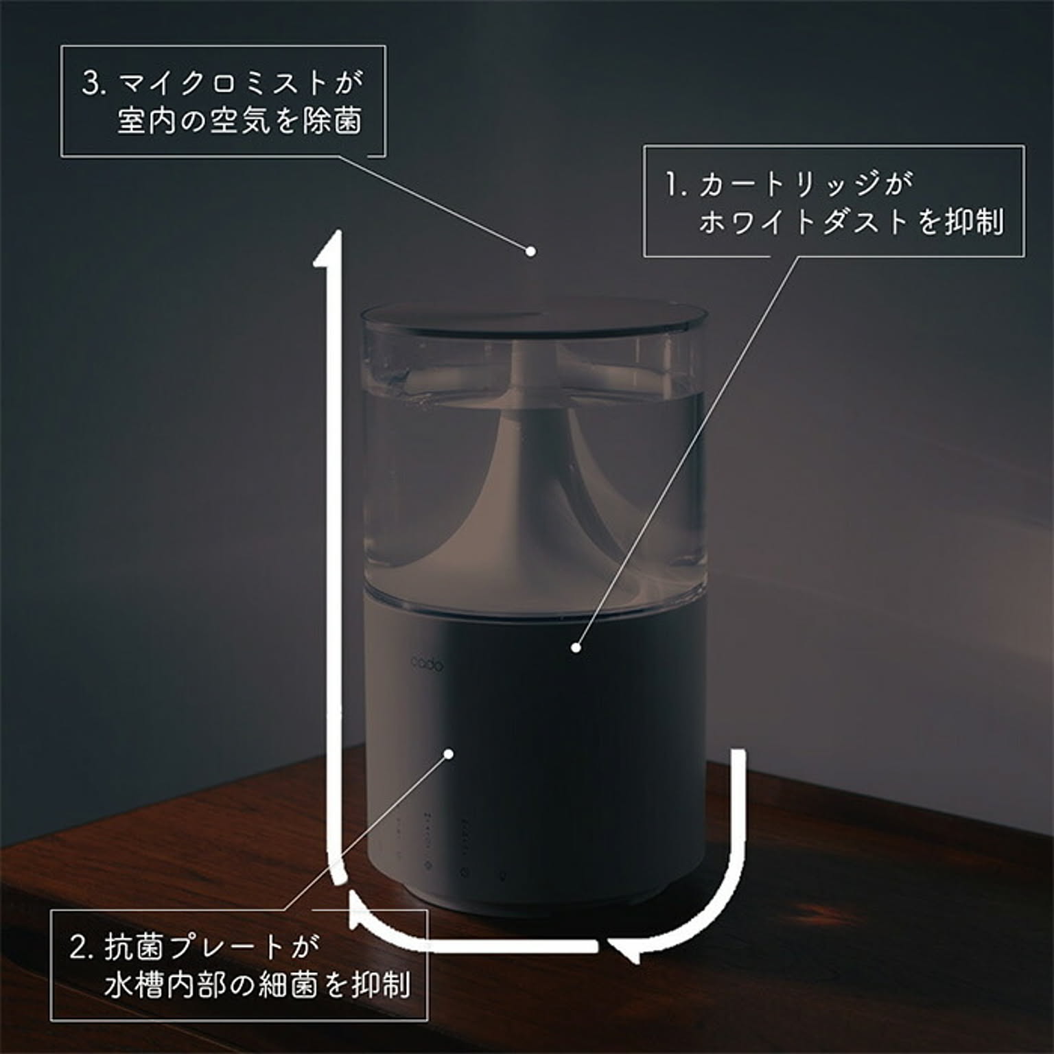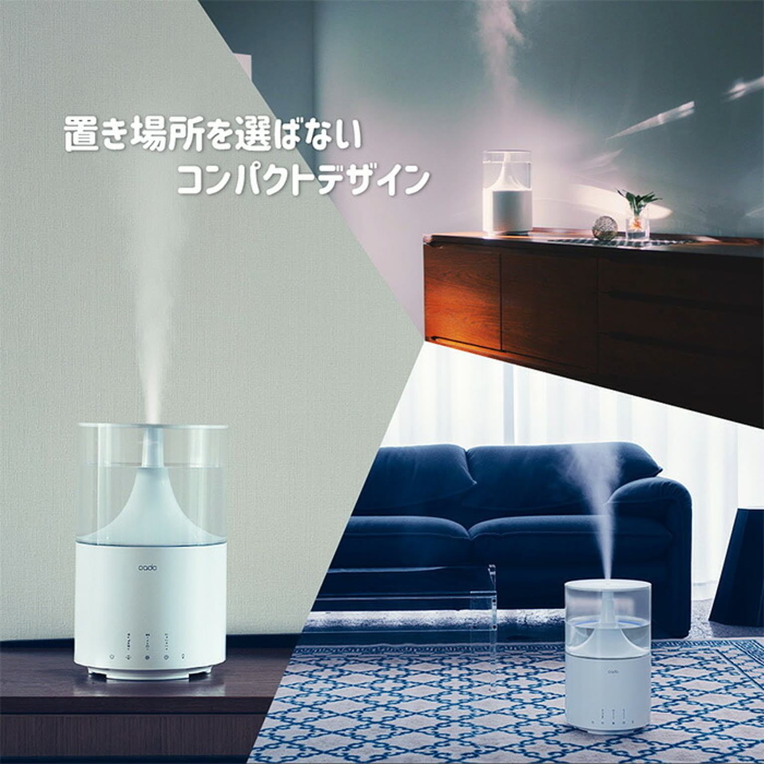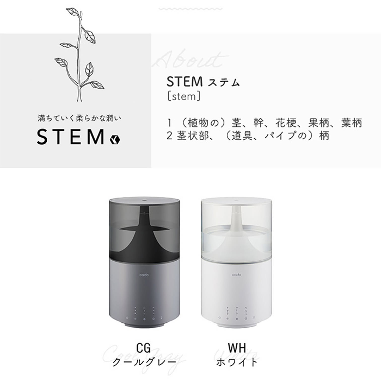 快眠に誘う上質な潤い STEM 300。コンパクトながらcado史上最大3.5Lタンク容量。従来の超音波式を凌駕する99.9%以上除菌機能。運転音がわずか33dBAで安眠を防げない静音性。