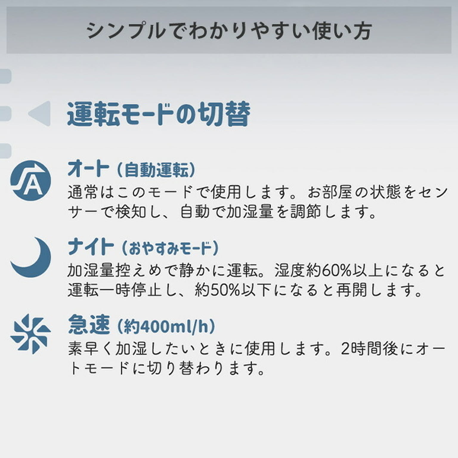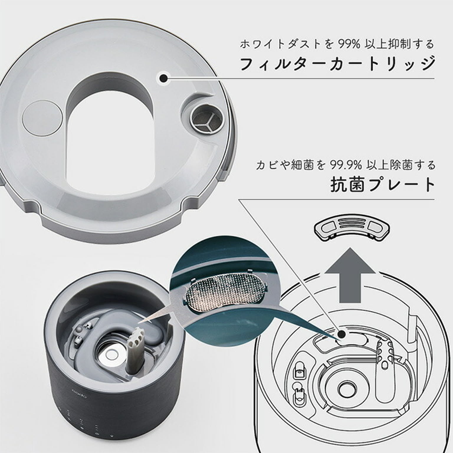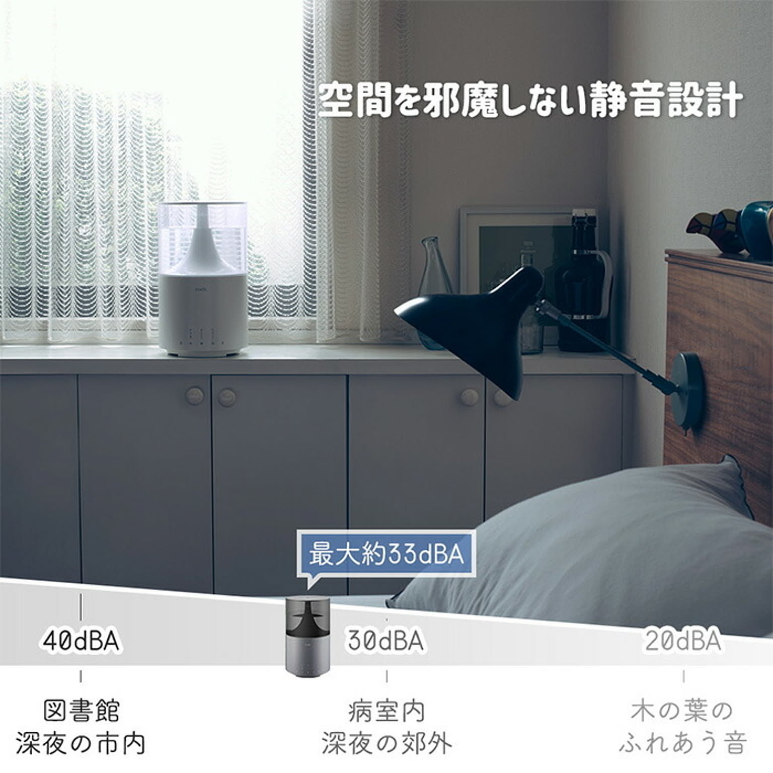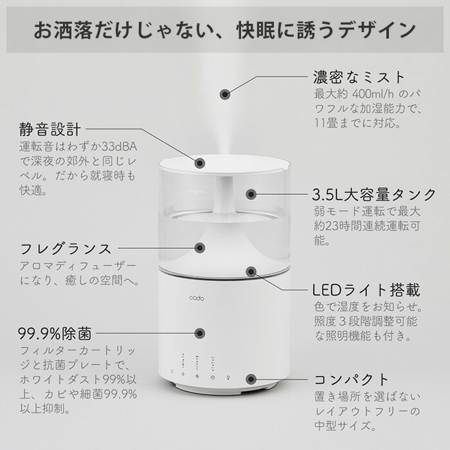 快眠に誘う上質な潤い STEM 300。コンパクトながらcado史上最大3.5Lタンク容量。従来の超音波式を凌駕する99.9%以上除菌機能。運転音がわずか33dBAで安眠を防げない静音性。