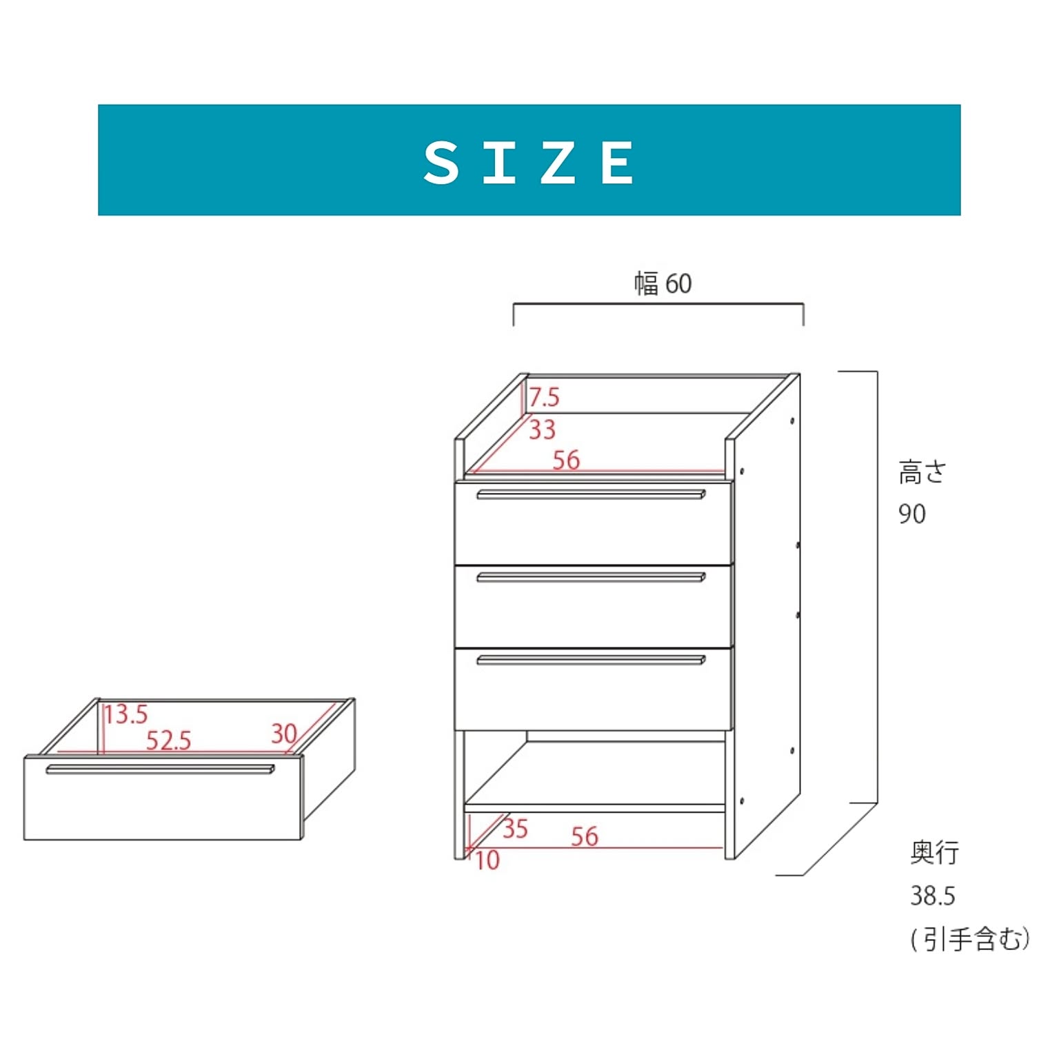 外寸:幅60.0cm×奥行38.6cm(引手含む)×高さ90.0cm 引き出し内寸:幅53.3cm×奥行30.5cm×高さ14.0cm 梱包サイズ:長さ95.5cm×幅36.5cm×厚み18.5cm