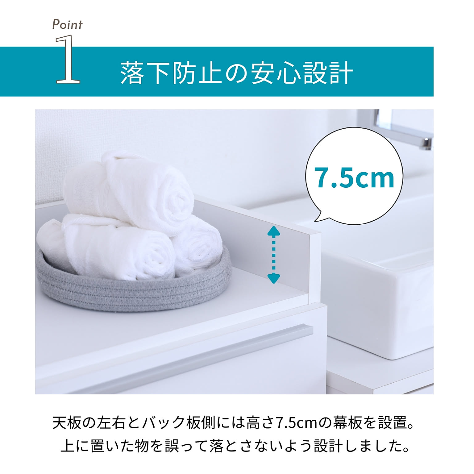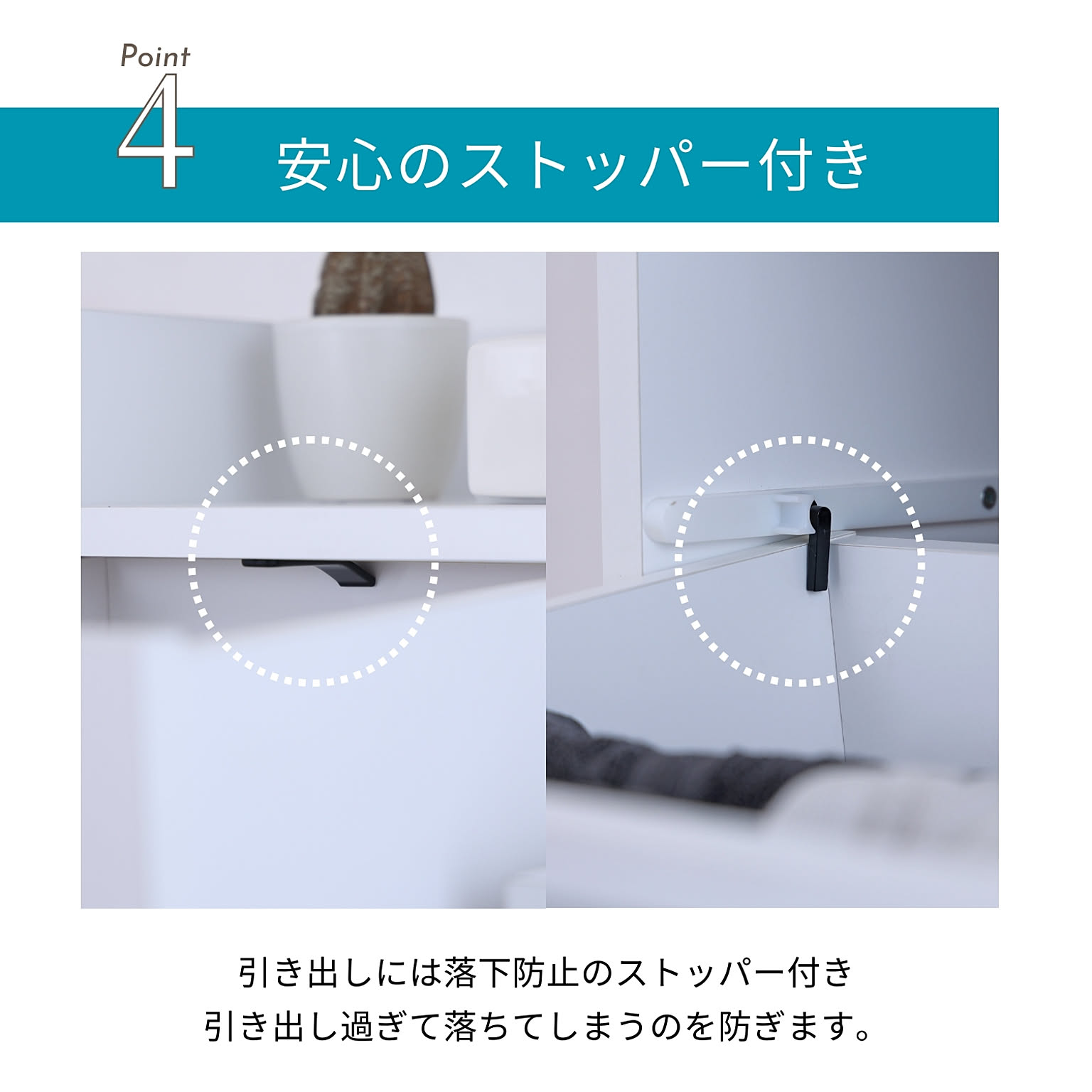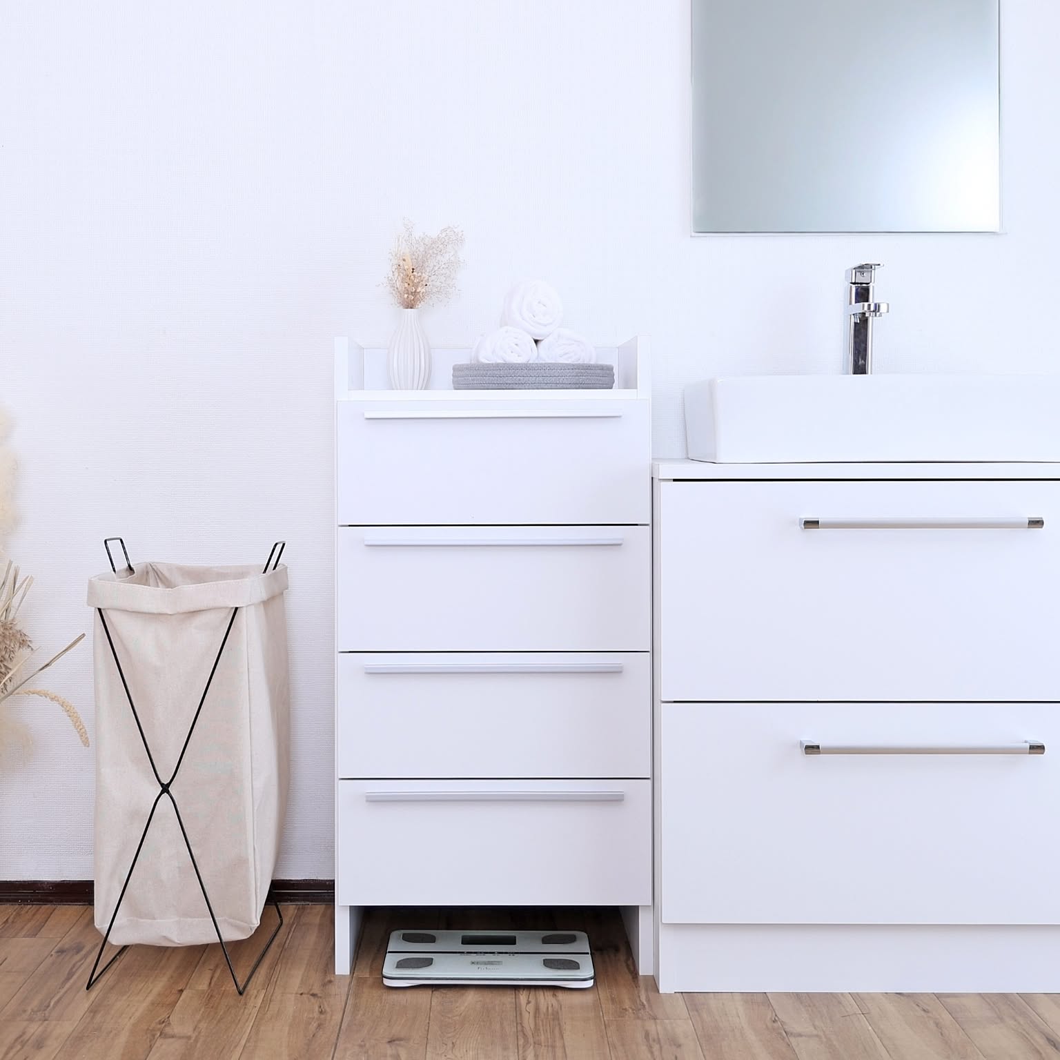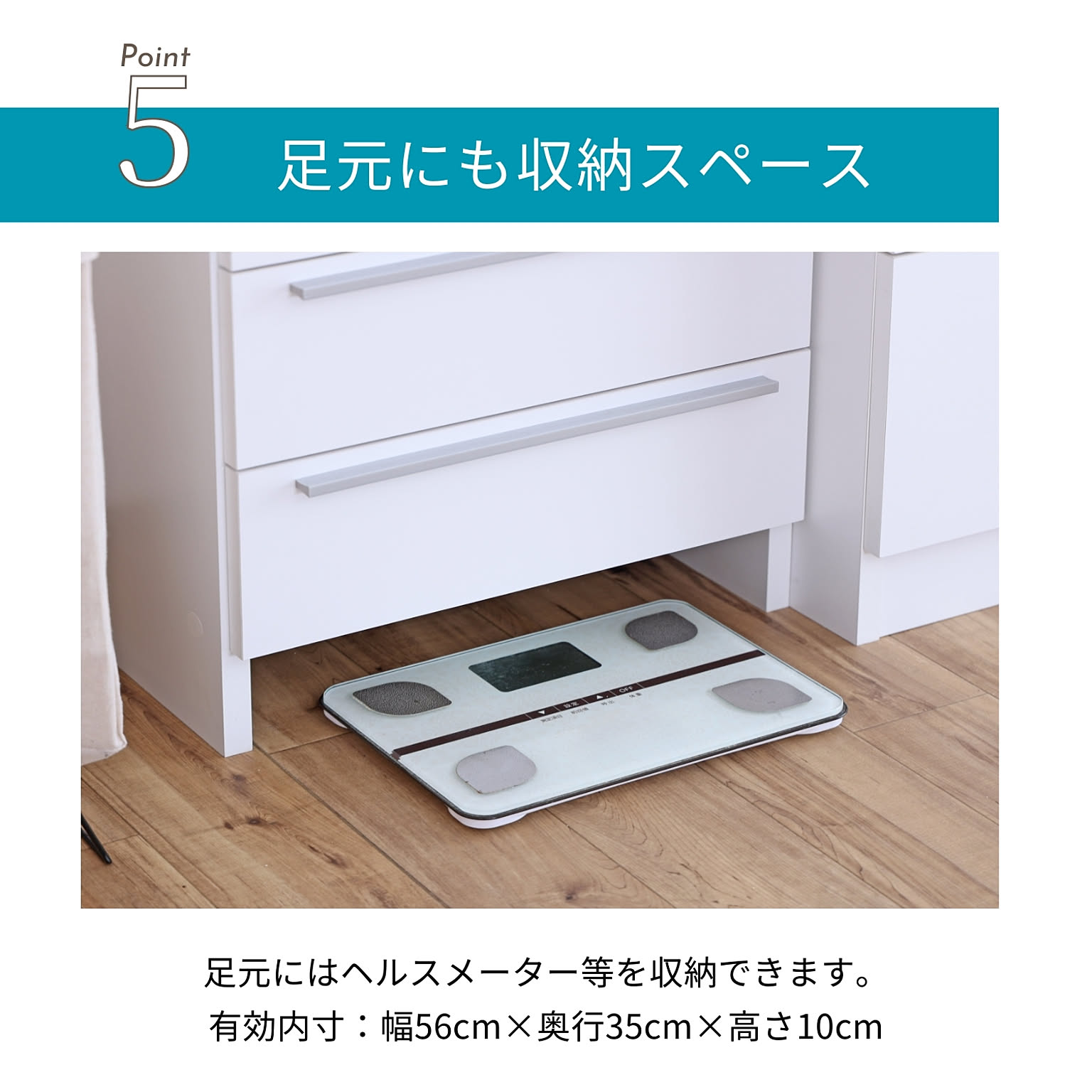 洗面台の高さに合わせた、清潔感のあるホワイトのサニタリーチェストです。 【ポイント】 ・天板部はほとんどの洗面台にジャストサイズな床から高さ80cm ・天板の上に置いたものが落ちない工夫がされた高さ7.5cmの幕板 ・引き出し4杯付き ・足元には体重計などが置ける収納スペースあり ・ぐらつき防止「バック板止め」付き ・安心安全の日本製!ホルムアルデヒドの揮発が少ないF☆☆☆☆仕様 【耐荷重】 天板耐荷重:10kg 引き出し耐荷重:5kg