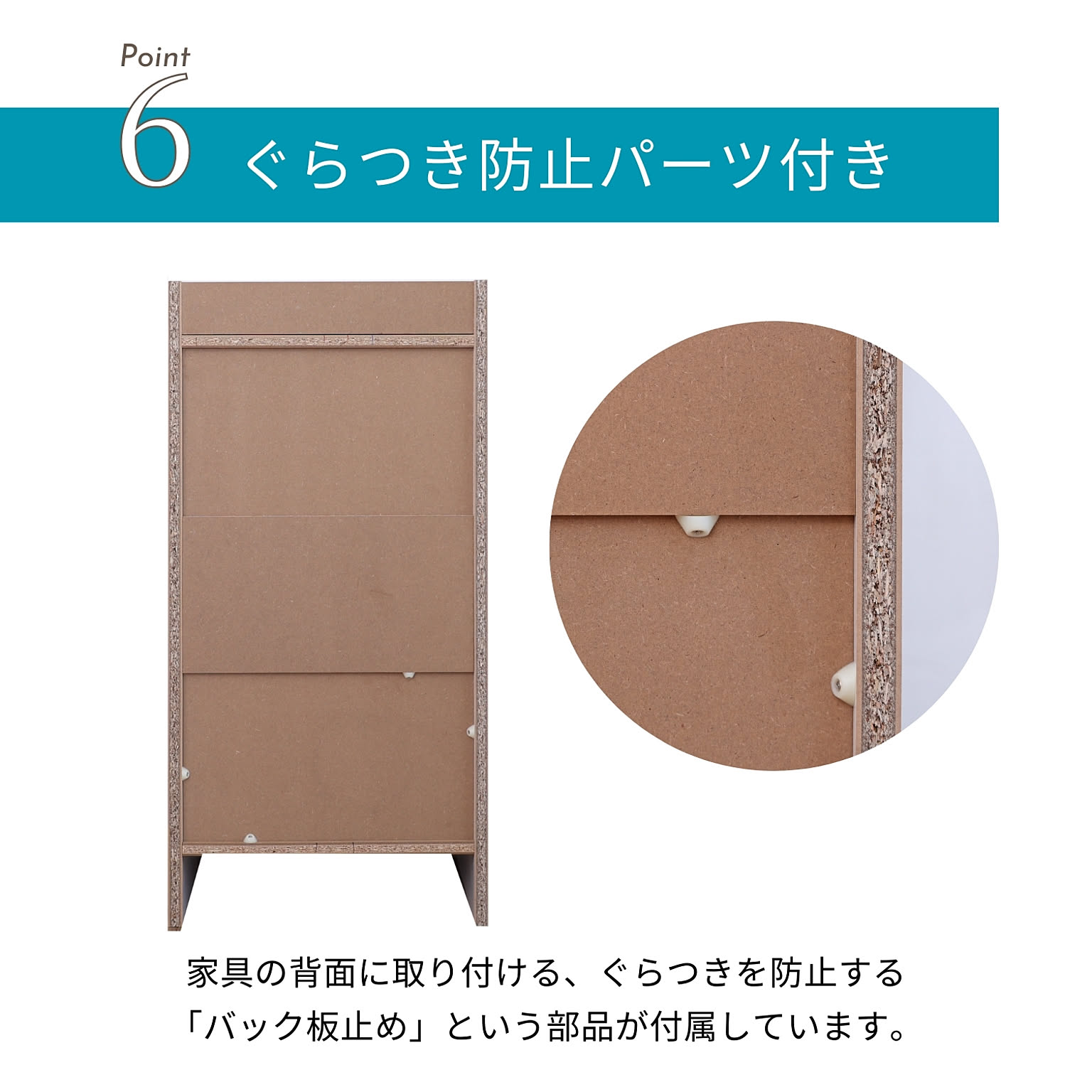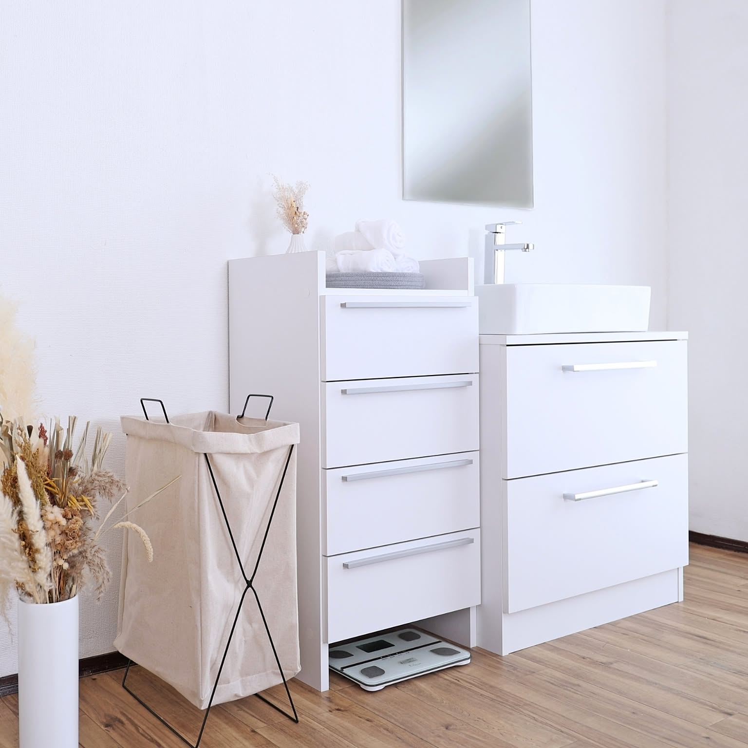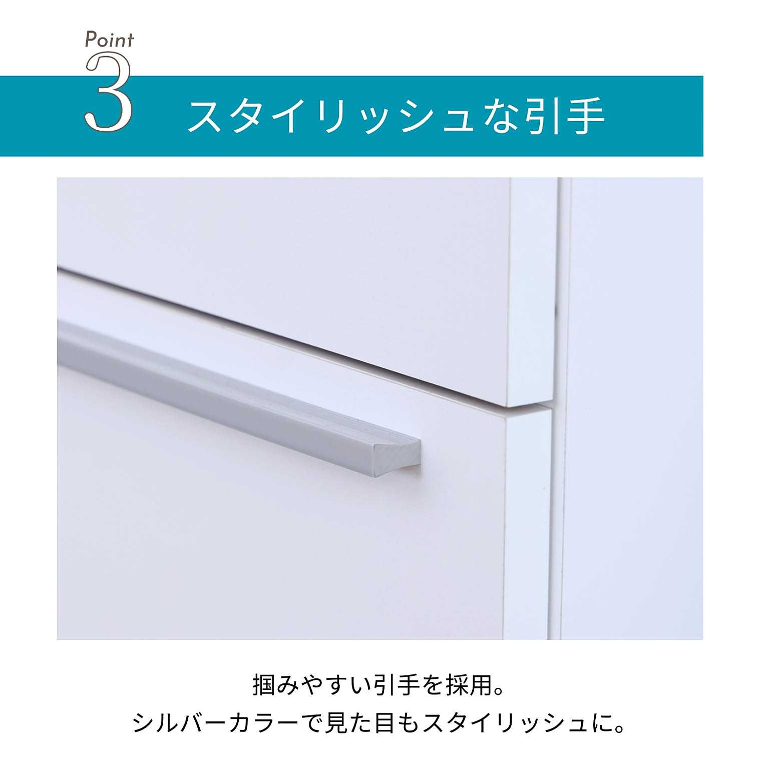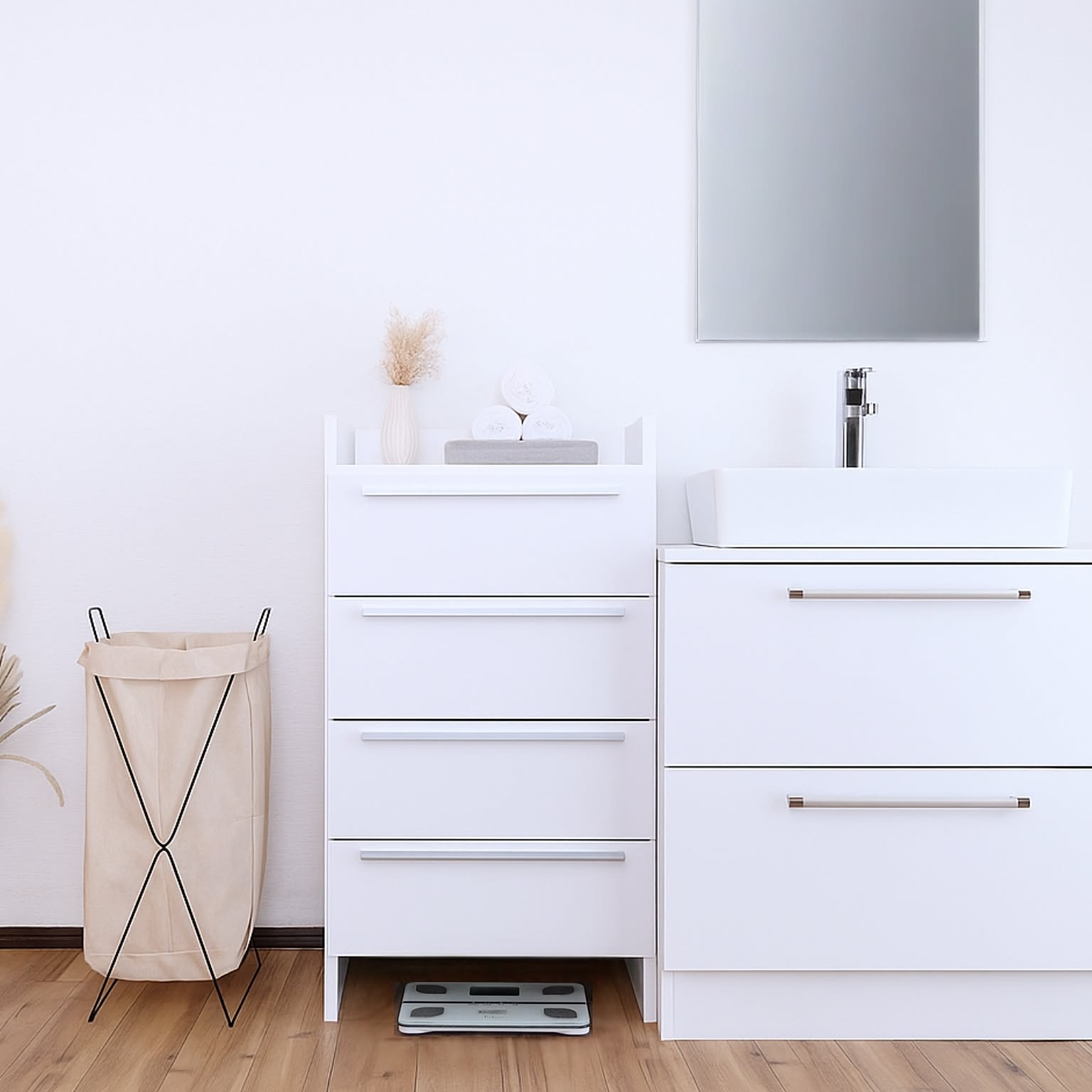 洗面台の高さに合わせた、清潔感のあるホワイトのサニタリーチェストです。 【ポイント】 ・天板部はほとんどの洗面台にジャストサイズな床から高さ80cm ・天板の上に置いたものが落ちない工夫がされた高さ7.5cmの幕板 ・引き出し4杯付き ・足元には体重計などが置ける収納スペースあり ・ぐらつき防止「バック板止め」付き ・安心安全の日本製!ホルムアルデヒドの揮発が少ないF☆☆☆☆仕様 【耐荷重】 天板耐荷重:10kg 引き出し耐荷重:5kg