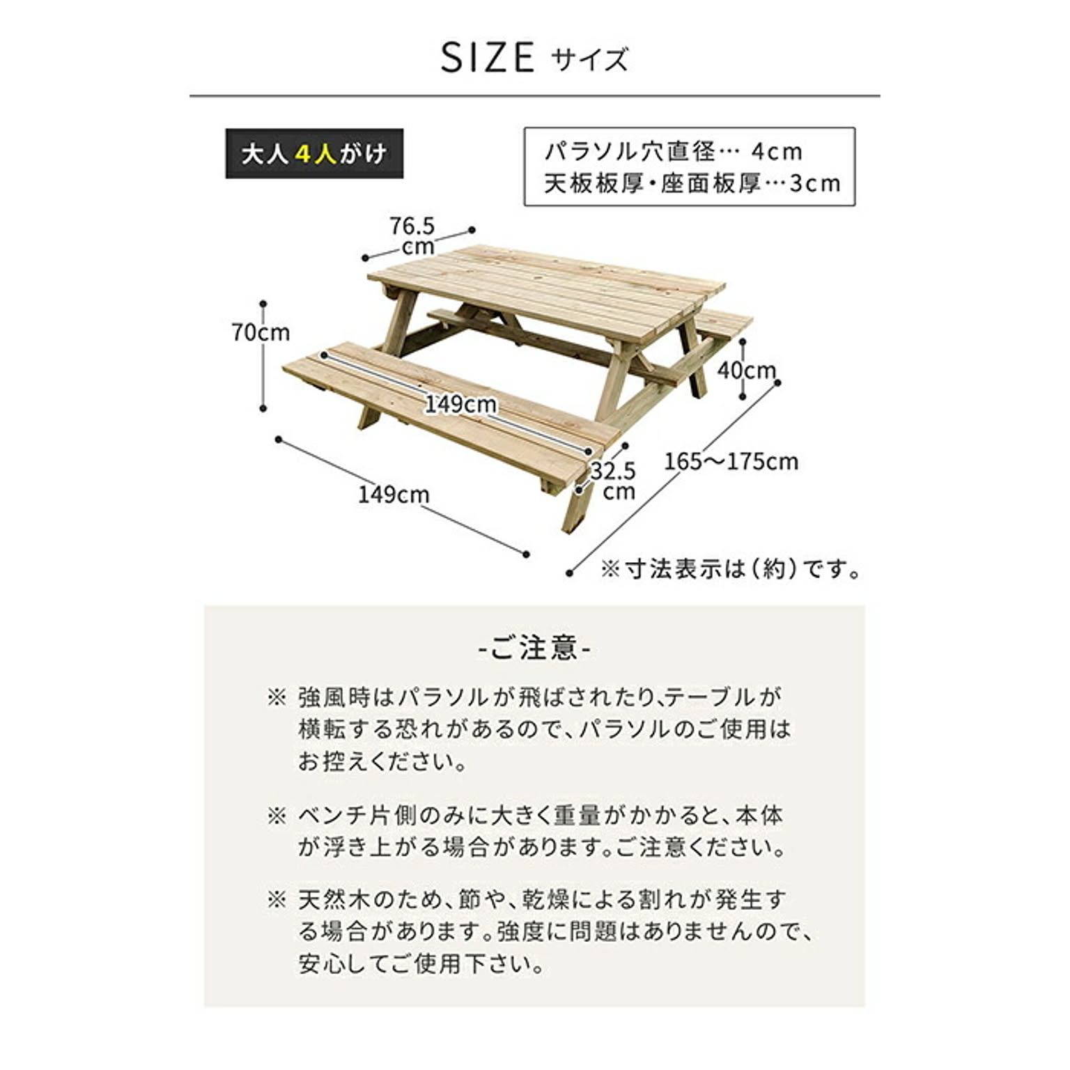 パラソル穴:直径 約40mm