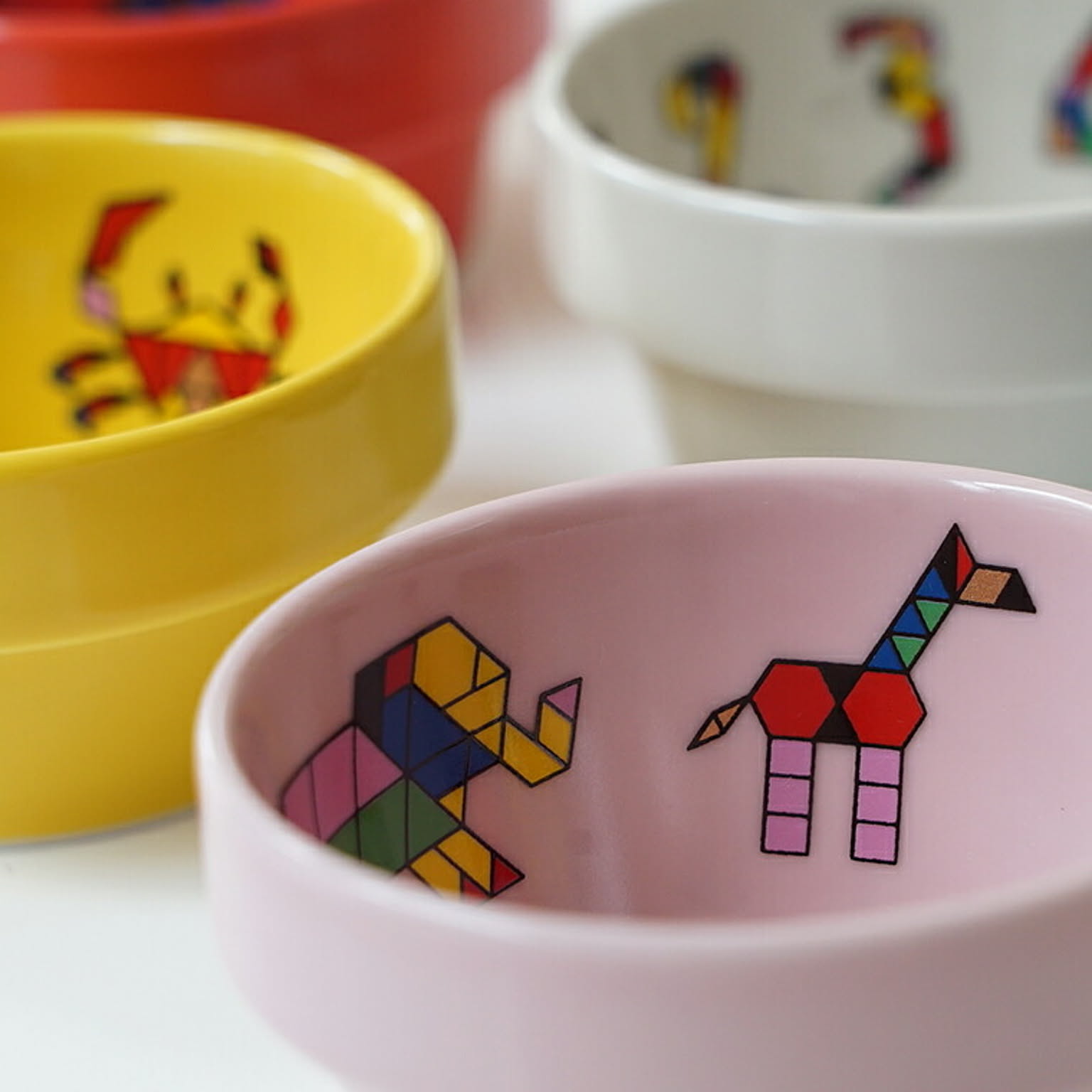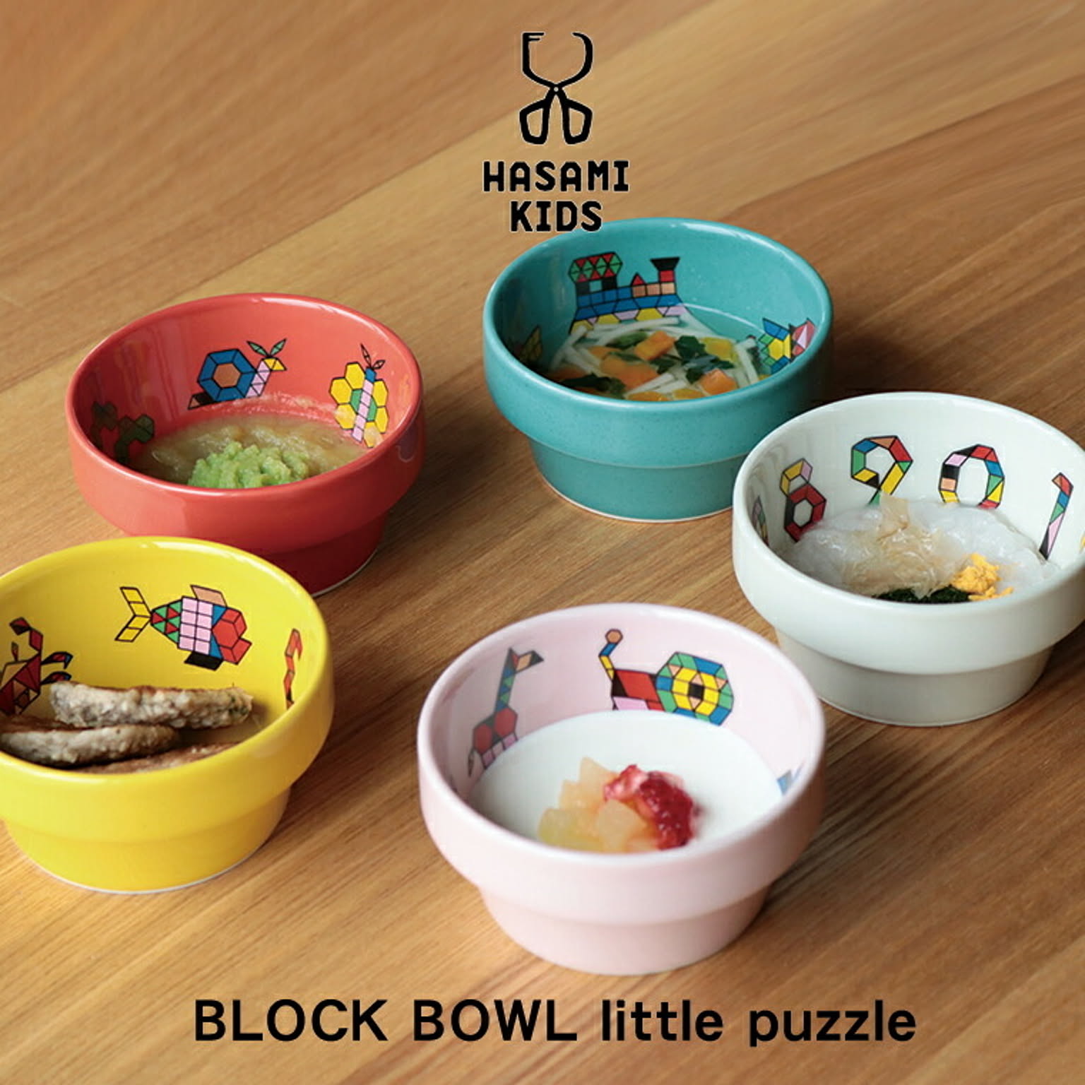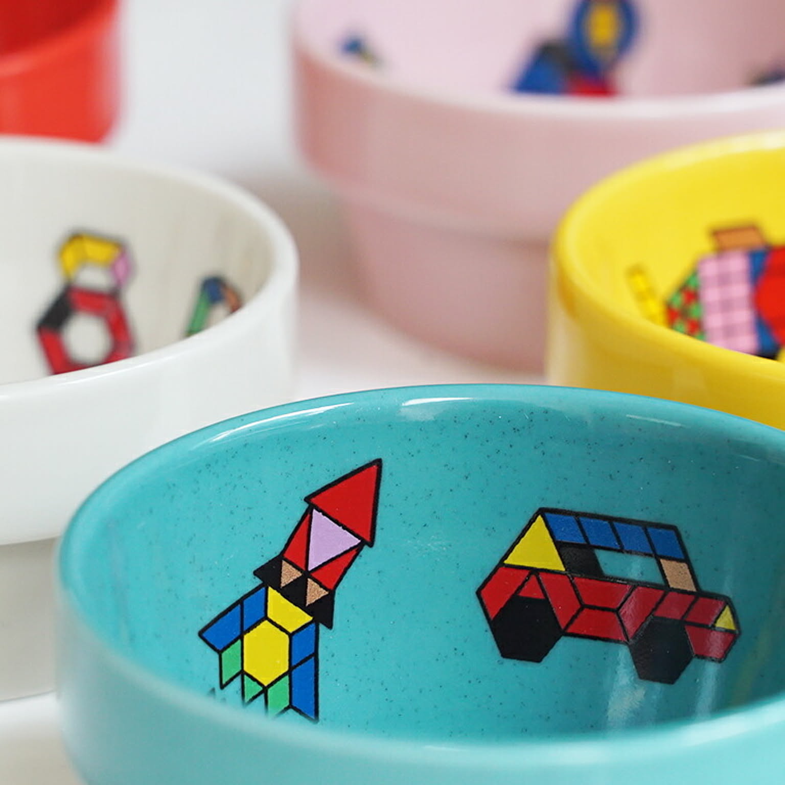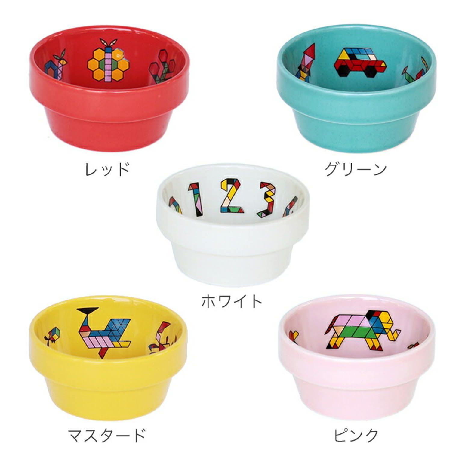 シンプルな図形のパズルで作った動物や乗り物をデザインした子供食器です。