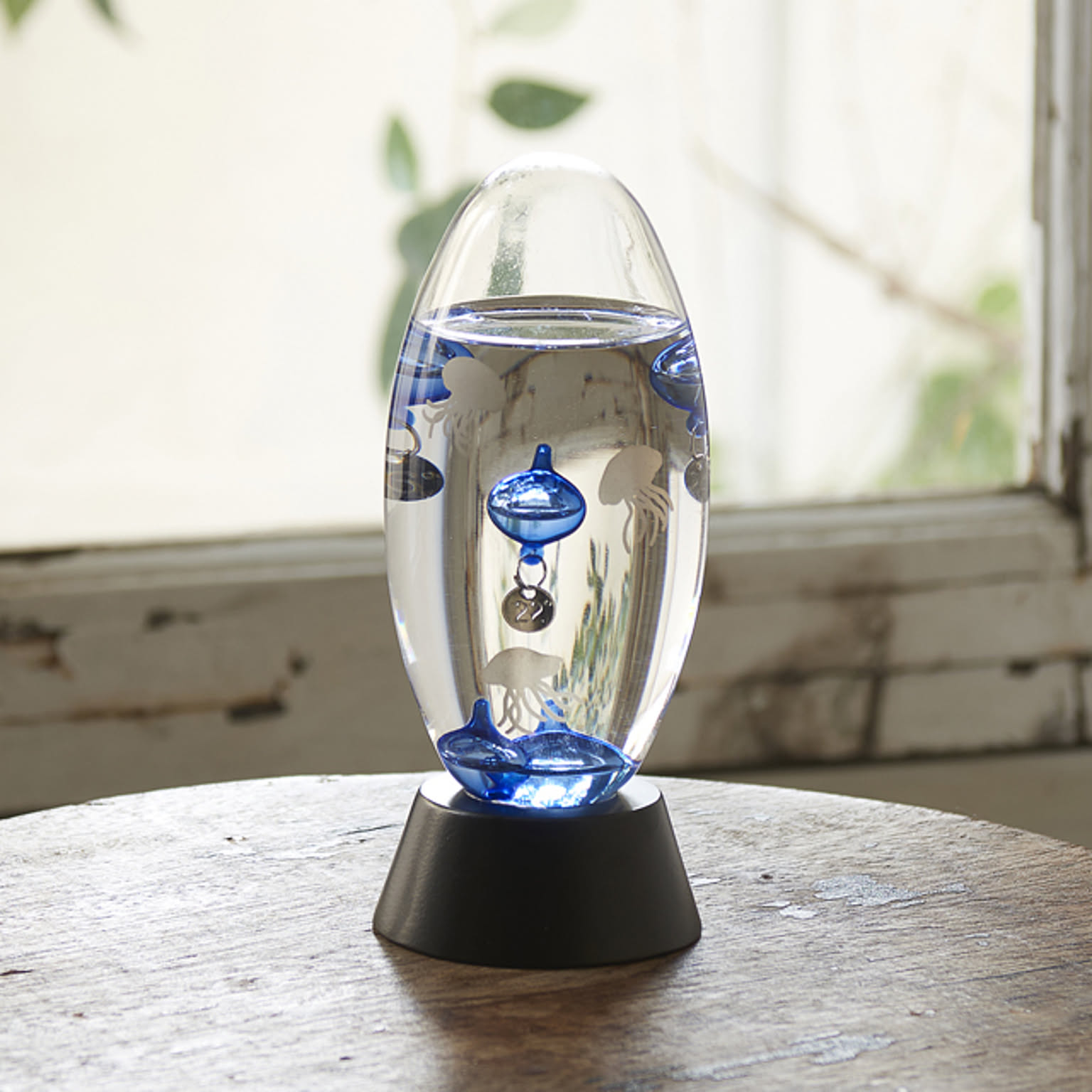 ガラスには「くらげ」の姿をプリントし、まるで青い球体とともに海の中をプカプカと泳いでいるようです。