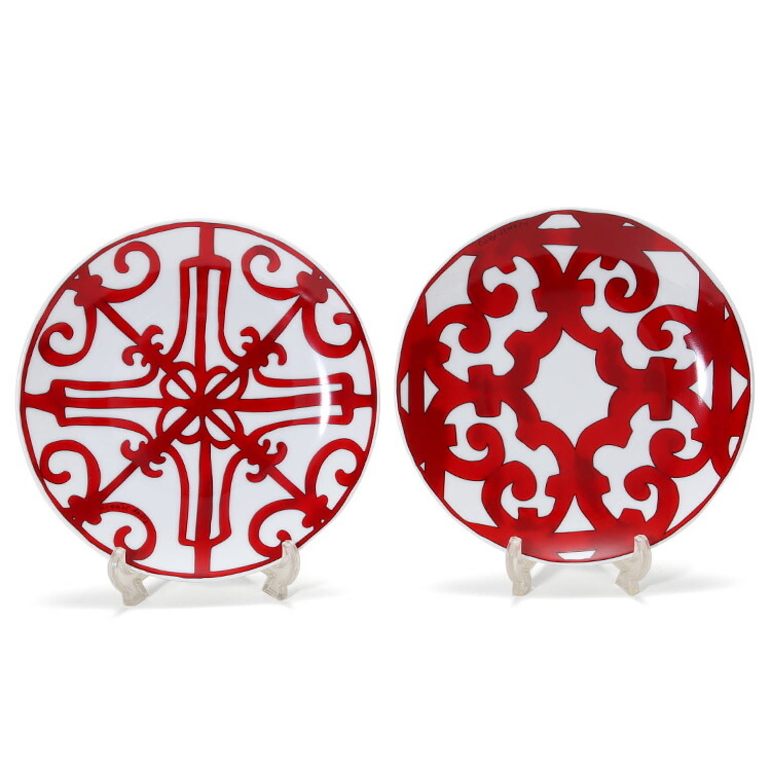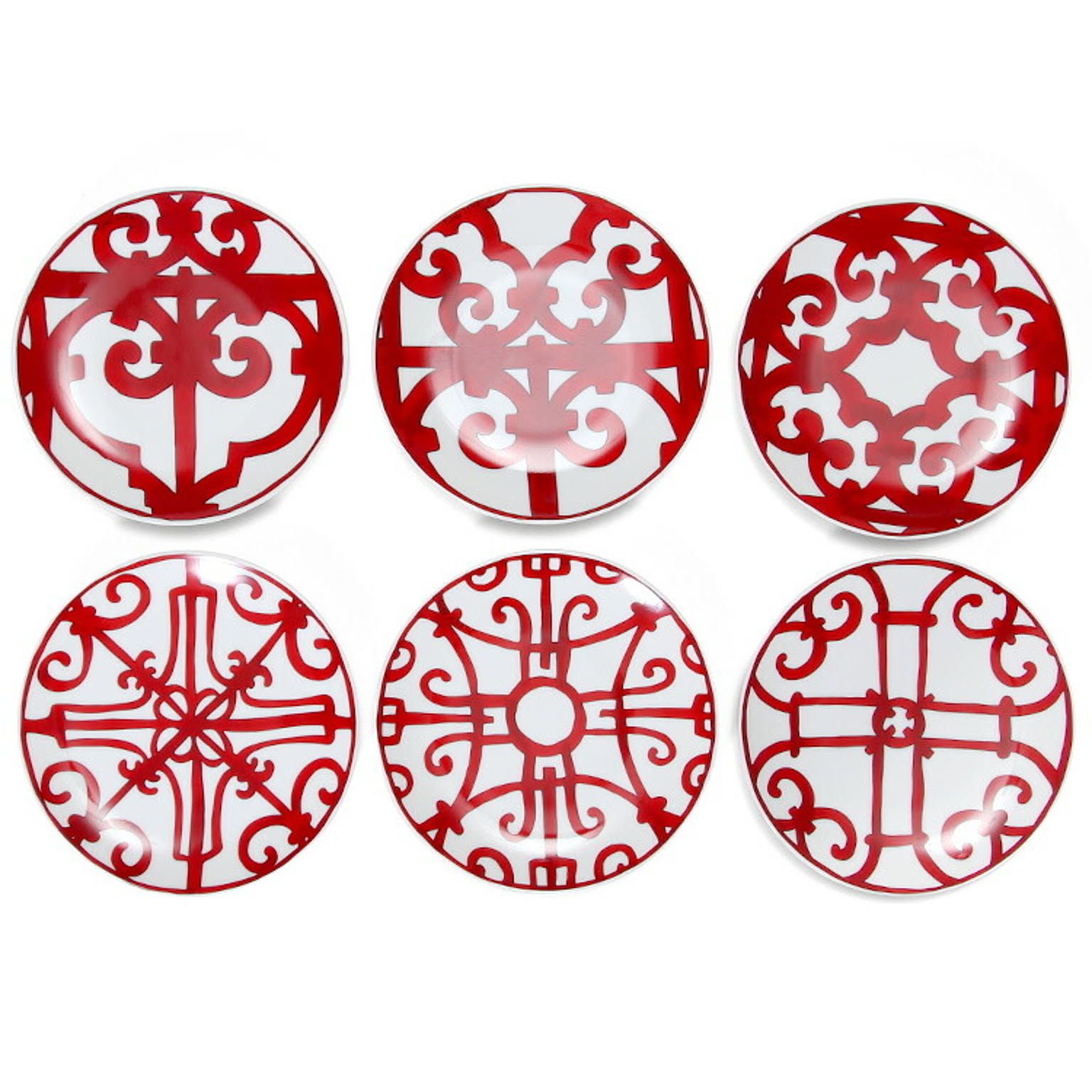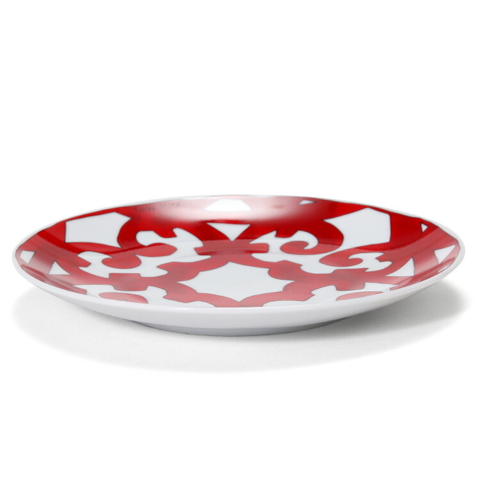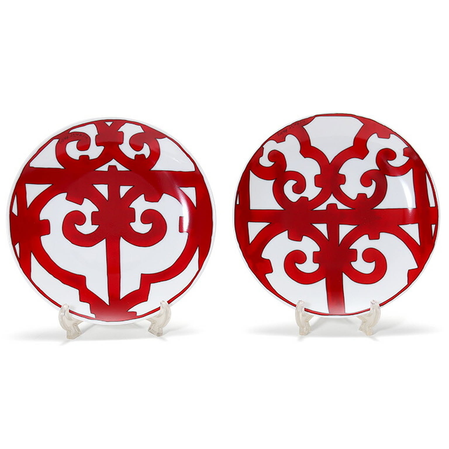 1984年にテーブルウェアの販売を開始したエルメスの中でも、特に印象的で新しいテイストのシリーズ、ガダルキヴィール。一度聞いただけでは、少し覚えにくい響きのパターン名ですが、ガダルキヴィールはスペインのゴルドバにある河の名前で、そこからインスピレーションを受けたデザインとされています。エルメスといえば、従来はスカーフやネクタイ等に見られる馬具などの緻密なデッサンによるプリントを思い浮かべがちですが、このガダルキヴィールは、そういった緻密なプリントとは明らかに異なる雰囲気を持っており、プレート全体に描かれた思わず目を奪われる赤色の幾何学模様を見ていると、確かにそこに情熱の国スペインを彷彿とさせるものを感じとることができます。このデザインの特徴ともいえる燃え立つような赤色は、炎の中で輝く鉄を自在に操る鉄細工職人と、金属のレースを編み出す彫金職人たちの自由なイマジネーションからうまれました。4、5種類の赤を基本に混ぜ合わせることで、10以上のトーンを持った深みのある赤が生まれるのですが、その赤こそが、オリジナルデッサンが持つ透明感や素朴さを表現するのに最もふさわしい色であるとされています。裏面には、それぞれプリントを施した職人のトレードマークが入っていて、それはまるで伝統と革新に裏付けられた技術の結晶のようです。またガダルキヴィールは、赤色をした幾何学デザインの中に「ハート型」が見受けられることから、結婚に関する記念品や贈り物などに大変人気です。