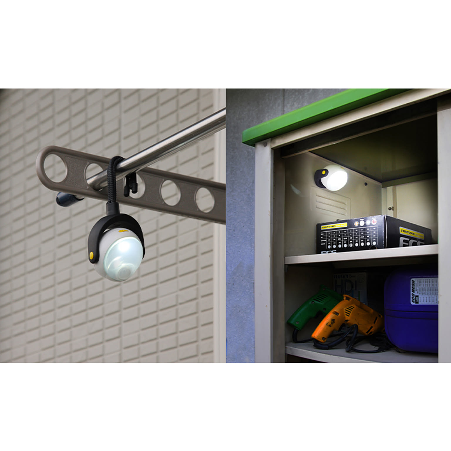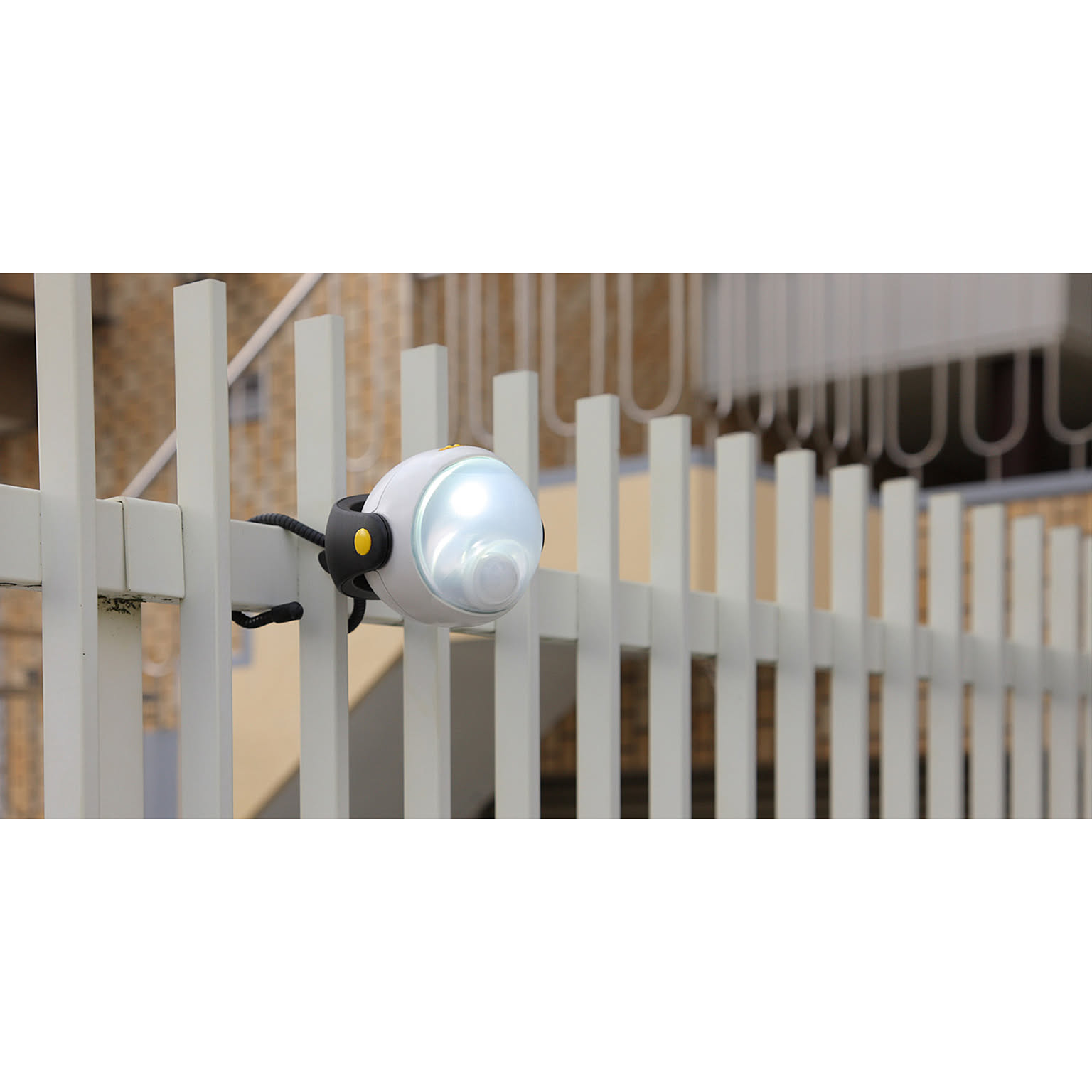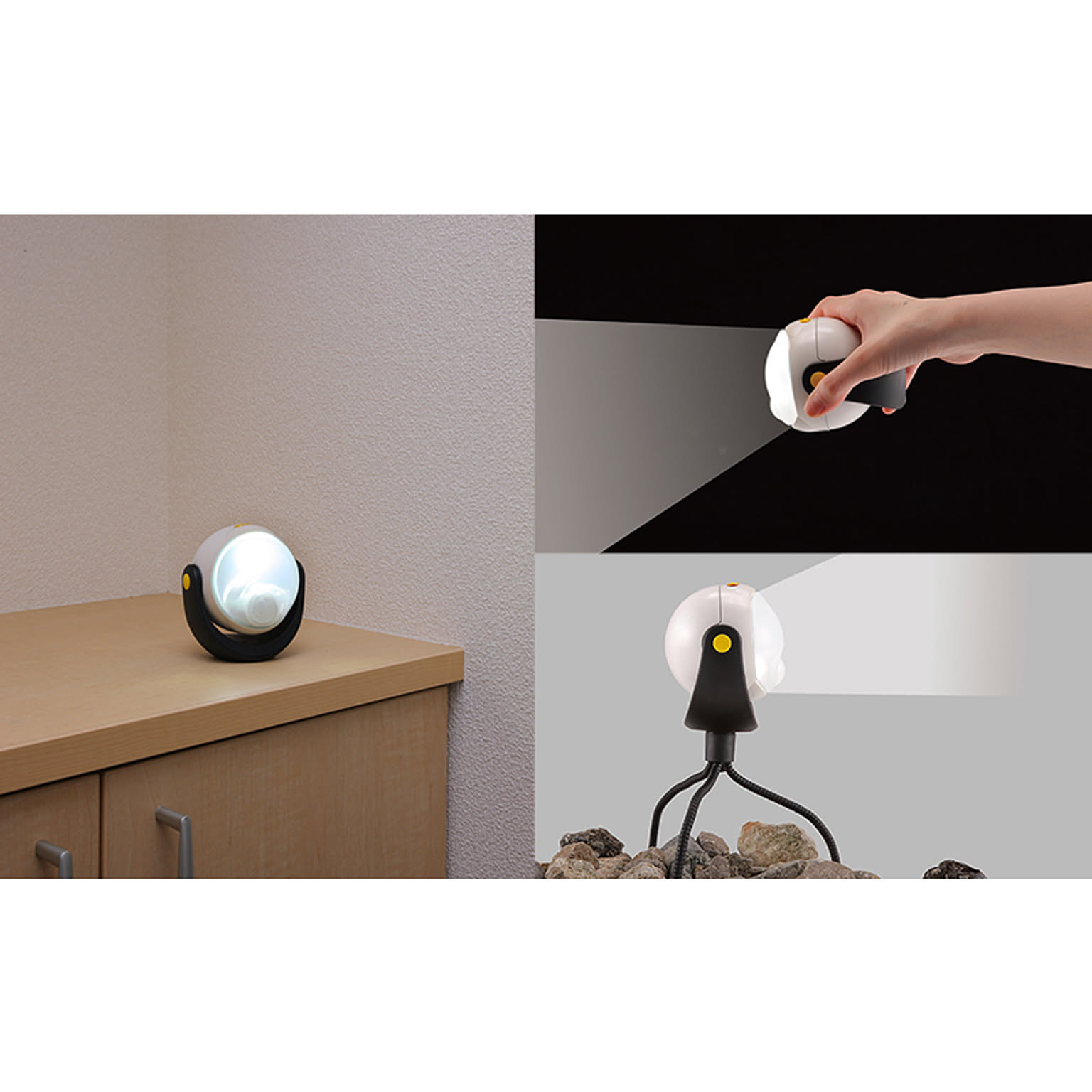 ■取付け自由自在。 自由に曲がる三脚でどこでも取付けできます。 ■今まで取付けにくかったあらゆる場所に! 三脚が付いているので足場の悪い場所、三脚の形を変えることでフェンスや柱など垂直な場所や物干し竿などに引っ掛けてお使いいただけます。 ■三脚を外せば強力マグネットが出現。 物置やロッカーなどマグネットが付く場所でご利用いただけます。 ■手に持って懐中電灯代わりとしてもお使いいただけます。 防雨型なので、雨の日のお散歩のお供にもどうぞ。