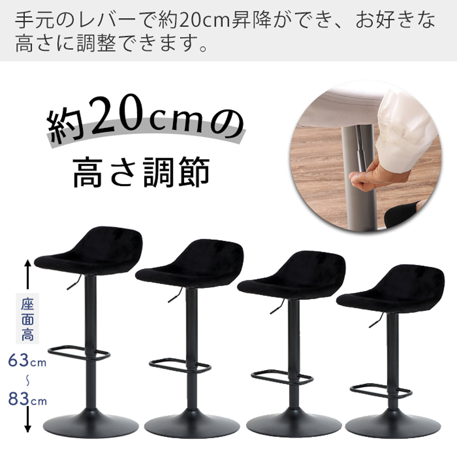 約20cmの昇降が可能、お好きな高さに調節していただけます。