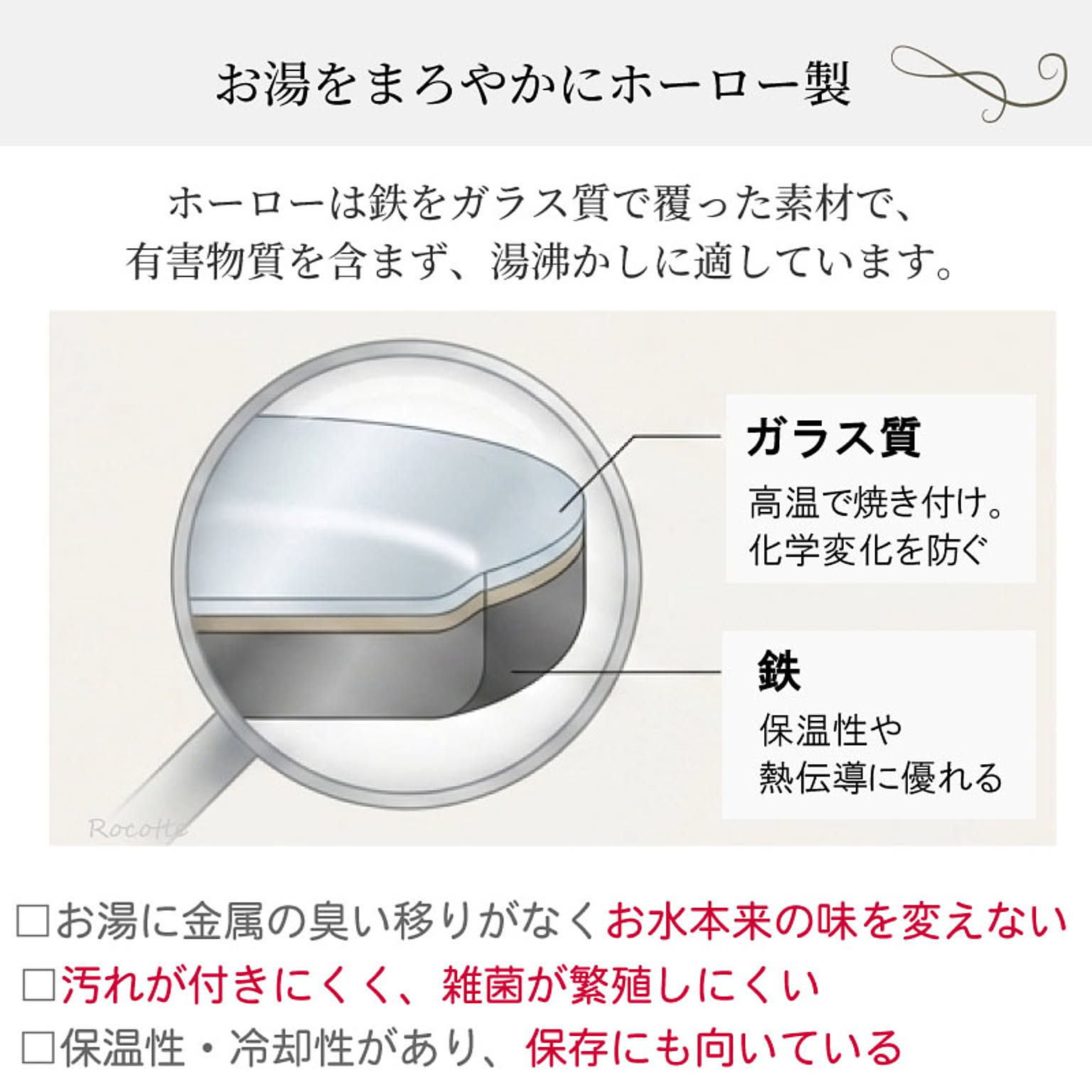 ホーローはお湯に金属臭移りがなく、お水本来の味を替えないので、