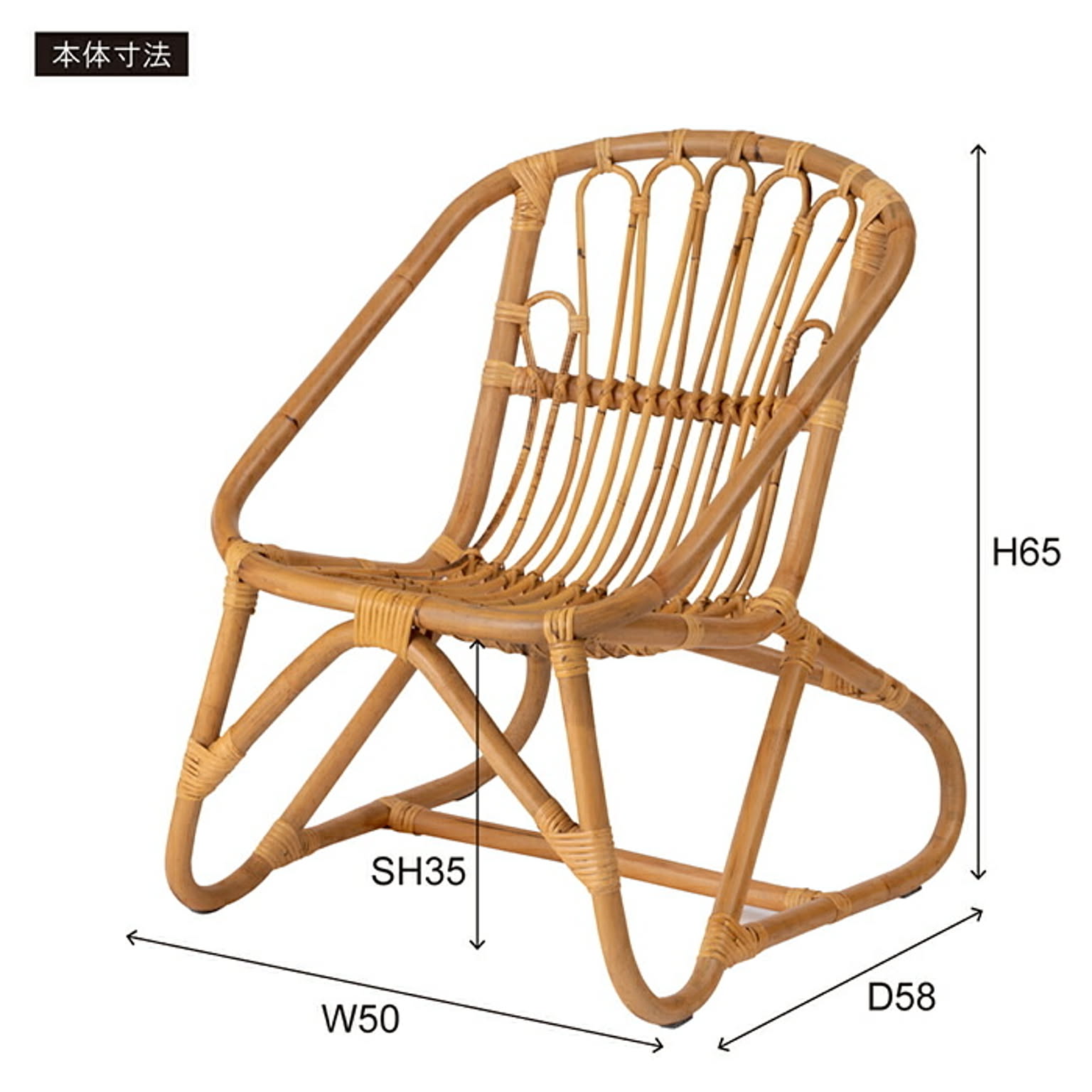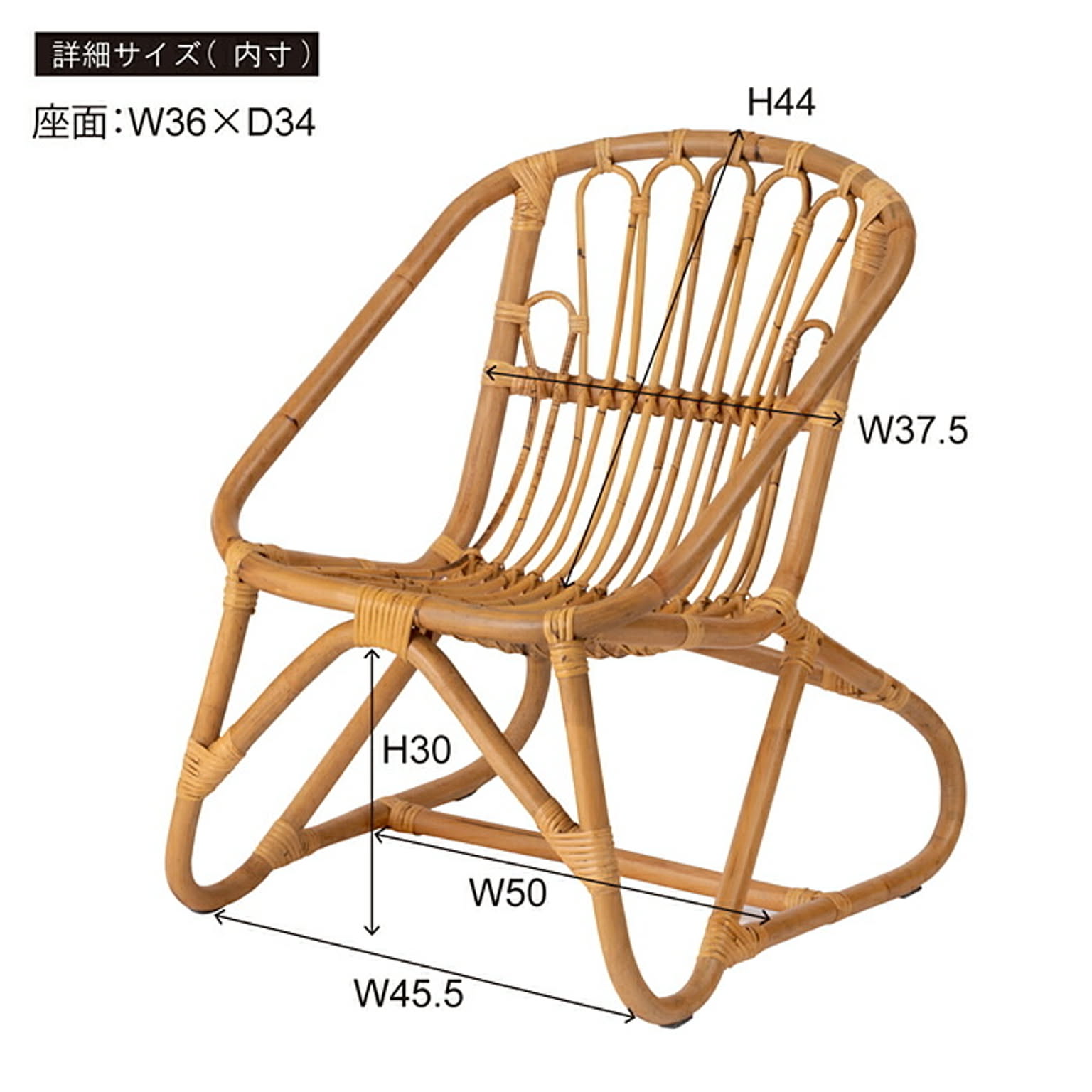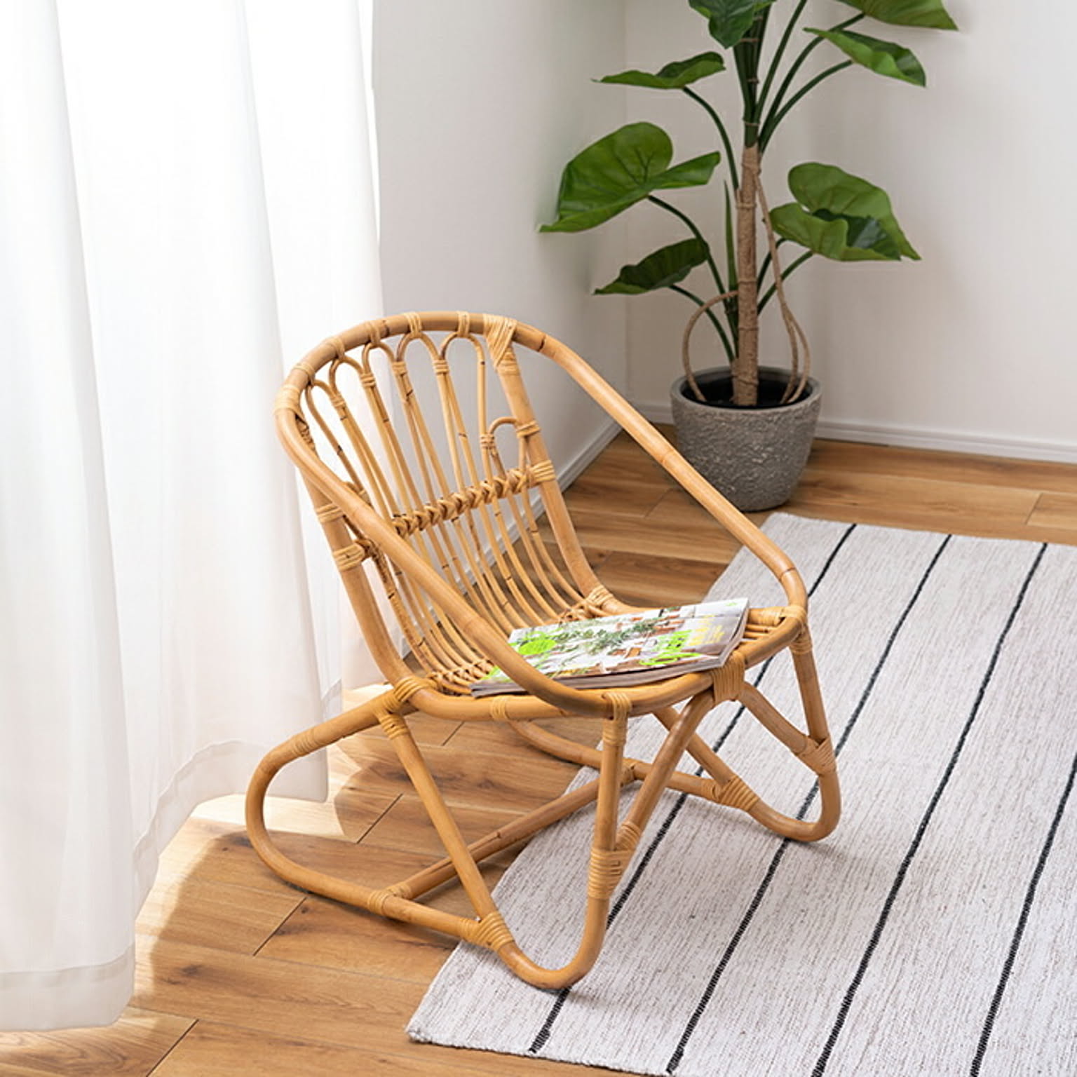 天然素材の優しい風合い。丸みを帯びたコンパクトなラタンチェア。天然ラタンの特徴はしなやかなライン。体のラインにフィットし、包み込まれるような座り心地。天然ラタンのもう一つの特徴は強度が高く非常に軽量なこと。女性でも簡単に持ち運べます。使われている素材は全て天然ラタン。個体差のあるラタンを手作業で丁寧に編み込み作られています。
