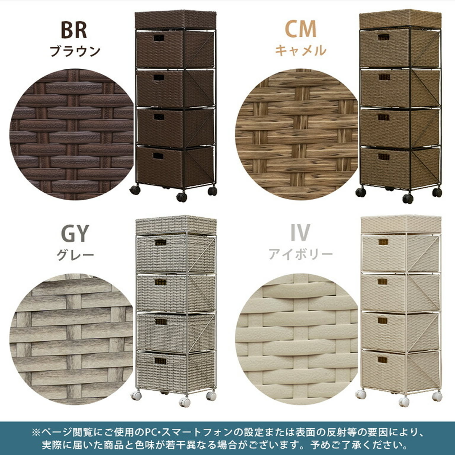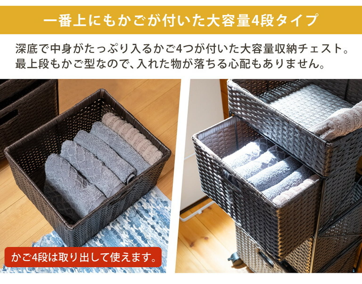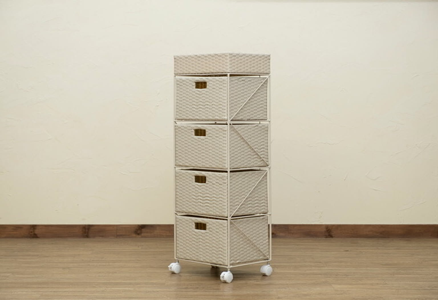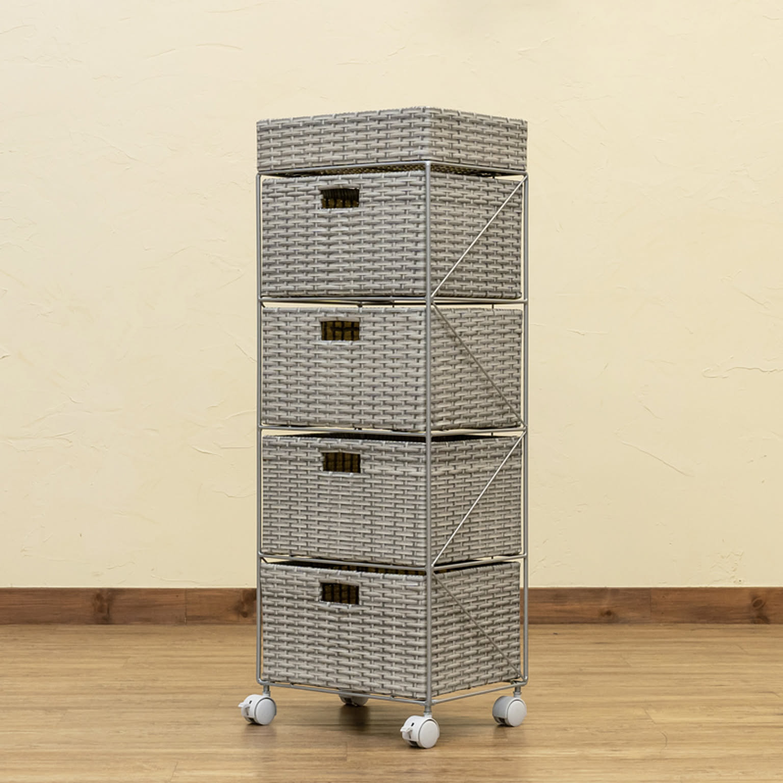 かごは深底で大容量!丈夫な人工ラタン(PE/ポリエチレン)を使用した4段収納チェスト。