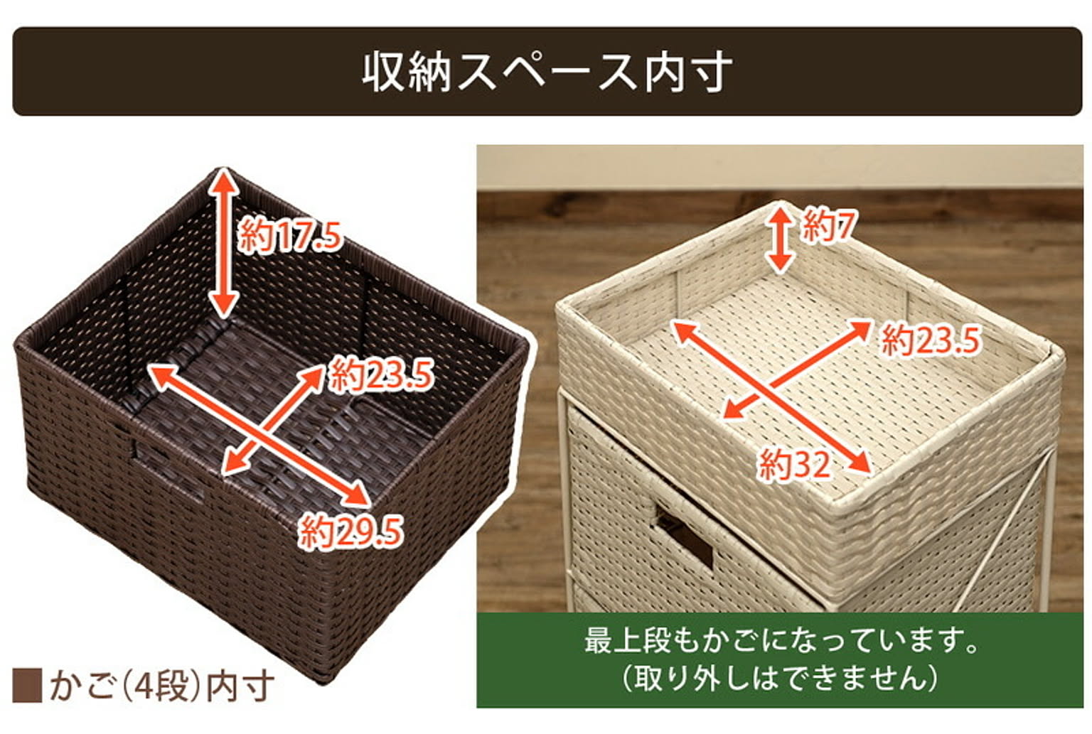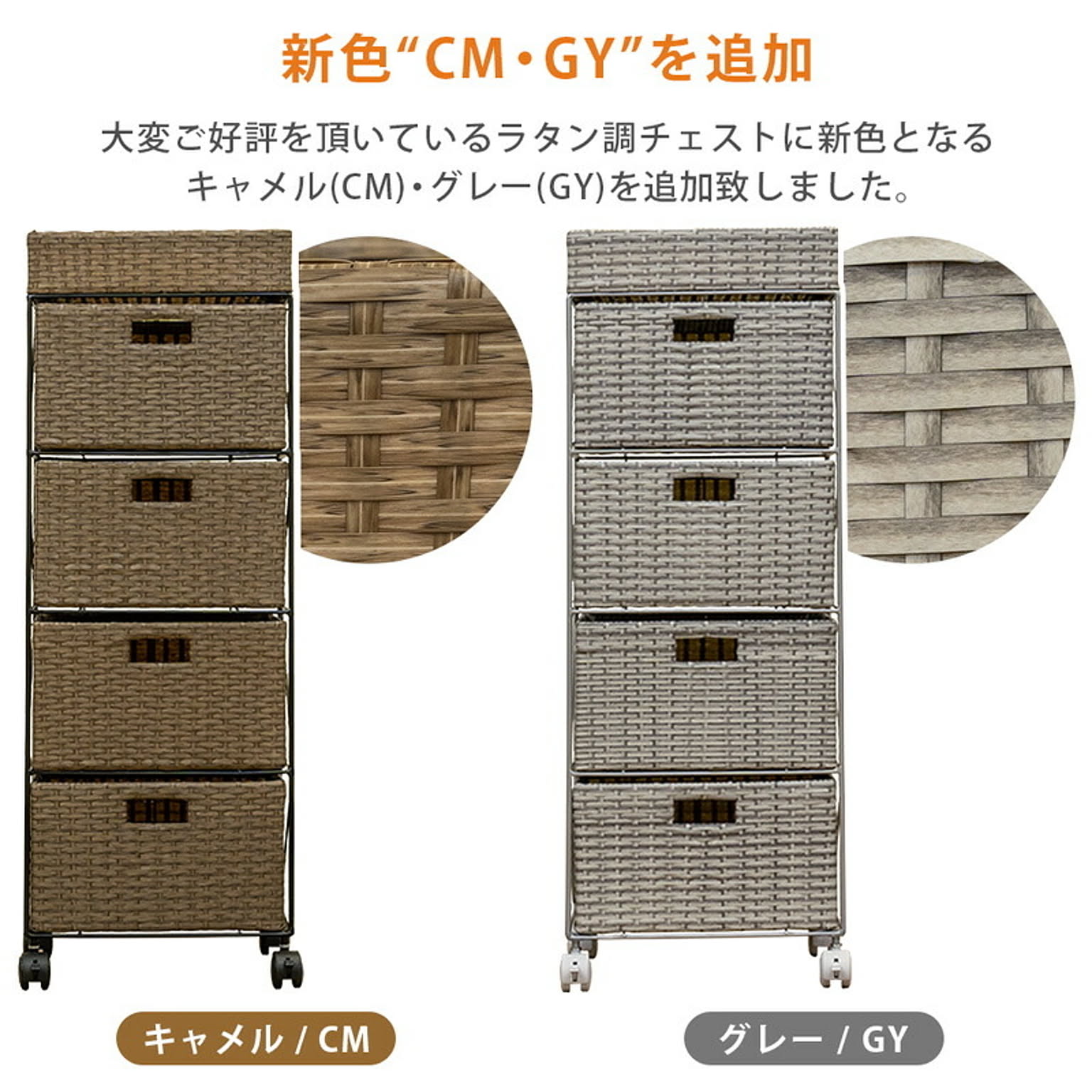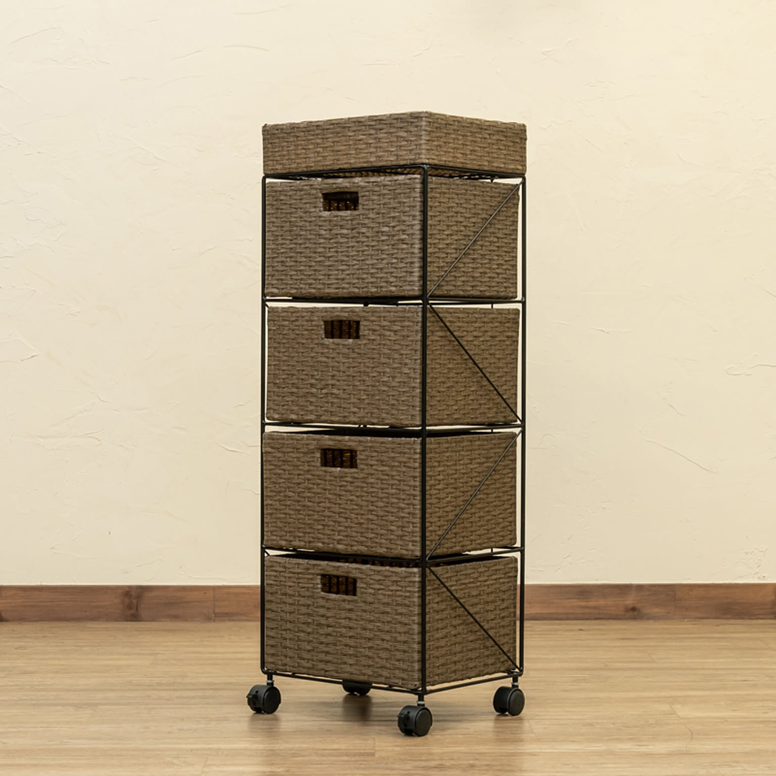 かごは深底で大容量!丈夫な人工ラタン(PE/ポリエチレン)を使用した4段収納チェスト。