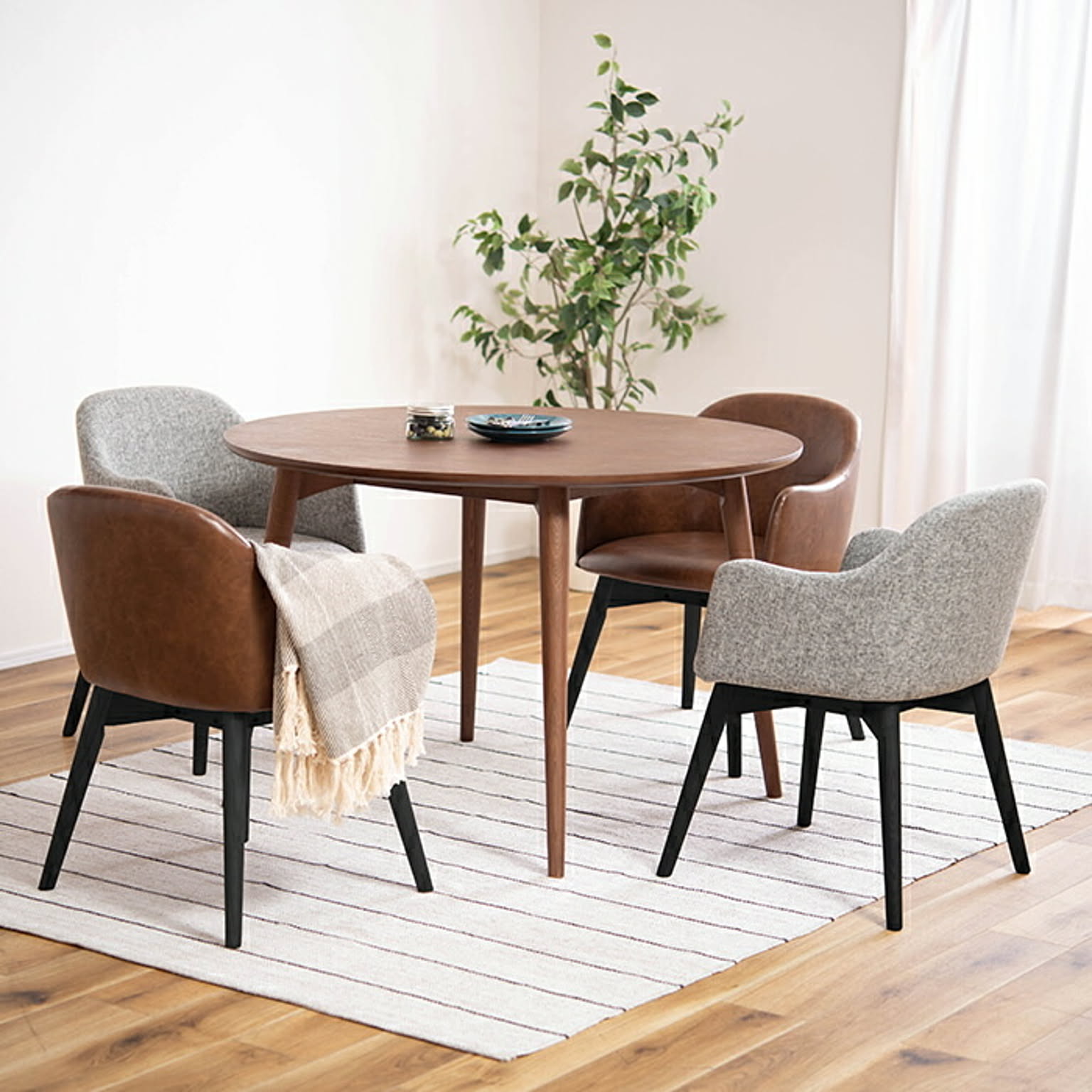 脚部は角を落とし、ハの字に設計することで、優しい印象に。背もたれとアームが一体になったチェアは、曲線を意識したデザインでかわいらしく優しく仕上げています。背もたれとアームが一体になった身体をしっかり支えるダイニングチェア。