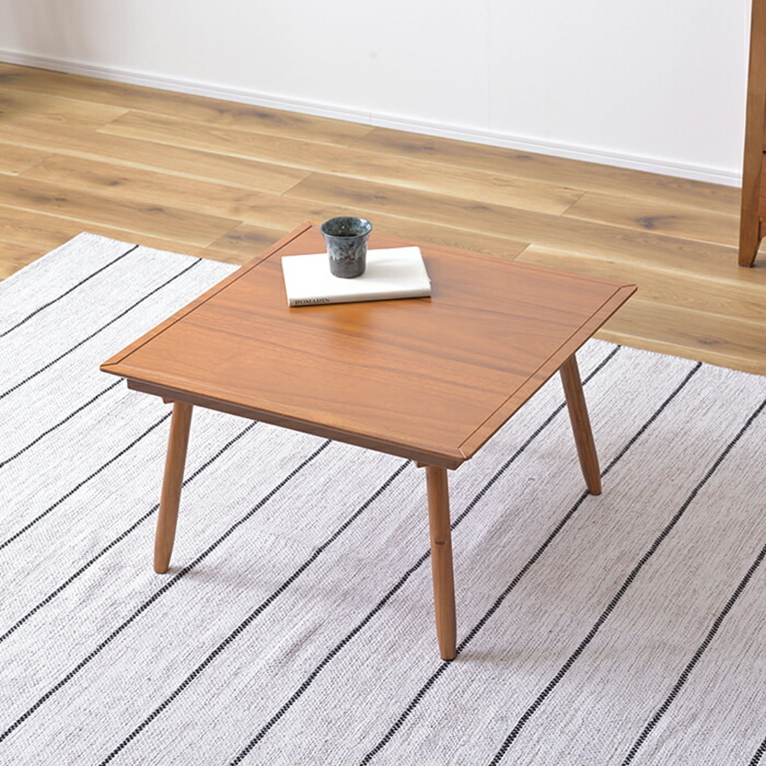 一人使いにちょうど良いコンパクトなコタツテーブル。天然木の風合いや天板のラインなどシンプルでシャープな印象のテーブルです。