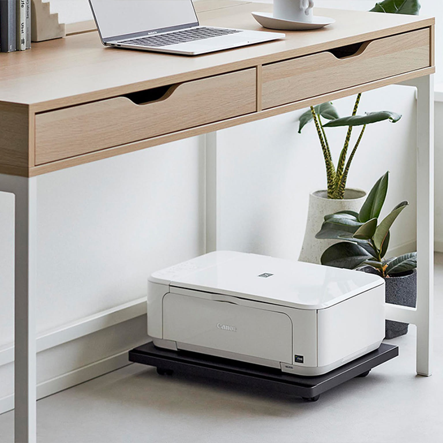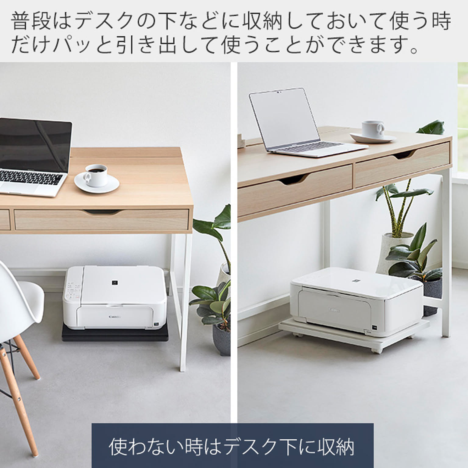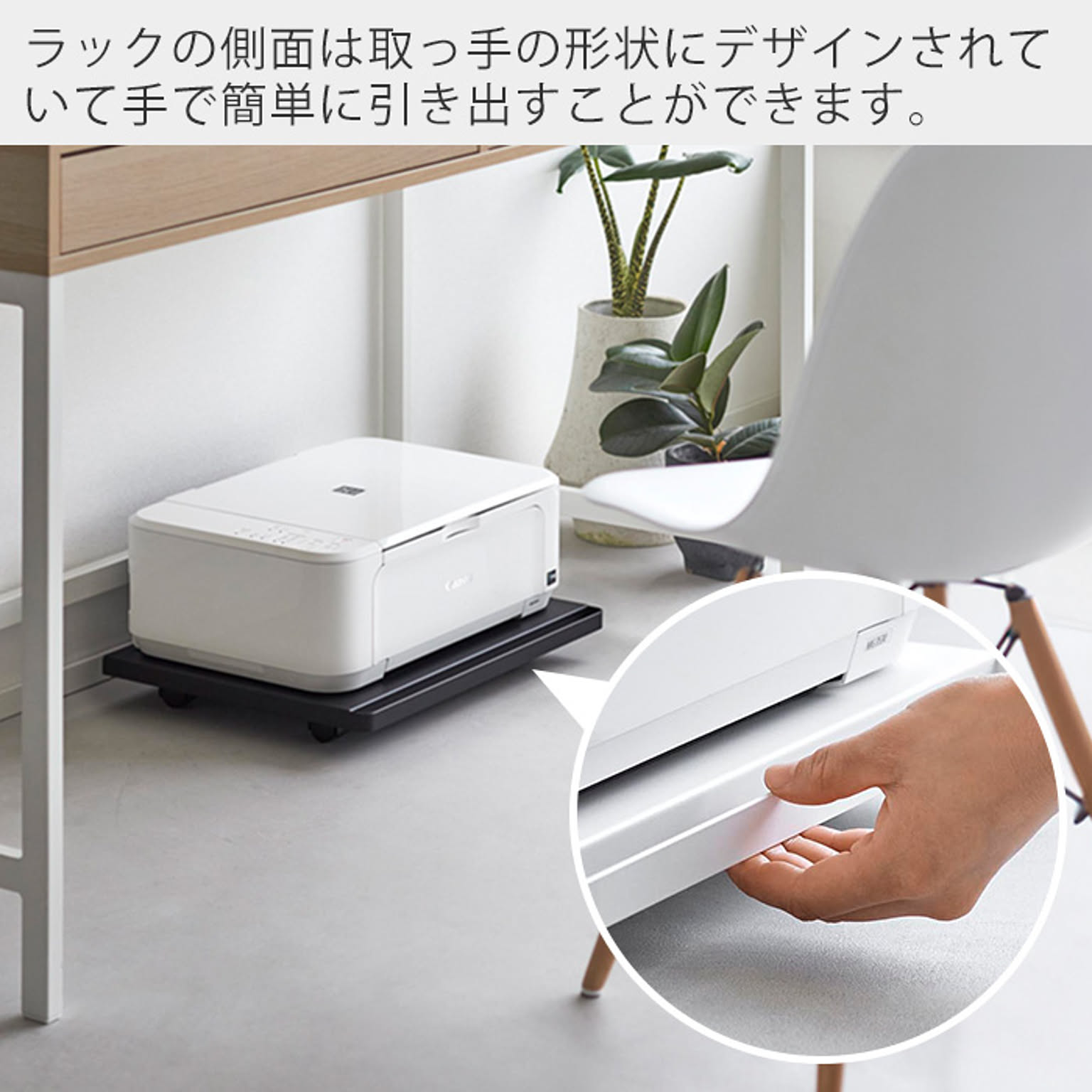 使う時だけ引き出せる便利なキャスター付きのプリンターラック。使わない時はデスク下にすっきり収納することができます。A4プリンターにピッタリのシンプルなラック。キャスター&取っ手付きで移動もスムーズ。加湿器や箱買いした重いドリンク類の収納もおススメです。
