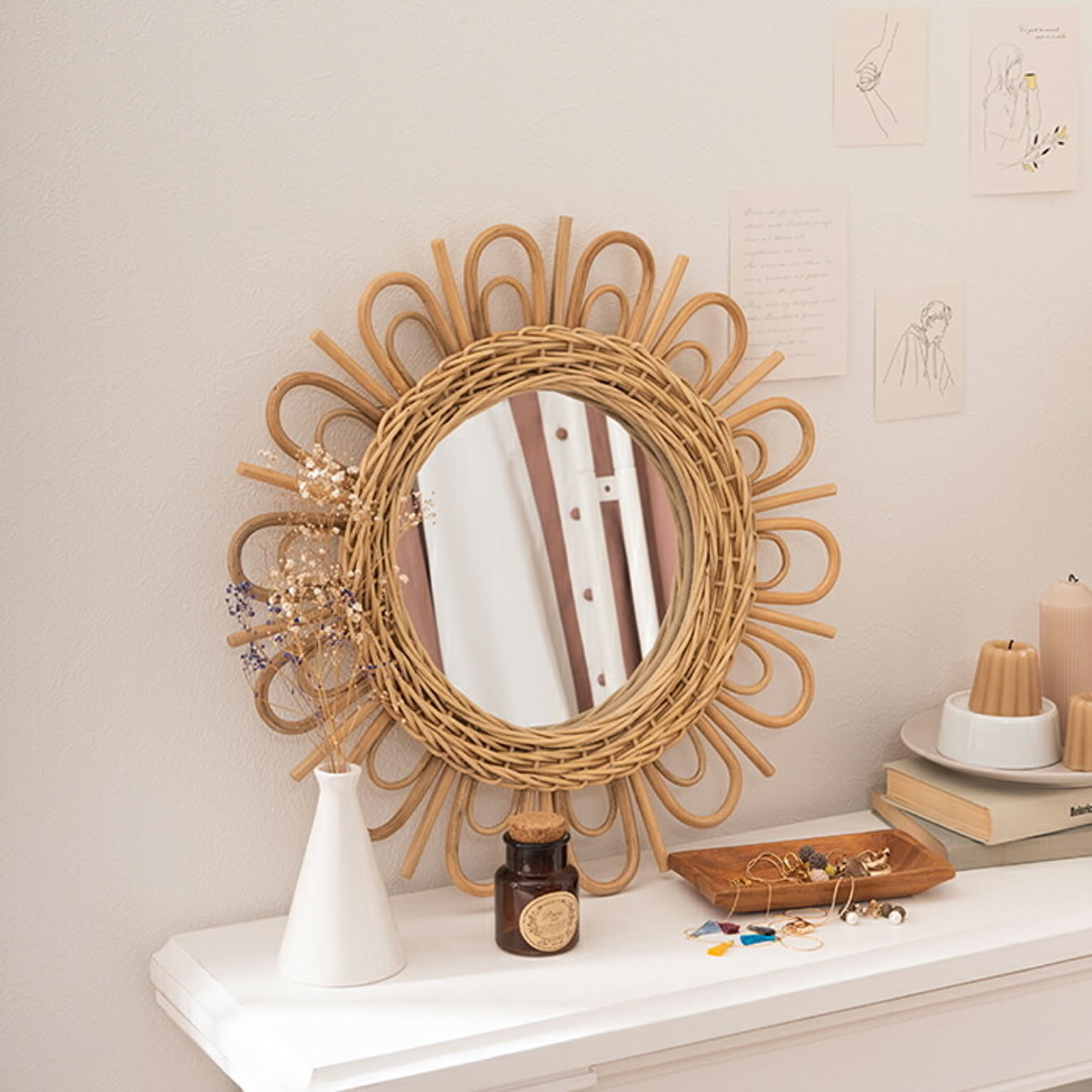 どんなインテリアにも馴染みやすいラタンのミラーは、奥行きが生まれ空間のイメージをガラッと変えてくれます。