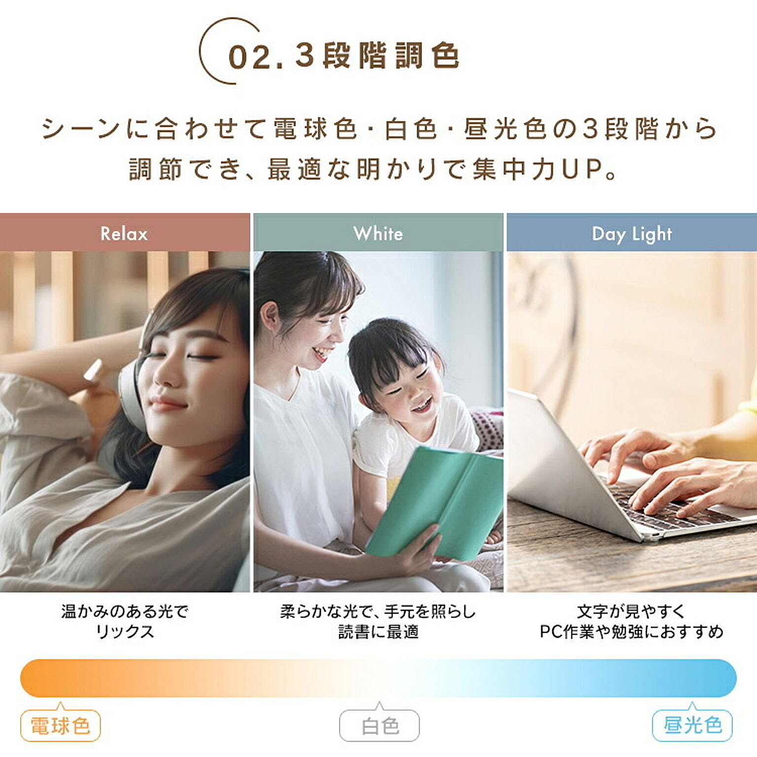 「昼光色・白色・電球色」の3段階で調色可能。シーンに合わせて最適な明かりに切り替えできる。