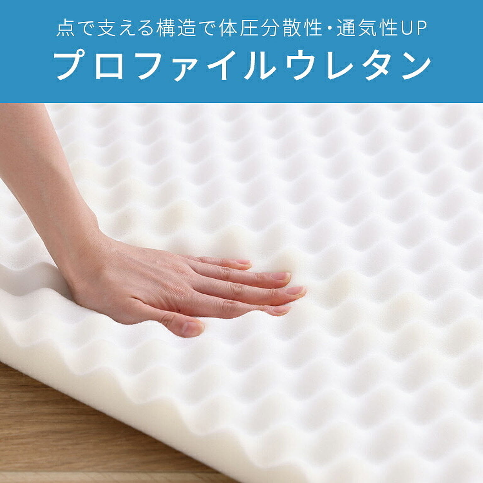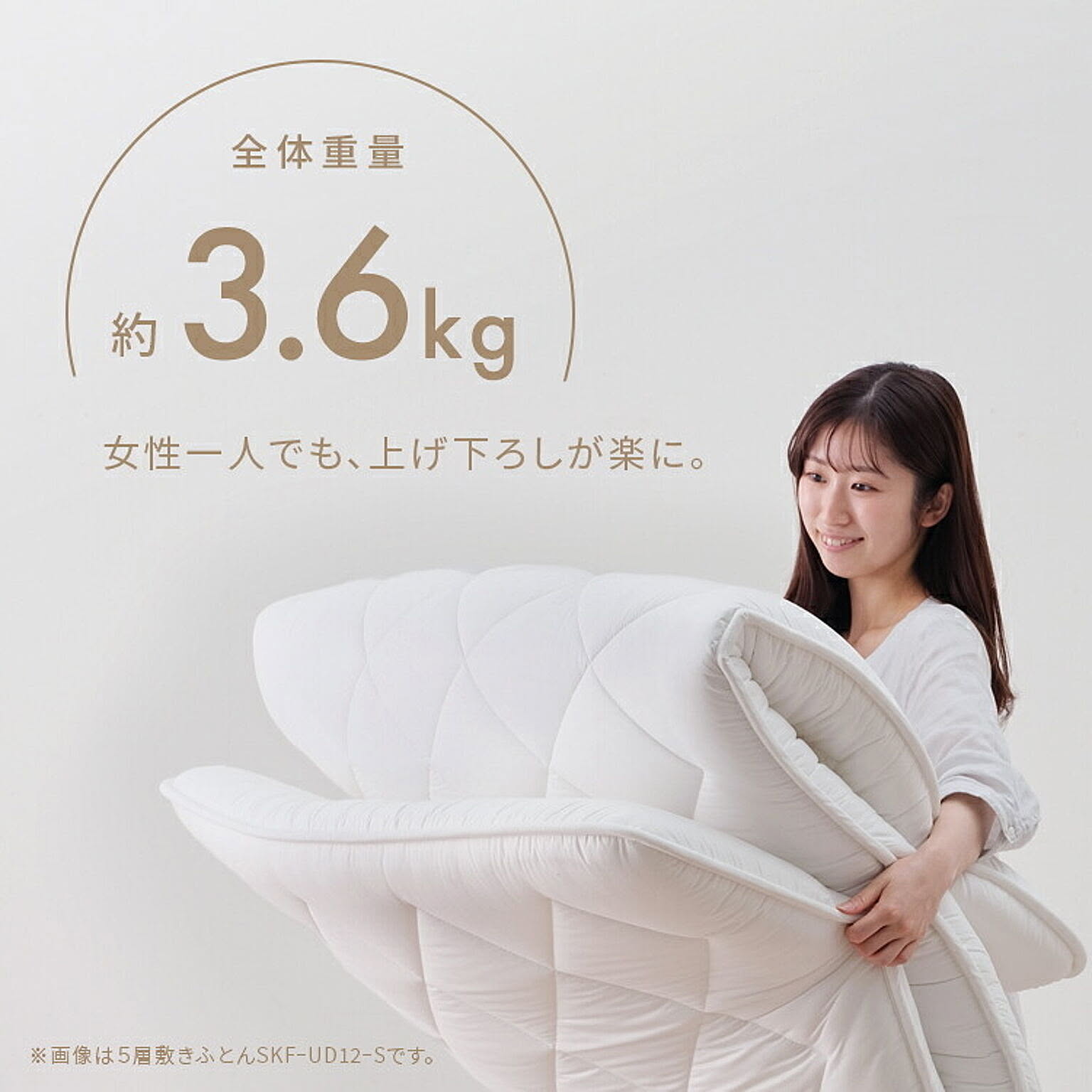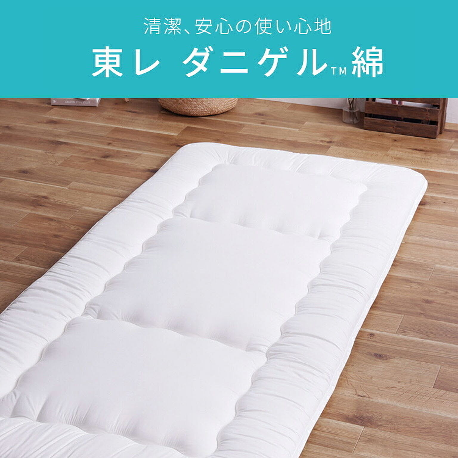 東レわた「ダニゲル™」とプロファイルウレタンを使用した3層構造の敷き布団です。体全体をしっかり支えます。◆上層・下層:東レわたダニゲル™防ダニ・抗菌防臭加工。ダニを寝具に寄せ付けず、快適に保ちます。◆中層:プロファイルウレタン凹凸のある構造で通気性が高く、快適な睡眠をサポート。体にかかる圧力を分散させます。厚さ約8cm。使い勝手のいい敷きふとんです。マットレスに重ねてさらに寝心地アップ。※本製品は洗えません。●規格シングル●商品サイズ(cm)幅約100×奥行約210×高さ約8●商品重量約3.6kg●充填量約3.2kg●材質<側生地>ポリエステル100%<詰め物>上層:ポリエステル100%、中層:ウレタンフォーム、下層:ポリエステル100%●洗濯表示洗濯不可