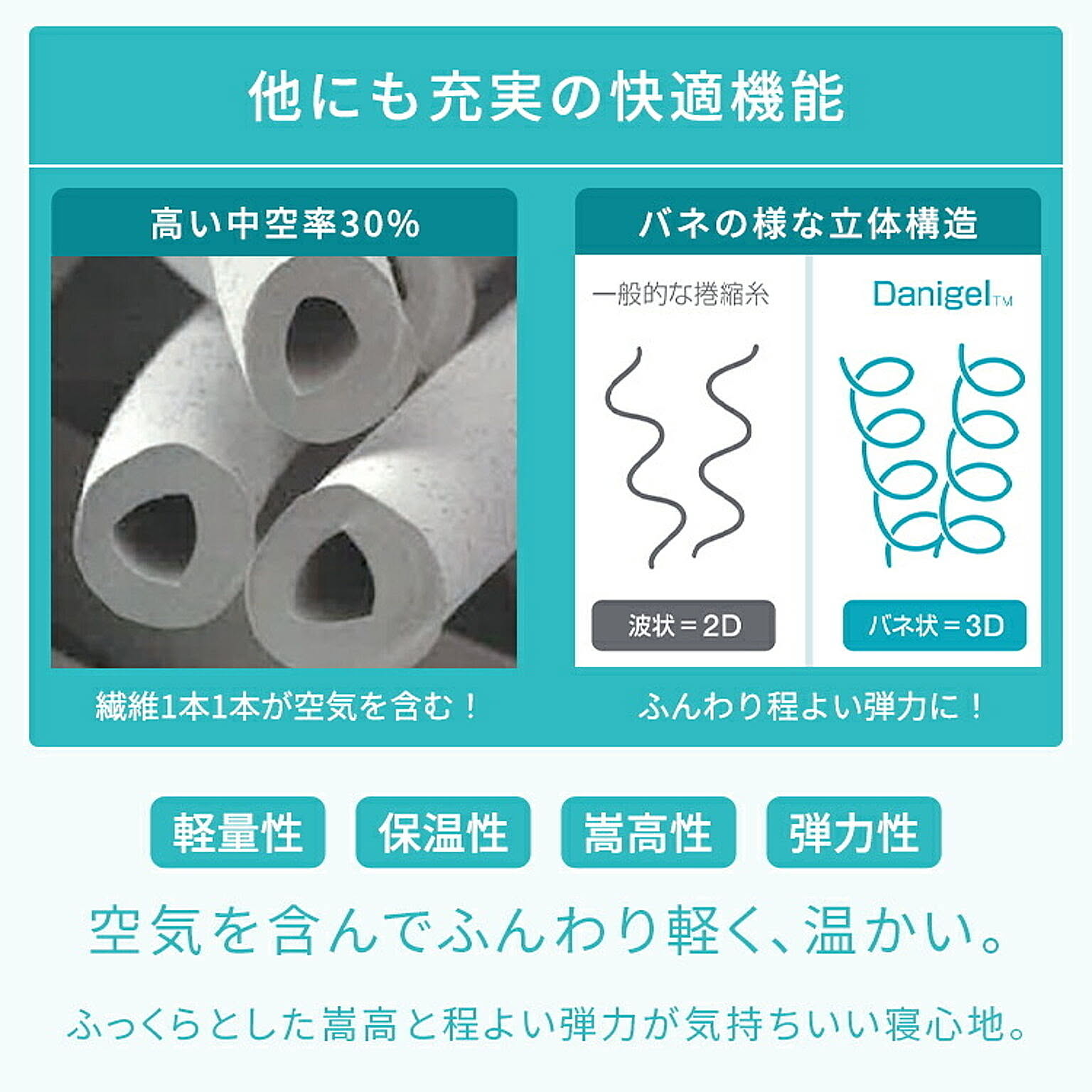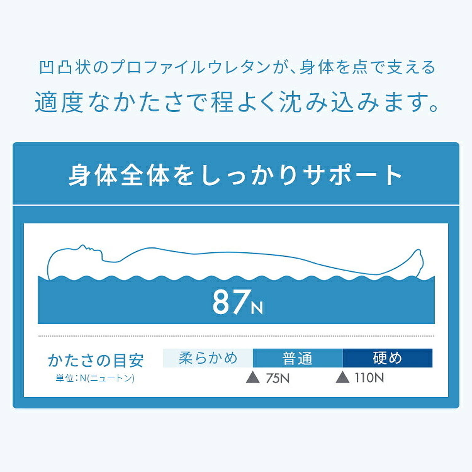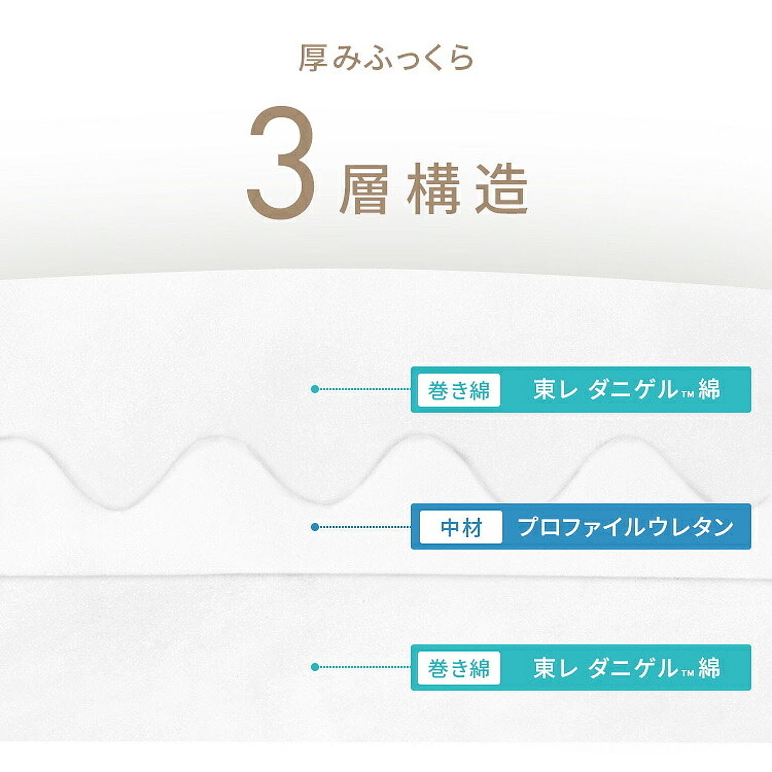東レわた「ダニゲル™」とプロファイルウレタンを使用した3層構造の敷き布団です。体全体をしっかり支えます。◆上層・下層:東レわたダニゲル™防ダニ・抗菌防臭加工。ダニを寝具に寄せ付けず、快適に保ちます。◆中層:プロファイルウレタン凹凸のある構造で通気性が高く、快適な睡眠をサポート。体にかかる圧力を分散させます。厚さ約8cm。使い勝手のいい敷きふとんです。マットレスに重ねてさらに寝心地アップ。※本製品は洗えません。●規格シングル●商品サイズ(cm)幅約100×奥行約210×高さ約8●商品重量約3.6kg●充填量約3.2kg●材質<側生地>ポリエステル100%<詰め物>上層:ポリエステル100%、中層:ウレタンフォーム、下層:ポリエステル100%●洗濯表示洗濯不可