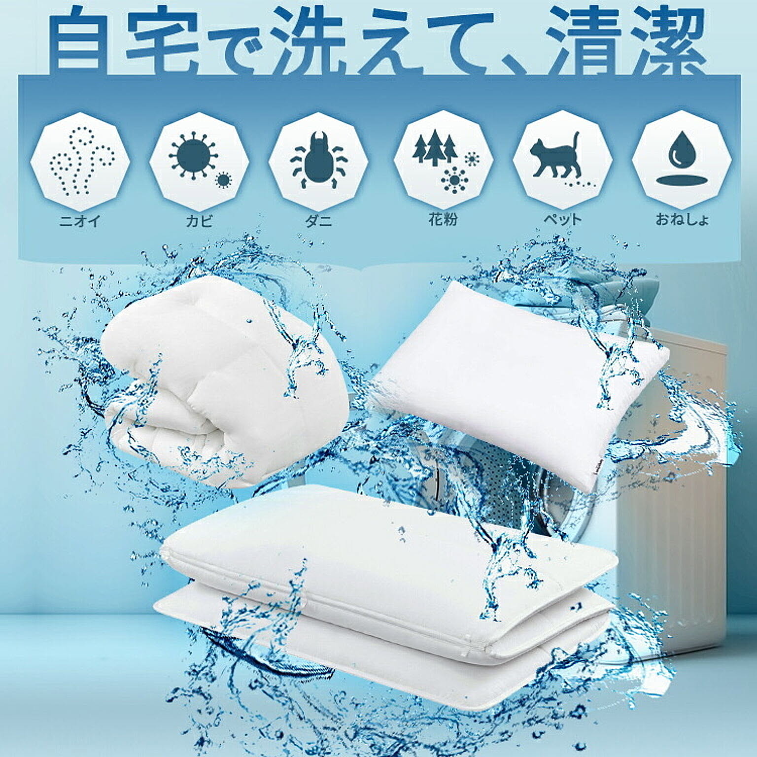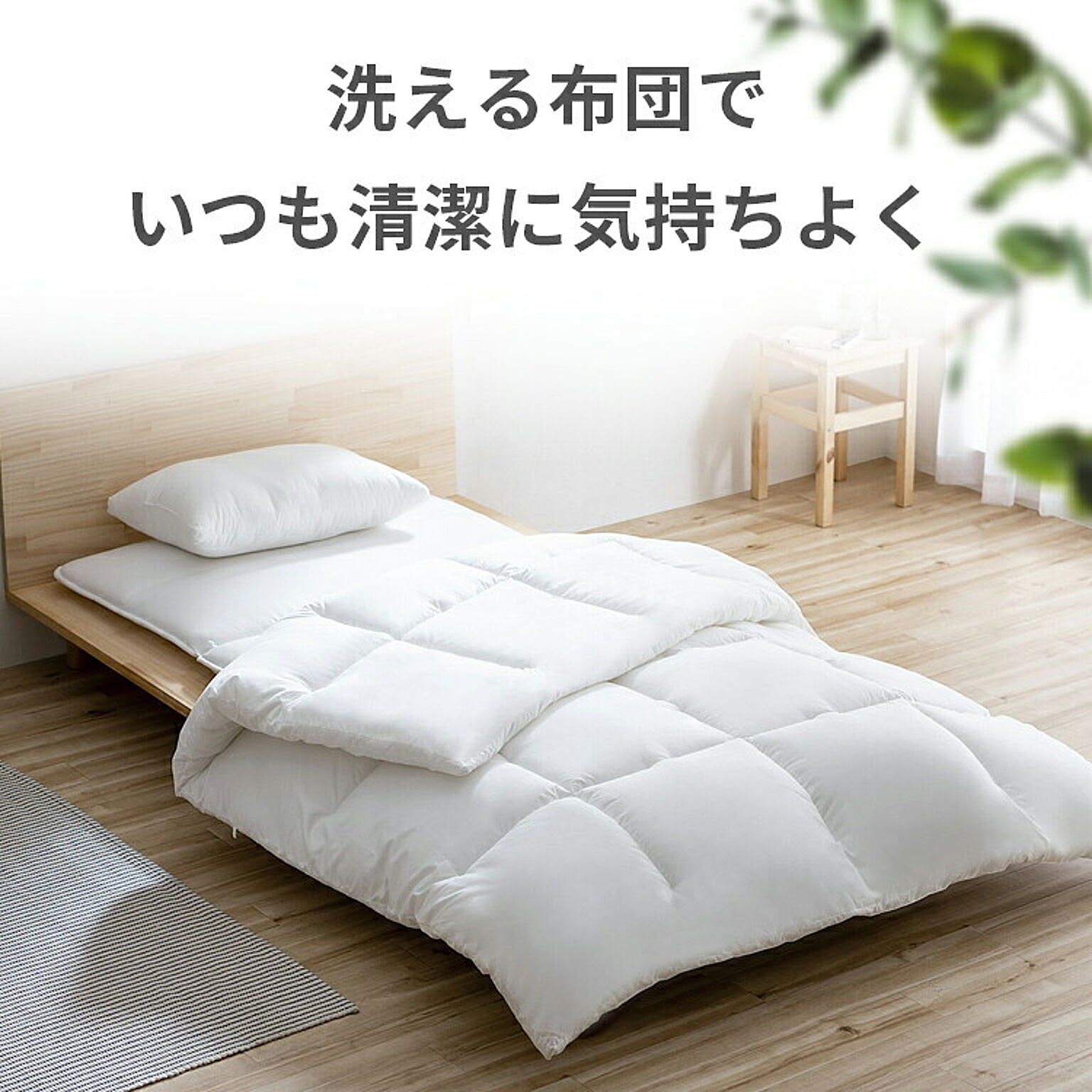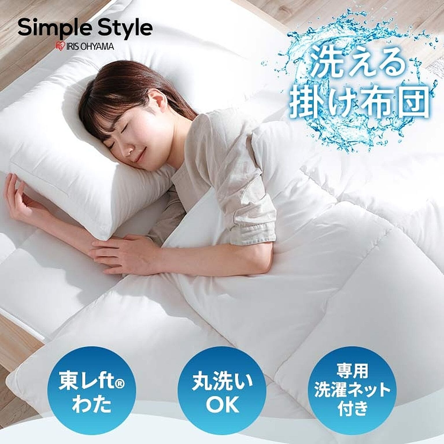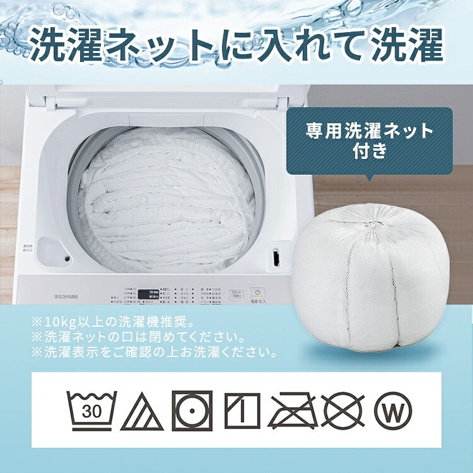 専用洗濯ネット付きの洗える掛け布団です。いつも清潔に気持ちよく。洗い効果を高める2つの仕様。◆通水しやすいマチ洗濯時に水が入りやすく、竿に干した時も水気が出やすい。◆ジャンプキルトキルトステッチを飛ばすことでマス目間で水が行き来しやすい。ふんわり柔らかな寝心地。◆東レft®わた使用中空繊維が空気を含み保温性があり、軽量。弾力に富み、保温性に優れています。※詰め物の50%に使用【洗い方】・付属の専用洗濯ネットを使用し、説明書に記載の折畳み方で布団をネットに入れ、洗濯してください。・洗濯機や布団の破損、事故を防ぐため、洗濯機の容量、洗い方については洗濯機の説明書に従い洗濯ください。・洗濯機から取り出す際は、洗濯ネットの口を開け、布団のみを取り出してください。(ネットごと無理に取り出そうとすると、ネットが破損するおそれがあります)【干し方】・十分に脱水してから形を整え吊干ししてください。・タンブラー乾燥時は、ネットから布団を取出し、中温程度(約60℃)でご使用ください。●製品サイズ(cm)ダブルサイズ:幅約190×奥行
