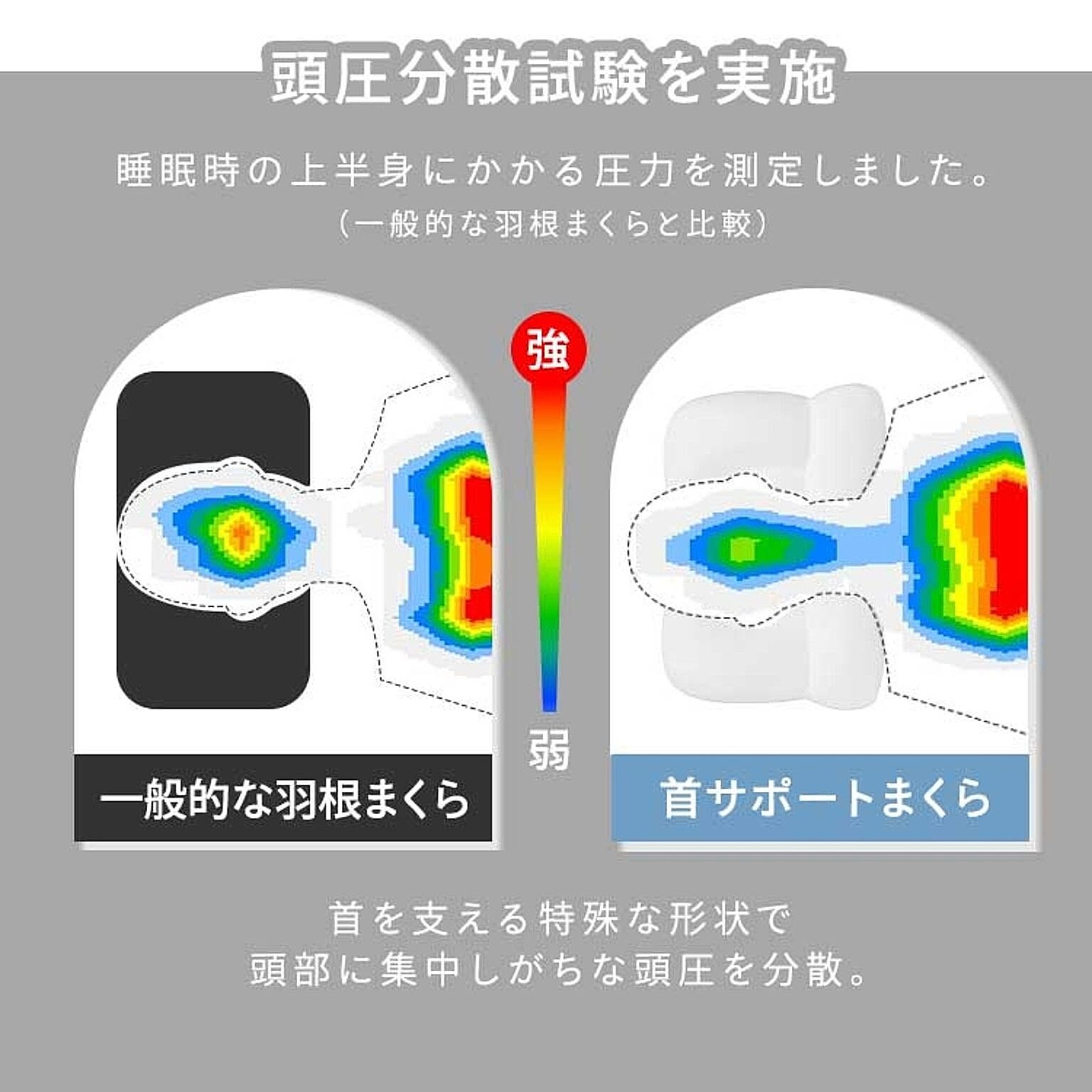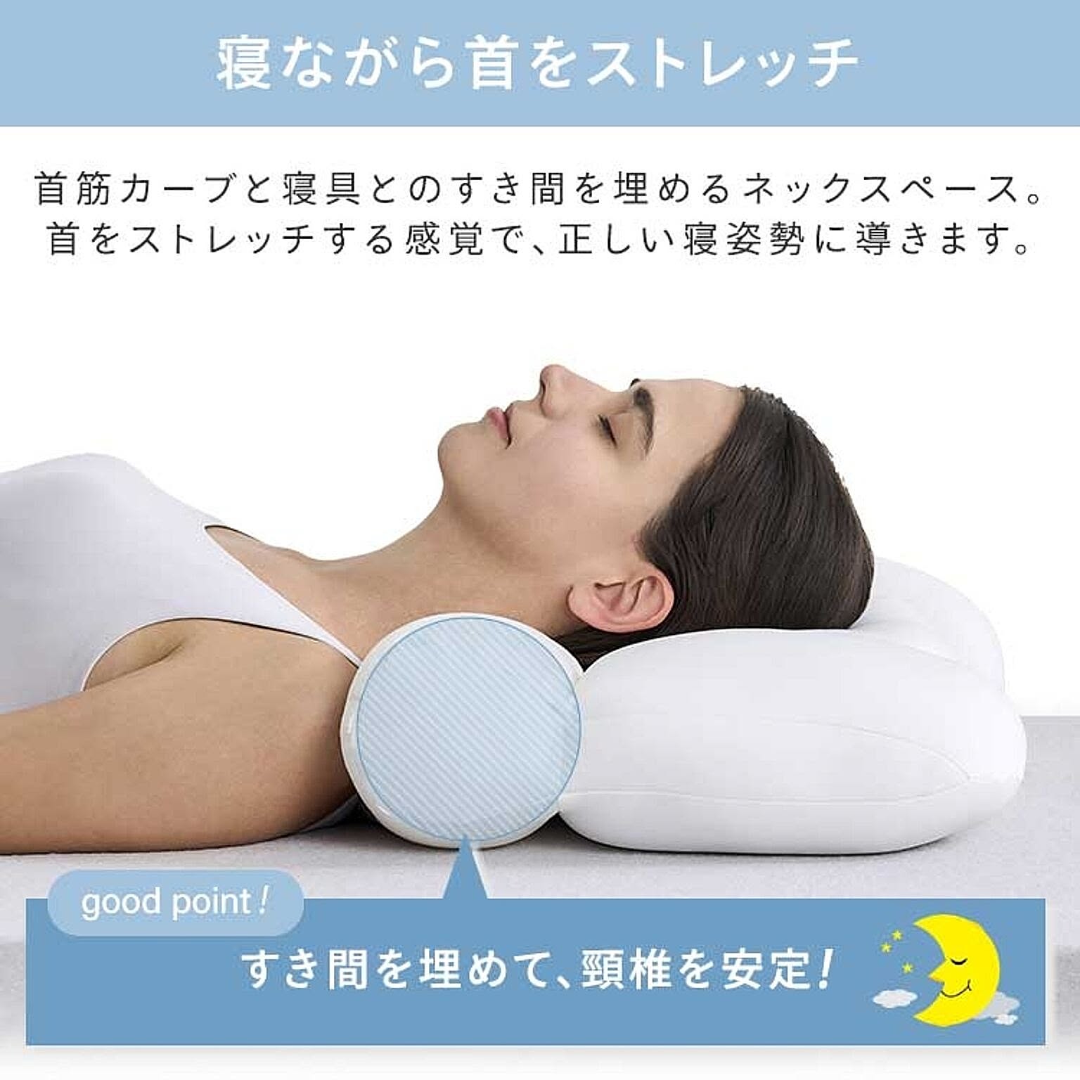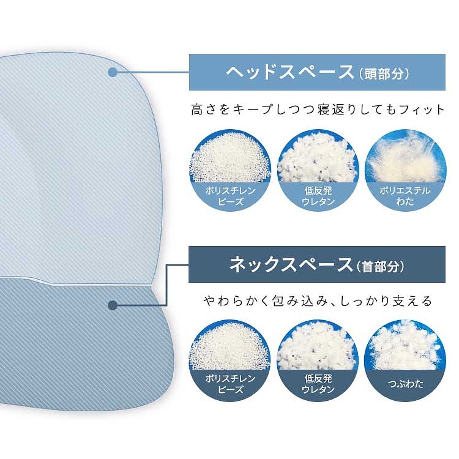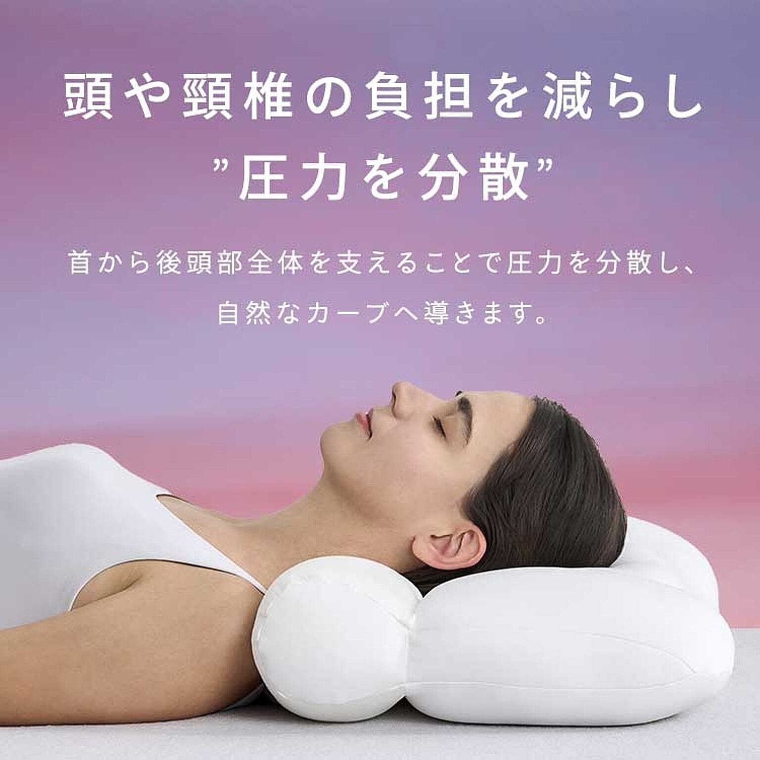 包み込まれるようなフィット感。頭と首全体にフィットし、快適な睡眠へ。ストレートネックにお悩みの方におすすめ。首から後頭部全体を支えます。本来の首のカーブを優しくサポートする形状。寝ながら首をストレッチ。充填物を部位に合わせて配合。◆ヘッドスペース(頭部分)高さをキープしつつ、寝返りしてもフィットする素材[ポリスチレンビーズ・低反発ウレタン・ポリエルテルわた]◆ネックスペース(首部分)やわらかく包み込み、しっかり支える素材[ポリスチレンビーズ・低反発ウレタン・つぶわた]●商品サイズ(cm)幅約45×奥行約58×高さ約10※枕カバーはサイズ43×63cm以上の伸びる素材をご使用ください●商品質量約660g●組成<側生地>頭部:ポリエステル89%、ポリウレタン11%マチ:ポリエステル100%頸部:レーヨン95%、ポリウレタン5%<詰め物>ポリスチレンビーズ、ウレタンフォーム、ポリエステルわた●お手入れ方法本製品は洗えません。汚れた場合は、湿ったタオル等で汚れた部分をつまんで拭き取ってください。