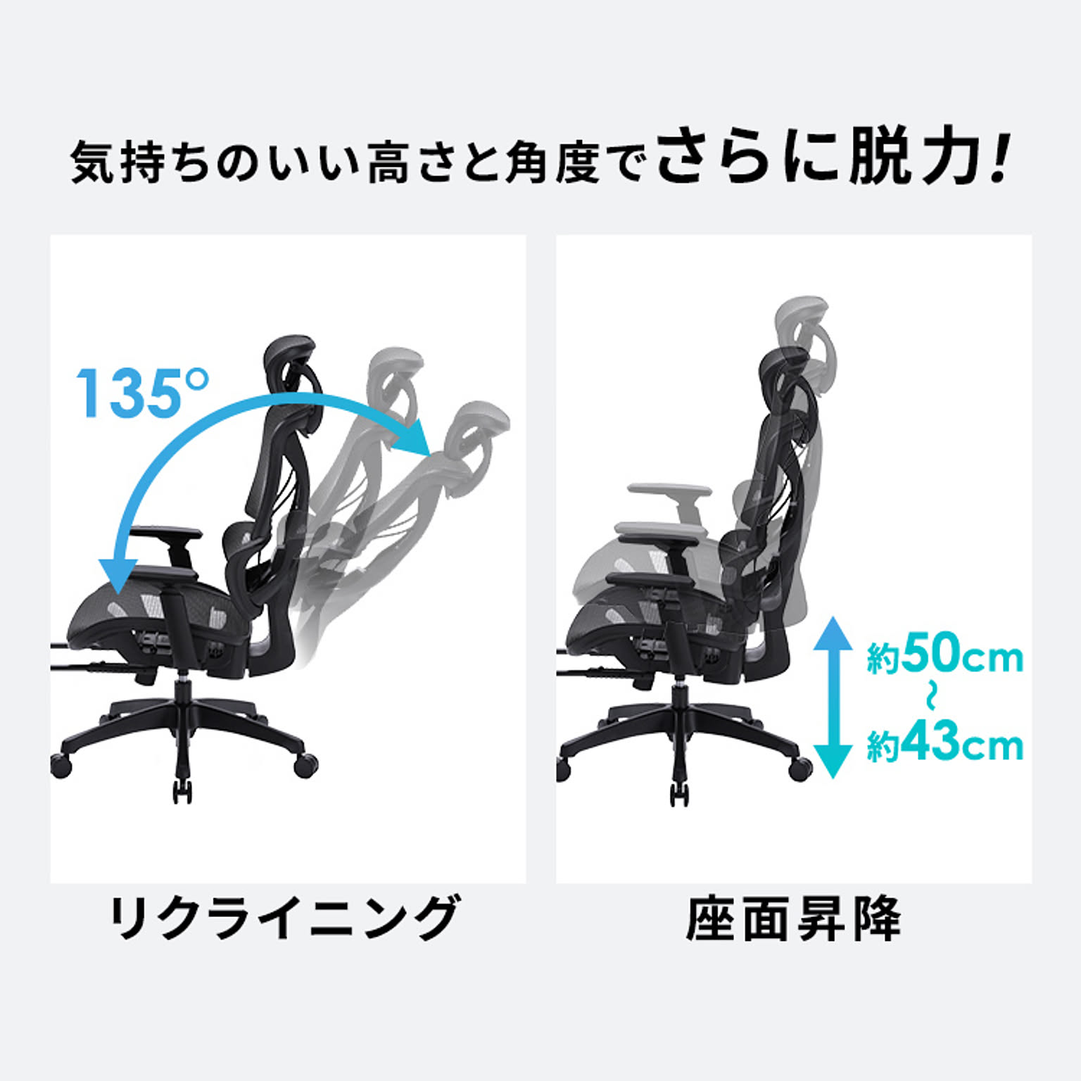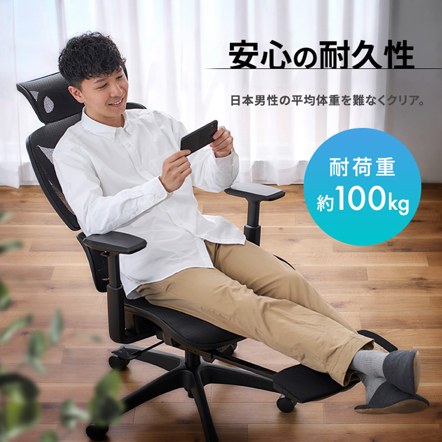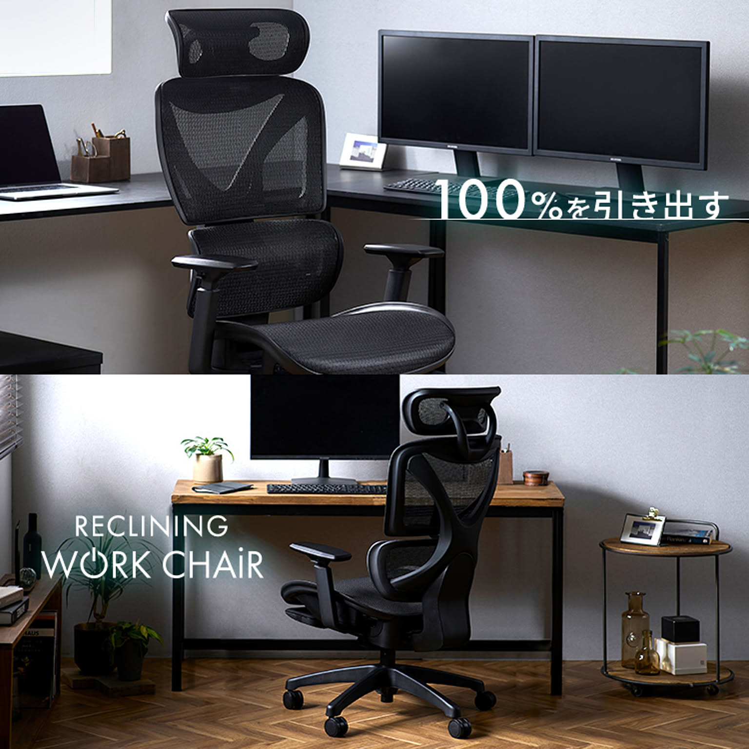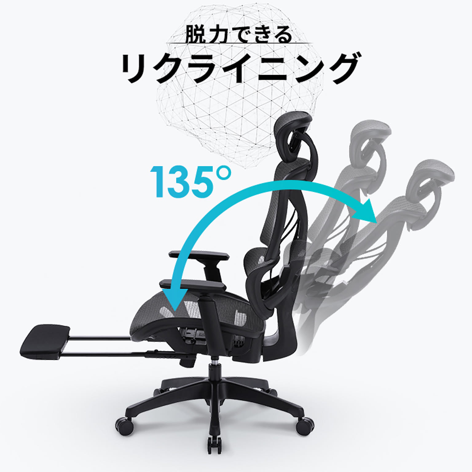 仕事中も休憩中も身体はずっと楽でいたい。長時間の作業をサポートするリクライニング機能チェア。◆可動式ヘッドレスト角度と高さを調節できるヘッドレスト。首への負担を軽減。◆収納式フットレスト足をのせて全身リラックス。使わない時は閉まっておける、フットレスト。◆可動式アームレスト上下・前後・左右で調節できるアームレスト。◆ランバーサポート人間の骨格に沿った、S字形状が腰への負担を軽減。◆360°回転360°くるっと回転できるので、座ったまま向きを変えやすく作業範囲が広がる。◆ウレタンキャスター床に傷がつきにくく静かなウレタン素材。フローリングで使用したい方にオススメ。むれずに快適!抜群の通気性と速乾性を持ち合わせたナイロン素材の全面メッシュ。疲れにくい弾力座面。適度な弾力と傾斜のついた座面が正しい姿勢へ導き疲れにくい。安心の耐久性。耐荷重約100kg。強度の高いスチール脚を防食性のあるエポキシ樹脂で塗装。付属の六角レンチで簡単組み立て。★お客様組立★●商品サイズ(cm)幅約70×奥行約70〜133×高さ約113.5〜121●座面高さ(cm)約43〜50●耐荷重約100kg●主要材質張り材:ナイロン・ポリエステル背もたれ・座面:ポリプロピレン肘掛け:ナイロン・ポリウレタン脚部:スチール(エポキシ樹脂塗装)・ナイロンキャスター:ナイロン・ポリウレタン※耐荷重は測定値であり、保証値ではありません