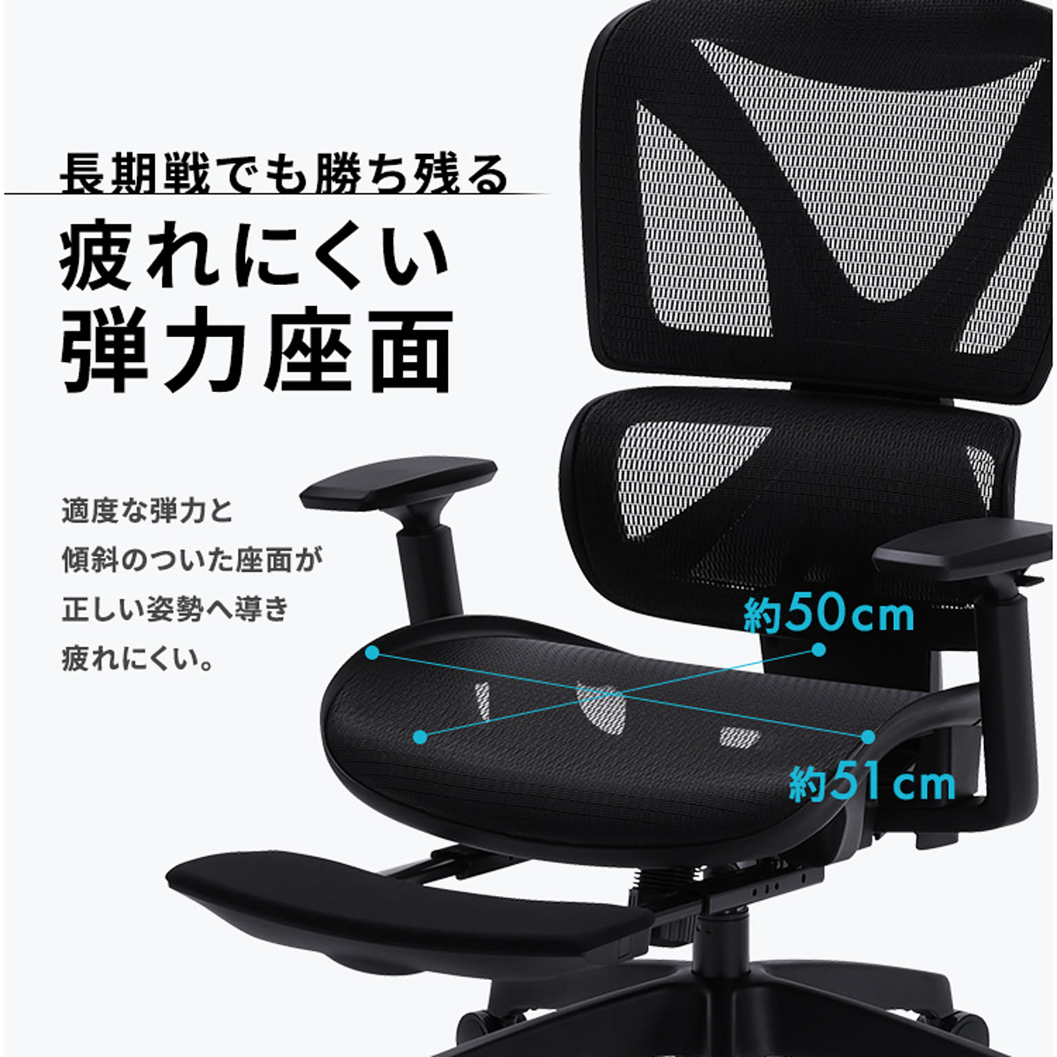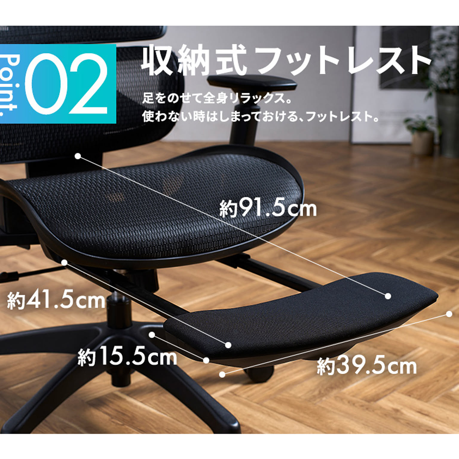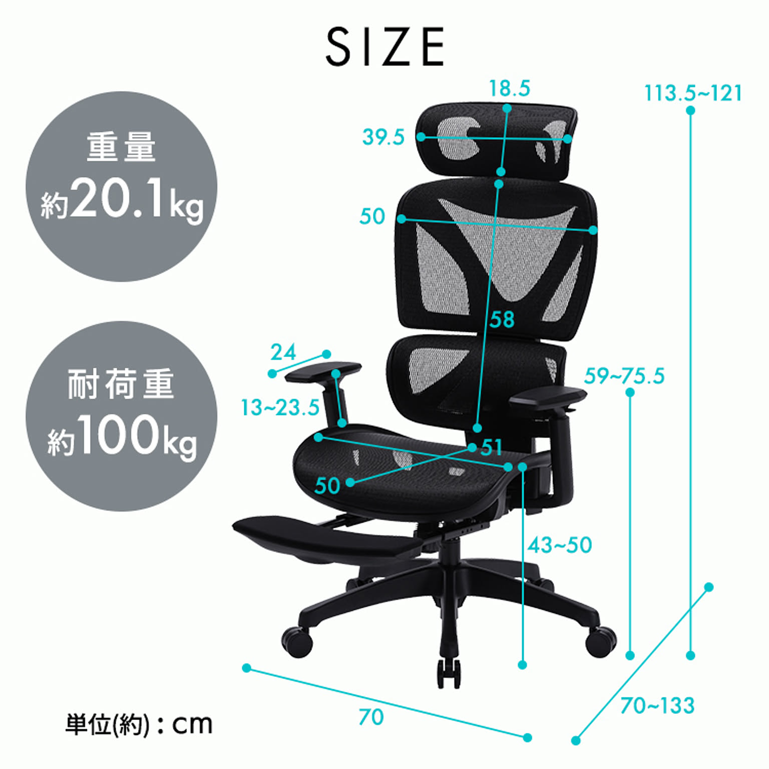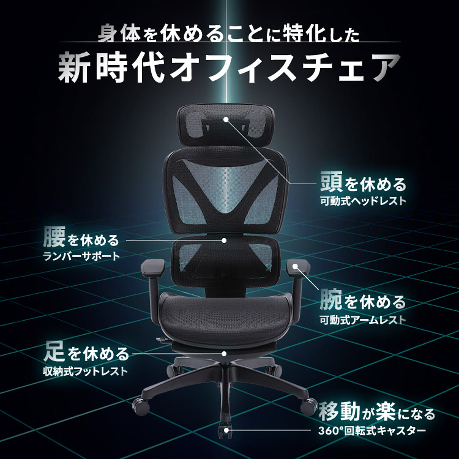 仕事中も休憩中も身体はずっと楽でいたい。長時間の作業をサポートするリクライニング機能チェア。◆可動式ヘッドレスト角度と高さを調節できるヘッドレスト。首への負担を軽減。◆収納式フットレスト足をのせて全身リラックス。使わない時は閉まっておける、フットレスト。◆可動式アームレスト上下・前後・左右で調節できるアームレスト。◆ランバーサポート人間の骨格に沿った、S字形状が腰への負担を軽減。◆360°回転360°くるっと回転できるので、座ったまま向きを変えやすく作業範囲が広がる。◆ウレタンキャスター床に傷がつきにくく静かなウレタン素材。フローリングで使用したい方にオススメ。むれずに快適!抜群の通気性と速乾性を持ち合わせたナイロン素材の全面メッシュ。疲れにくい弾力座面。適度な弾力と傾斜のついた座面が正しい姿勢へ導き疲れにくい。安心の耐久性。耐荷重約100kg。強度の高いスチール脚を防食性のあるエポキシ樹脂で塗装。付属の六角レンチで簡単組み立て。★お客様組立★●商品サイズ(cm)幅約70×奥行約70〜133×高さ約113.5〜121●座面高さ(cm)約43〜50●耐荷重約100kg●主要材質張り材:ナイロン・ポリエステル背もたれ・座面:ポリプロピレン肘掛け:ナイロン・ポリウレタン脚部:スチール(エポキシ樹脂塗装)・ナイロンキャスター:ナイロン・ポリウレタン※耐荷重は測定値であり、保証値ではありません