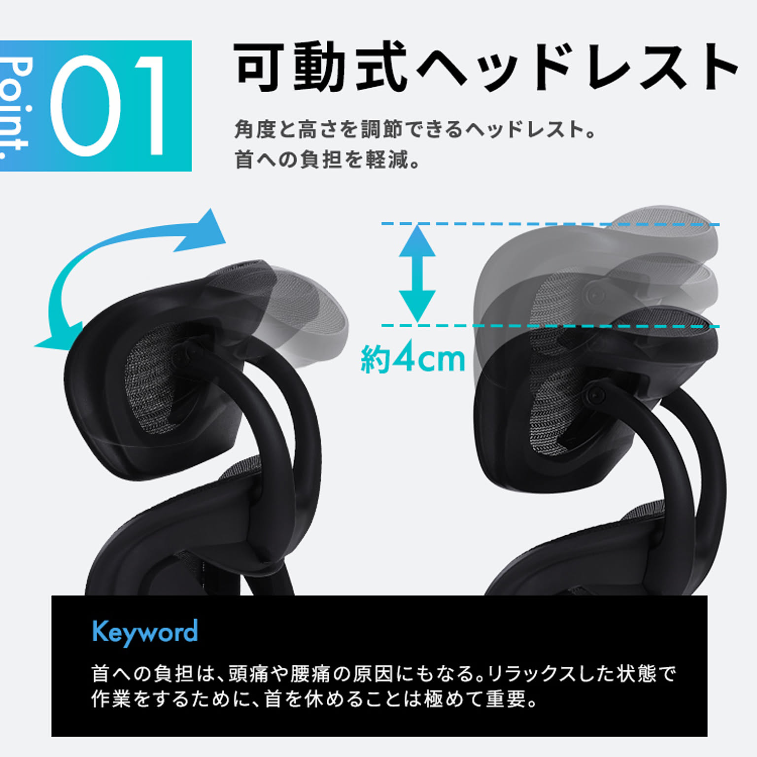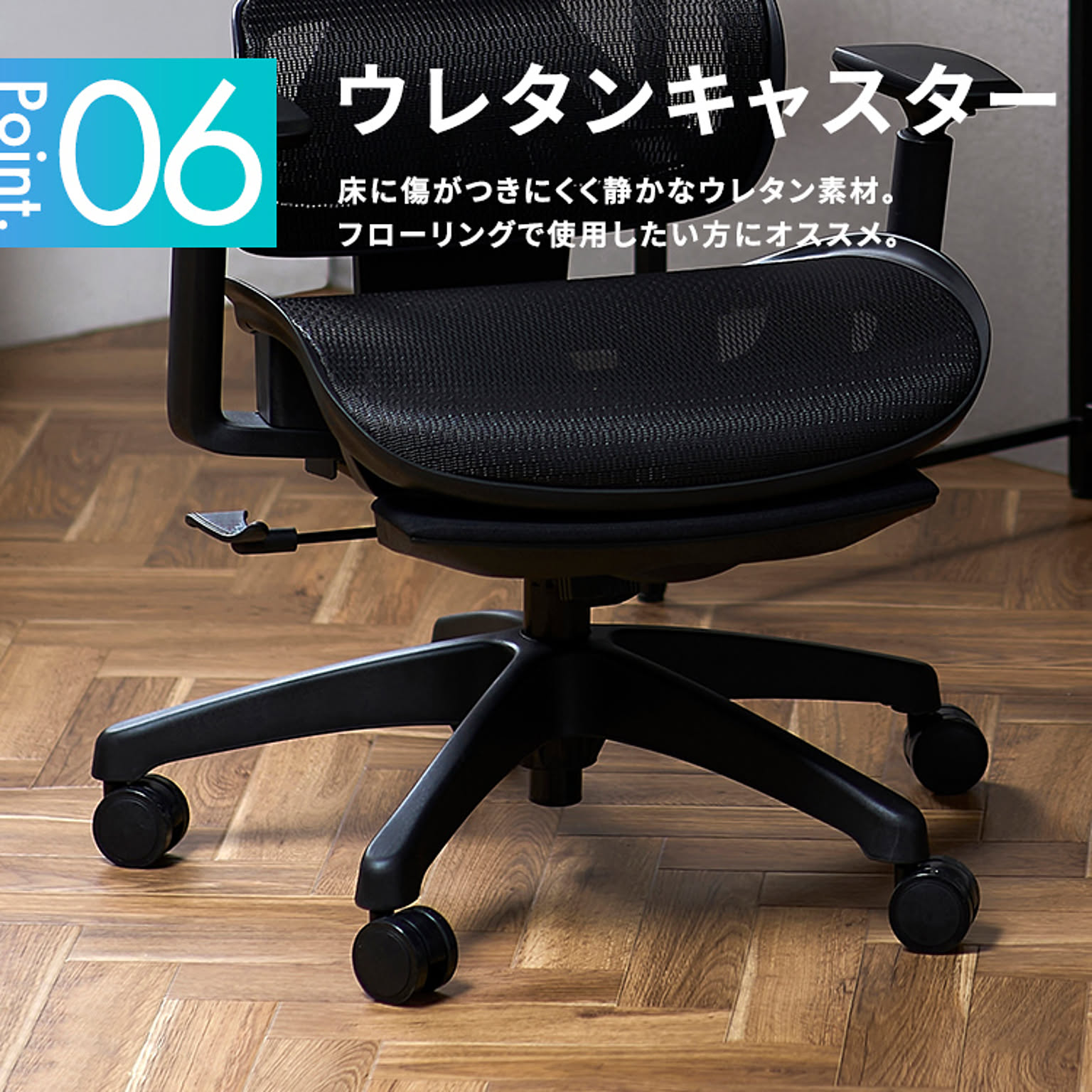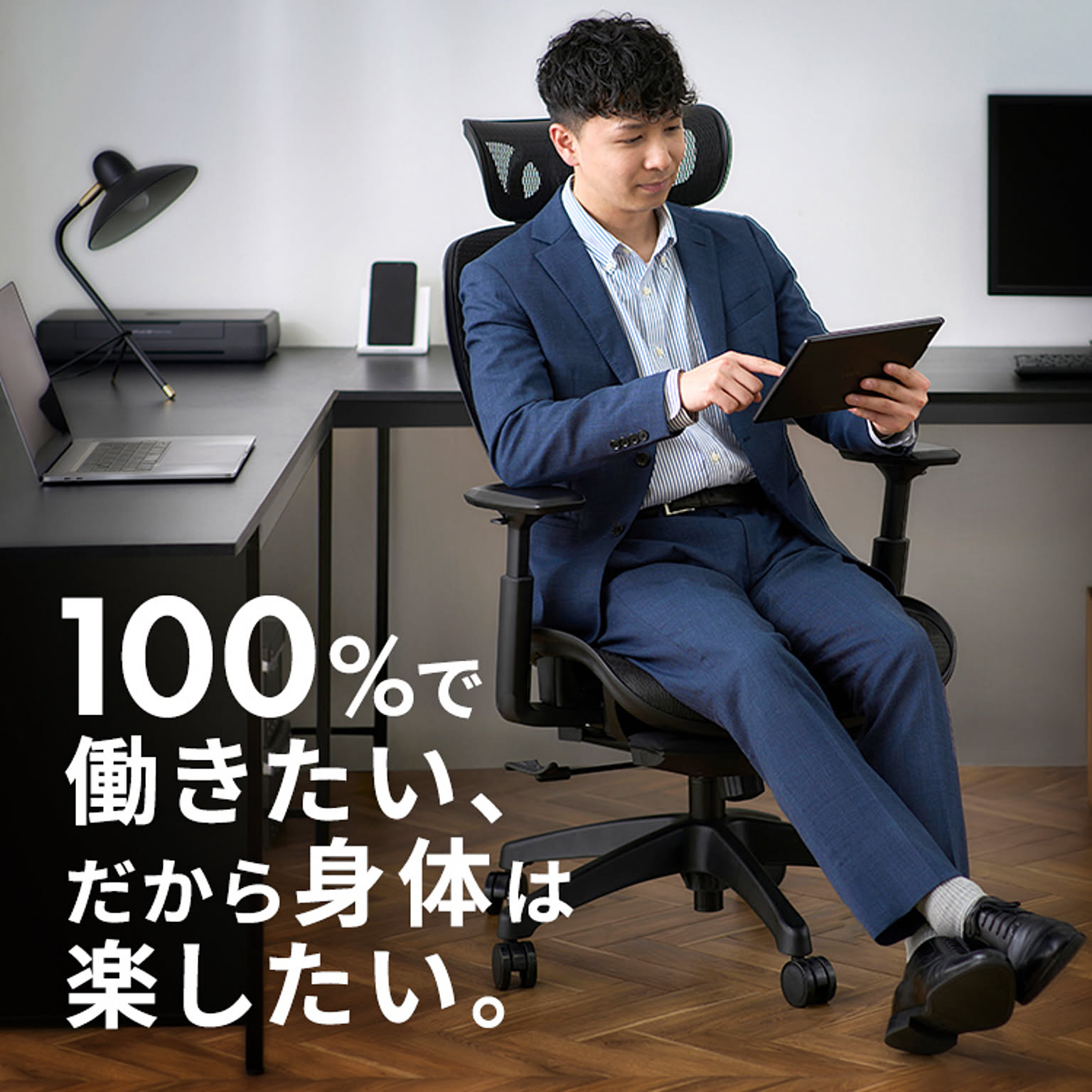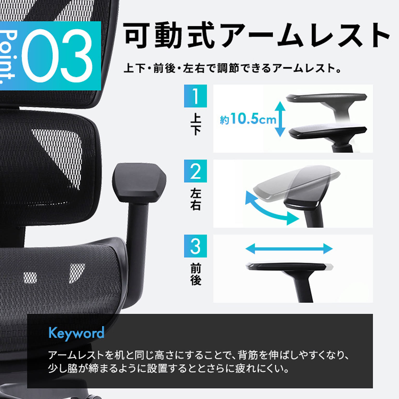 仕事中も休憩中も身体はずっと楽でいたい。長時間の作業をサポートするリクライニング機能チェア。◆可動式ヘッドレスト角度と高さを調節できるヘッドレスト。首への負担を軽減。◆収納式フットレスト足をのせて全身リラックス。使わない時は閉まっておける、フットレスト。◆可動式アームレスト上下・前後・左右で調節できるアームレスト。◆ランバーサポート人間の骨格に沿った、S字形状が腰への負担を軽減。◆360°回転360°くるっと回転できるので、座ったまま向きを変えやすく作業範囲が広がる。◆ウレタンキャスター床に傷がつきにくく静かなウレタン素材。フローリングで使用したい方にオススメ。むれずに快適!抜群の通気性と速乾性を持ち合わせたナイロン素材の全面メッシュ。疲れにくい弾力座面。適度な弾力と傾斜のついた座面が正しい姿勢へ導き疲れにくい。安心の耐久性。耐荷重約100kg。強度の高いスチール脚を防食性のあるエポキシ樹脂で塗装。付属の六角レンチで簡単組み立て。★お客様組立★●商品サイズ(cm)幅約70×奥行約70〜133×高さ約113.5〜121●座面高さ(cm)約43〜50●耐荷重約100kg●主要材質張り材:ナイロン・ポリエステル背もたれ・座面:ポリプロピレン肘掛け:ナイロン・ポリウレタン脚部:スチール(エポキシ樹脂塗装)・ナイロンキャスター:ナイロン・ポリウレタン※耐荷重は測定値であり、保証値ではありません