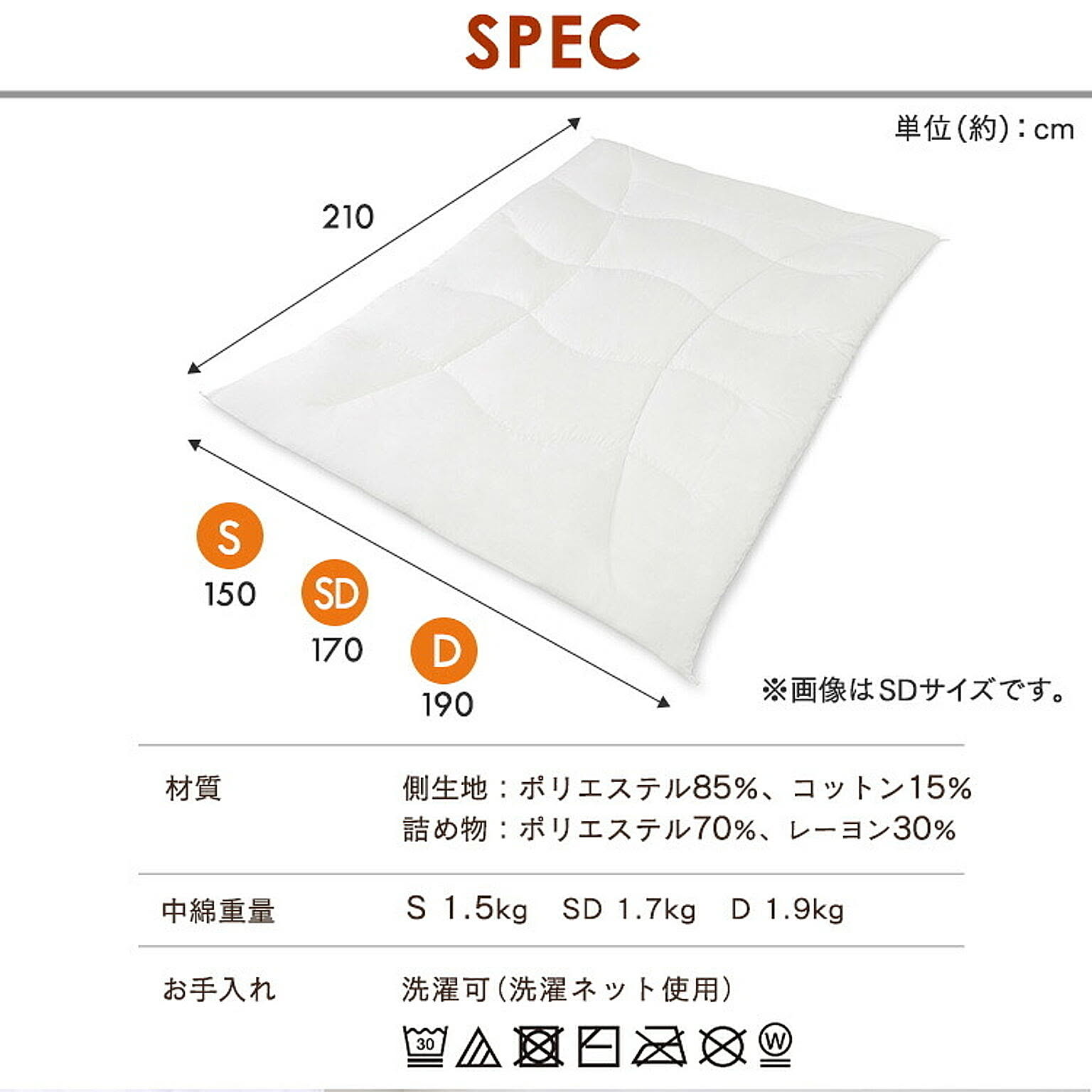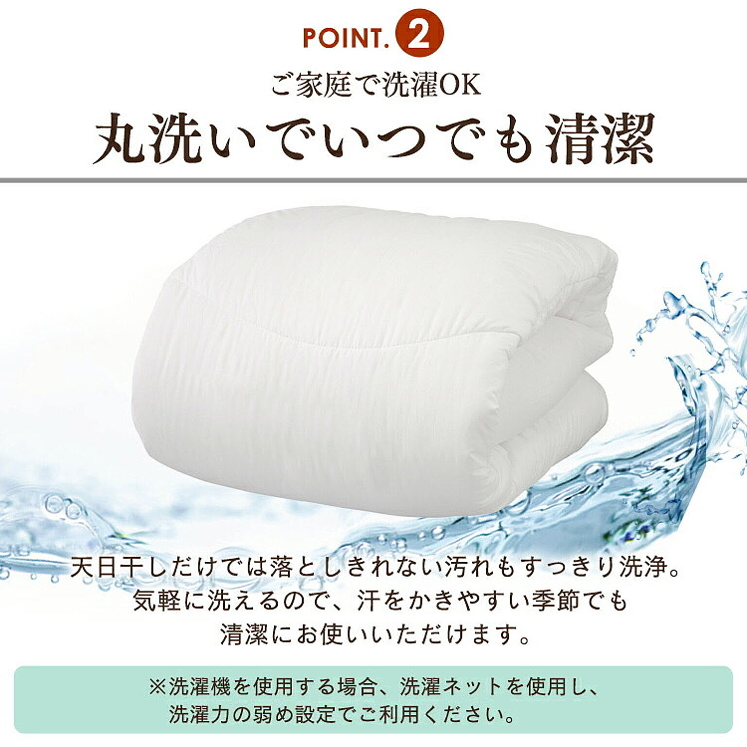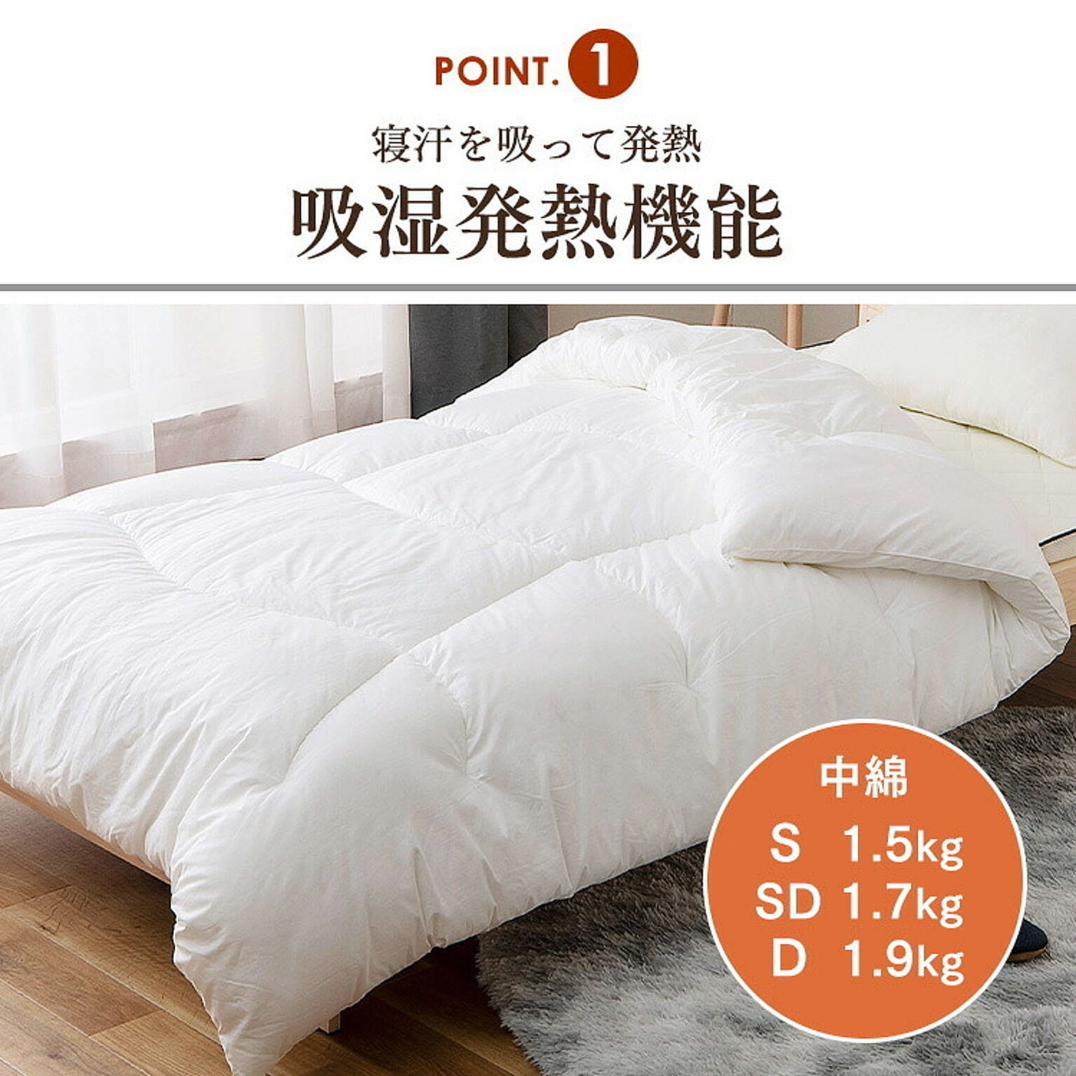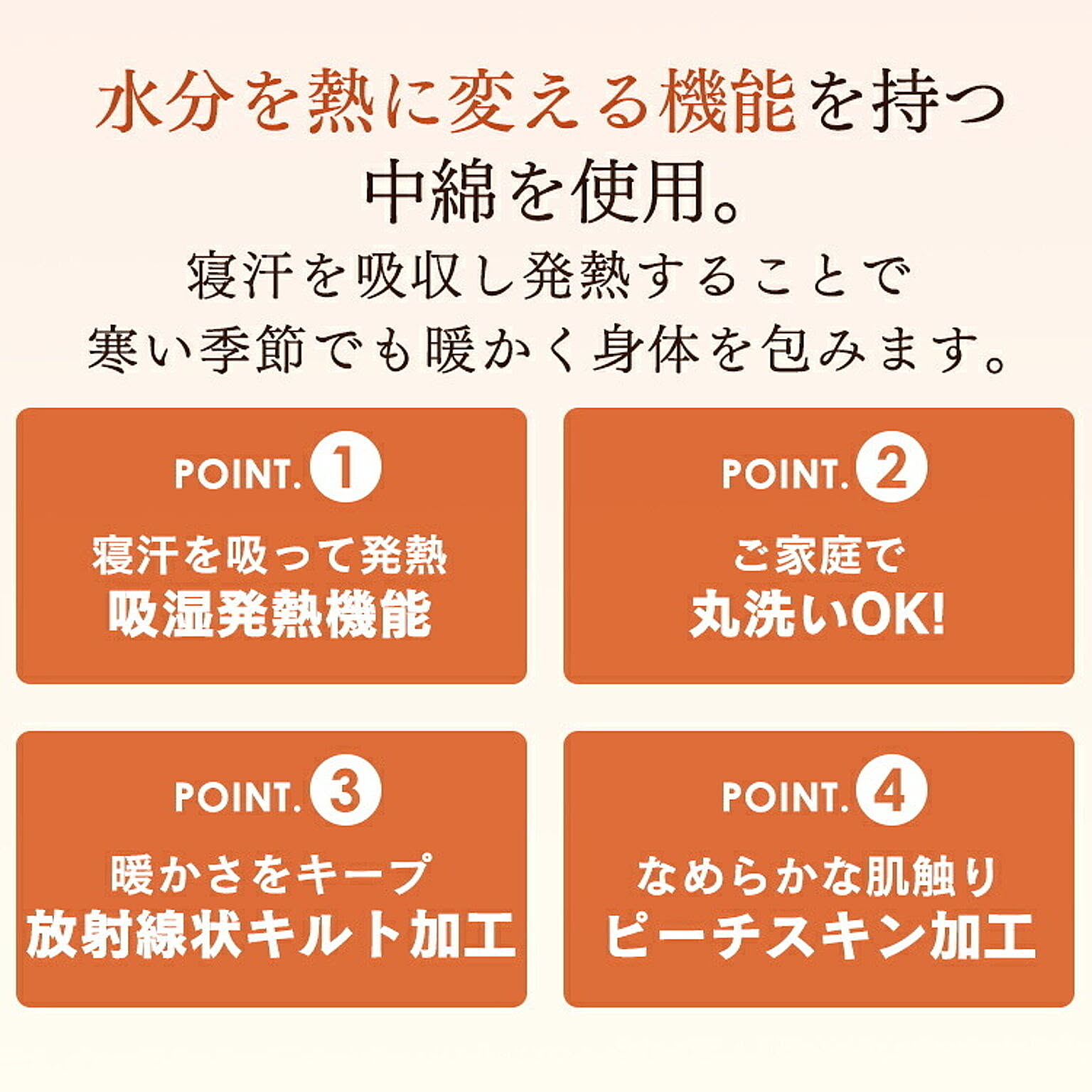 体から発散される水分を熱に変える保温性の高い掛けふとんです。寝汗を吸って発熱、吸湿発熱機能。中綿には水分を吸収し熱に変える、吸湿発熱素材を採用。こもりがちな湿気を熱に変換し、寒い季節でも暖かく快適に過ごせます。ご家庭の洗濯機で丸洗いOK!天日干しだけでは落としきれない汚れもすっきり洗浄。自宅で洗えるので、いつでも清潔にお使いいただけます。※洗濯機を使用する場合、洗濯ネットを使用し、洗濯力の弱め設定でご利用ください。湿気を効率よく熱に変換する放射線状キルト加工を採用。6ヶ所のループ付きでカバーもずれにくい。便利な収納袋付き。使わないときはくるっと丸めて専用の収納袋へ。●商品サイズ(cm)幅約170×奥行約210●充填量約1700g●材質側生地:ポリエステル85%、コットン15%詰め物:ポリエステル70%、レーヨン30%側生地加工:ピーチスキン●洗濯表示本製品は丸洗いできますが、洗濯機を使用する場合、洗濯ネットを使用し、洗濯力の弱め設定で洗ってください。